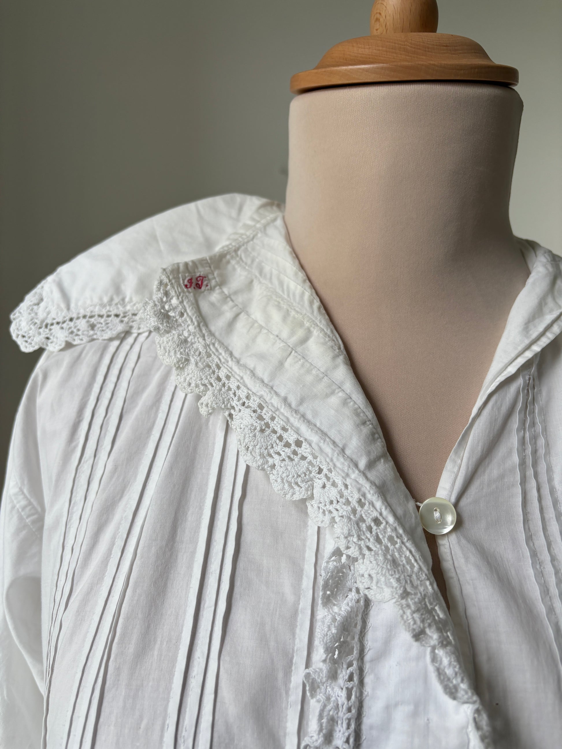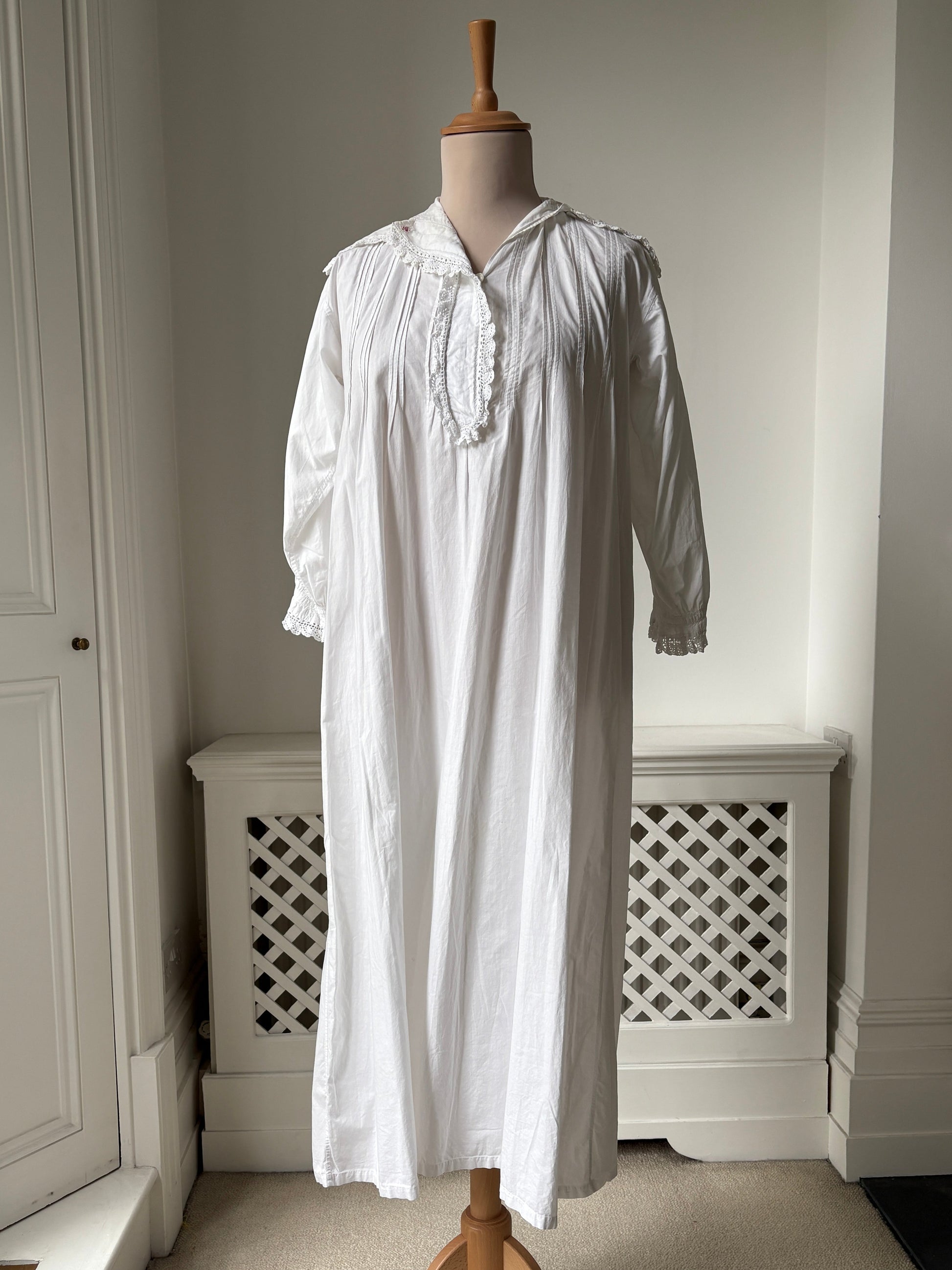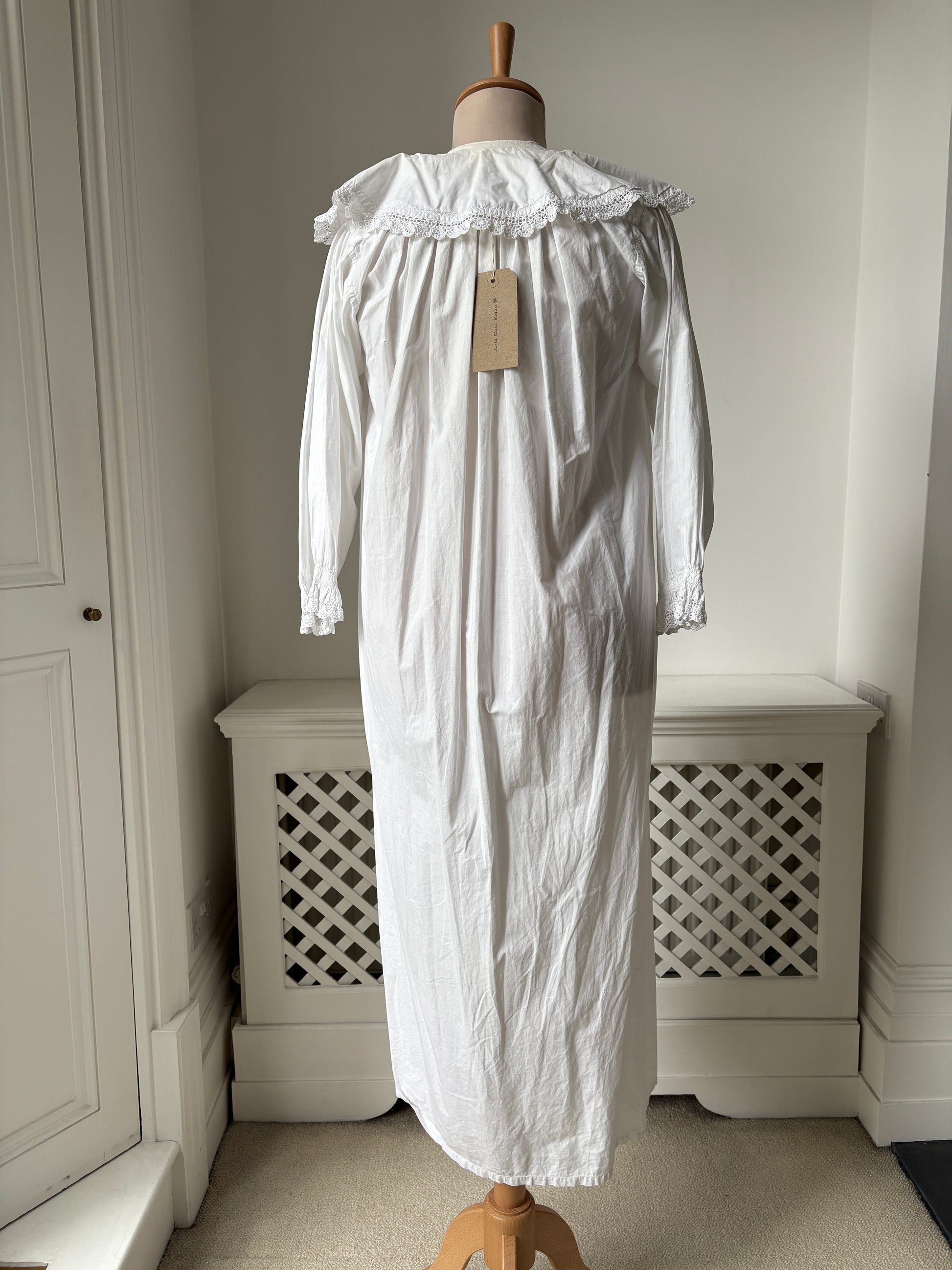 A traditional Victorian cotton nightdress, perfect worn as either a day dress or as nightwear. This piece has a loose, smock-like shape with fine pintucking at the bust and a wide collar trimmed with crochet lace. It features a classic bib-style button-down front, fastening with two original cloth-covered buttons. Crafted from medium-weight white cotton, it also has the owner’s original initials stitched neatly into the inside of the collar.