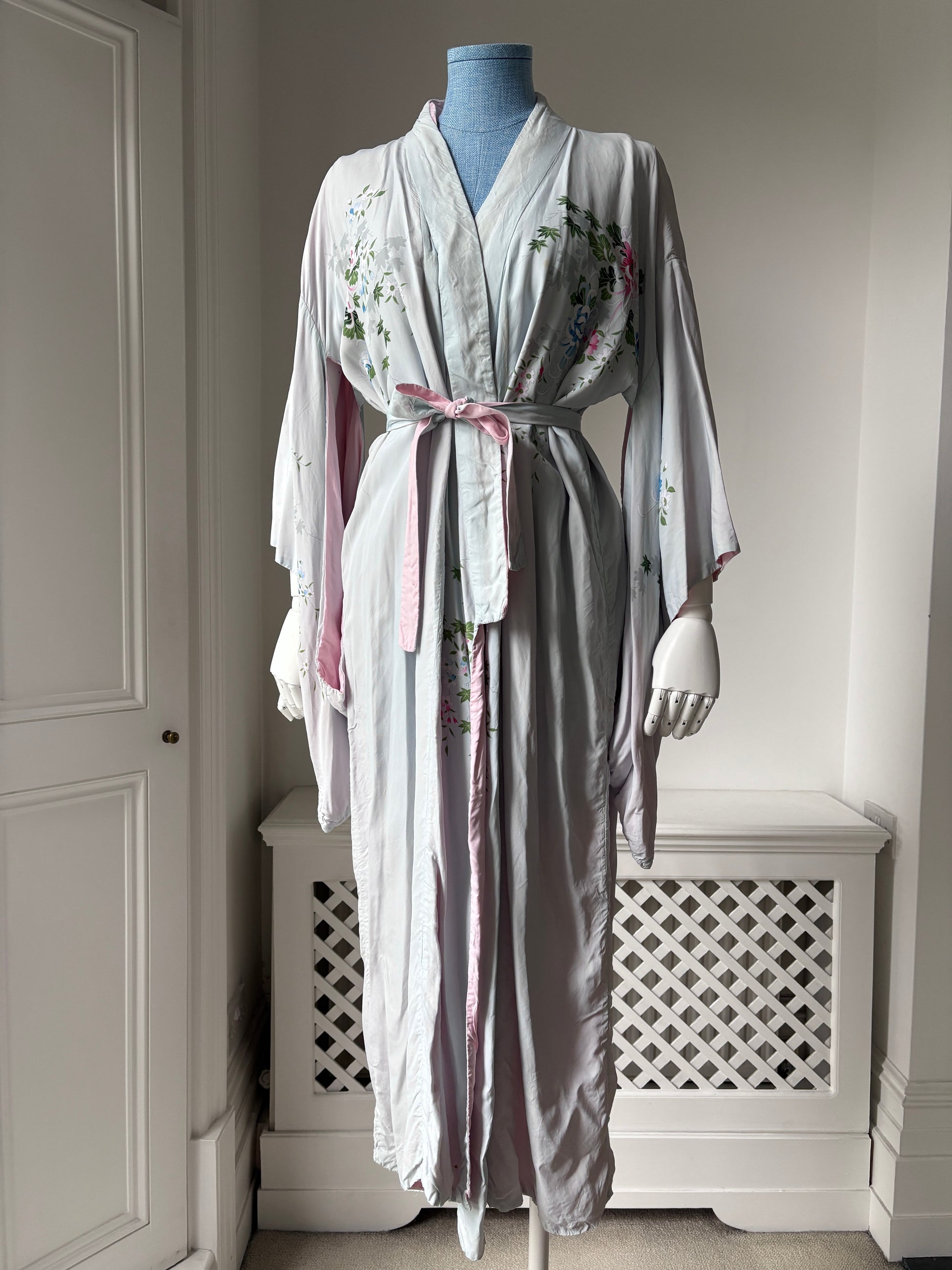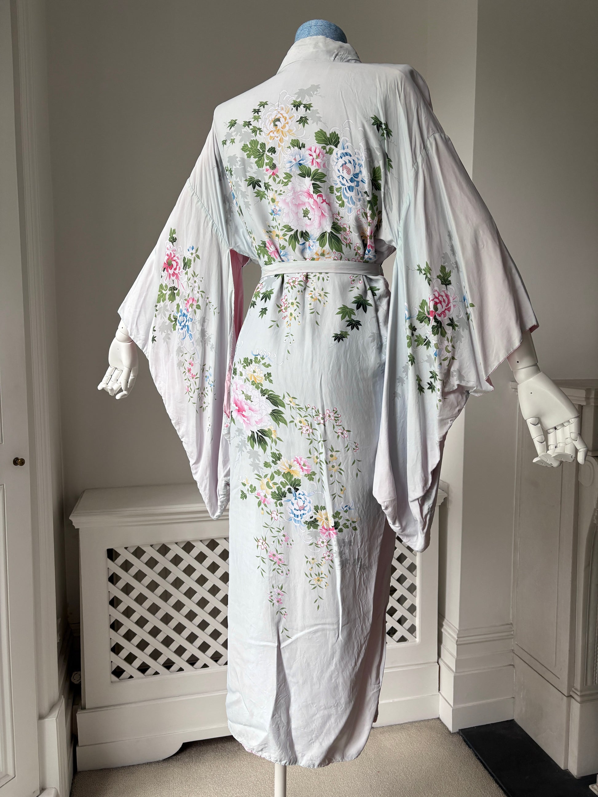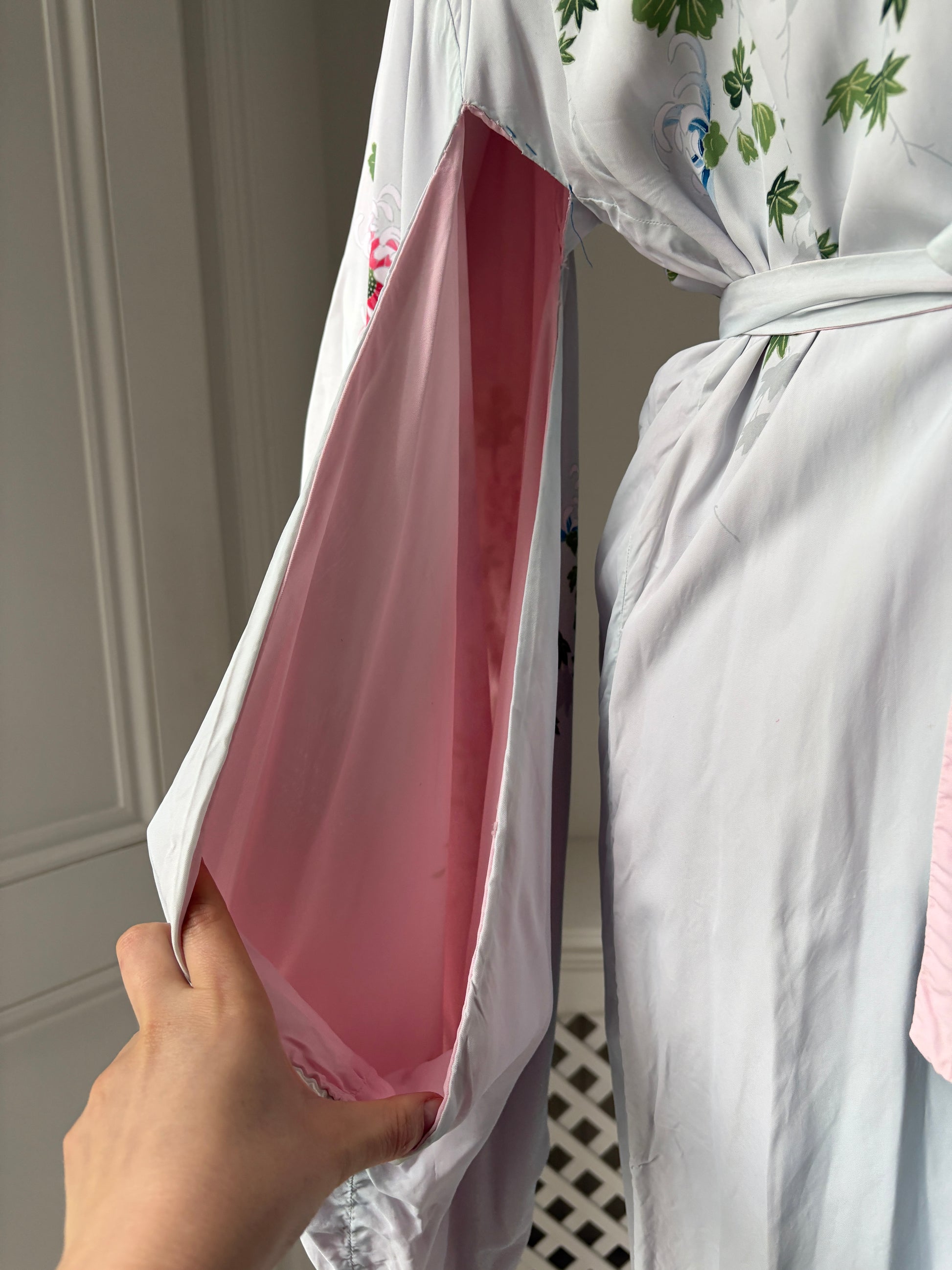 Bought from the original owner, this gorgeous kimono-style housecoat dates from the 1970s. Made from what feels like a heavier rayon with a soft drape, it features a baby blue outer and a baby pink inner. The piece is completely open at the front, with traditional dipped sleeves, a matching belt, and a beautiful printed design across both the front and back. No labels are present.