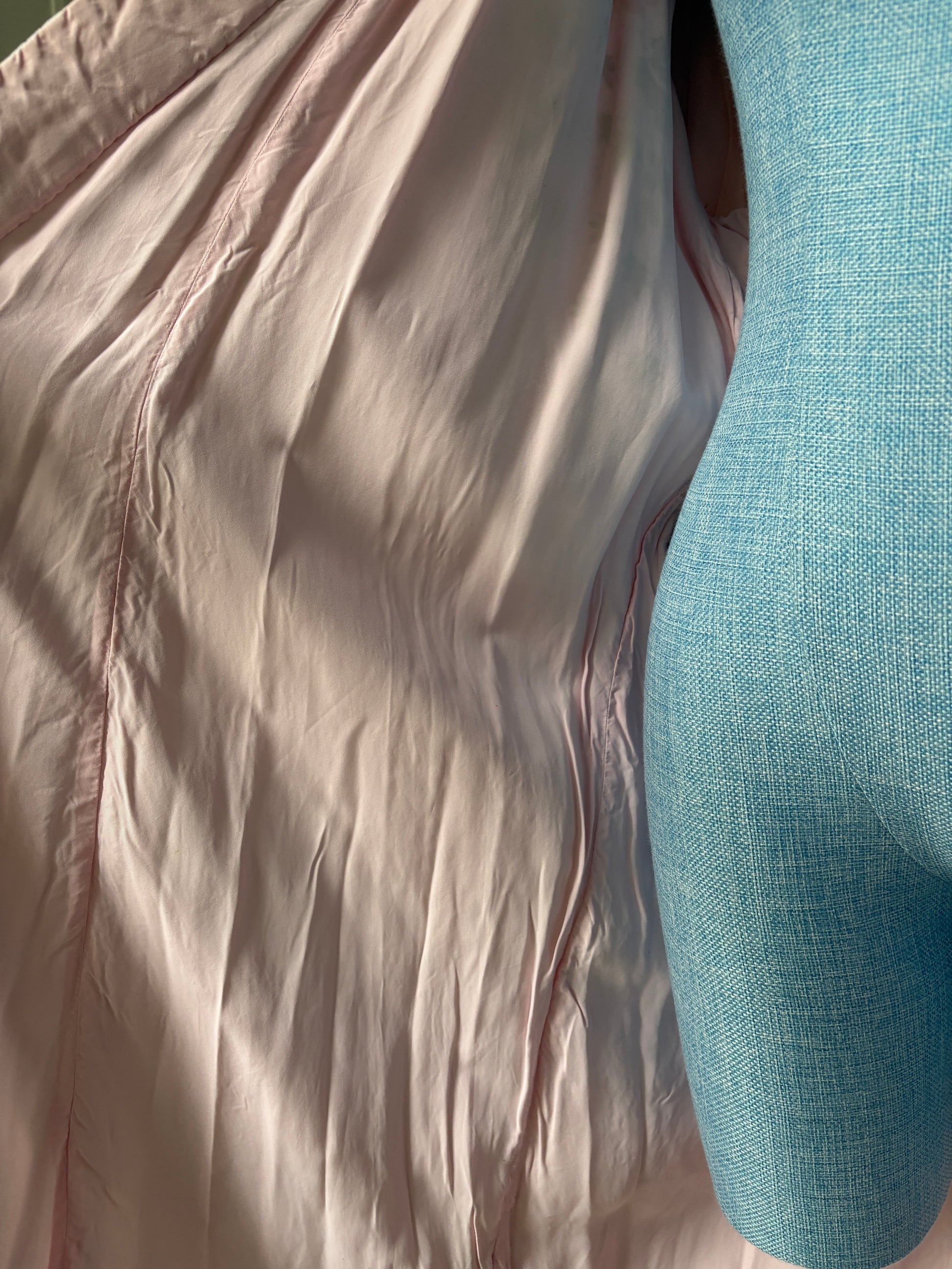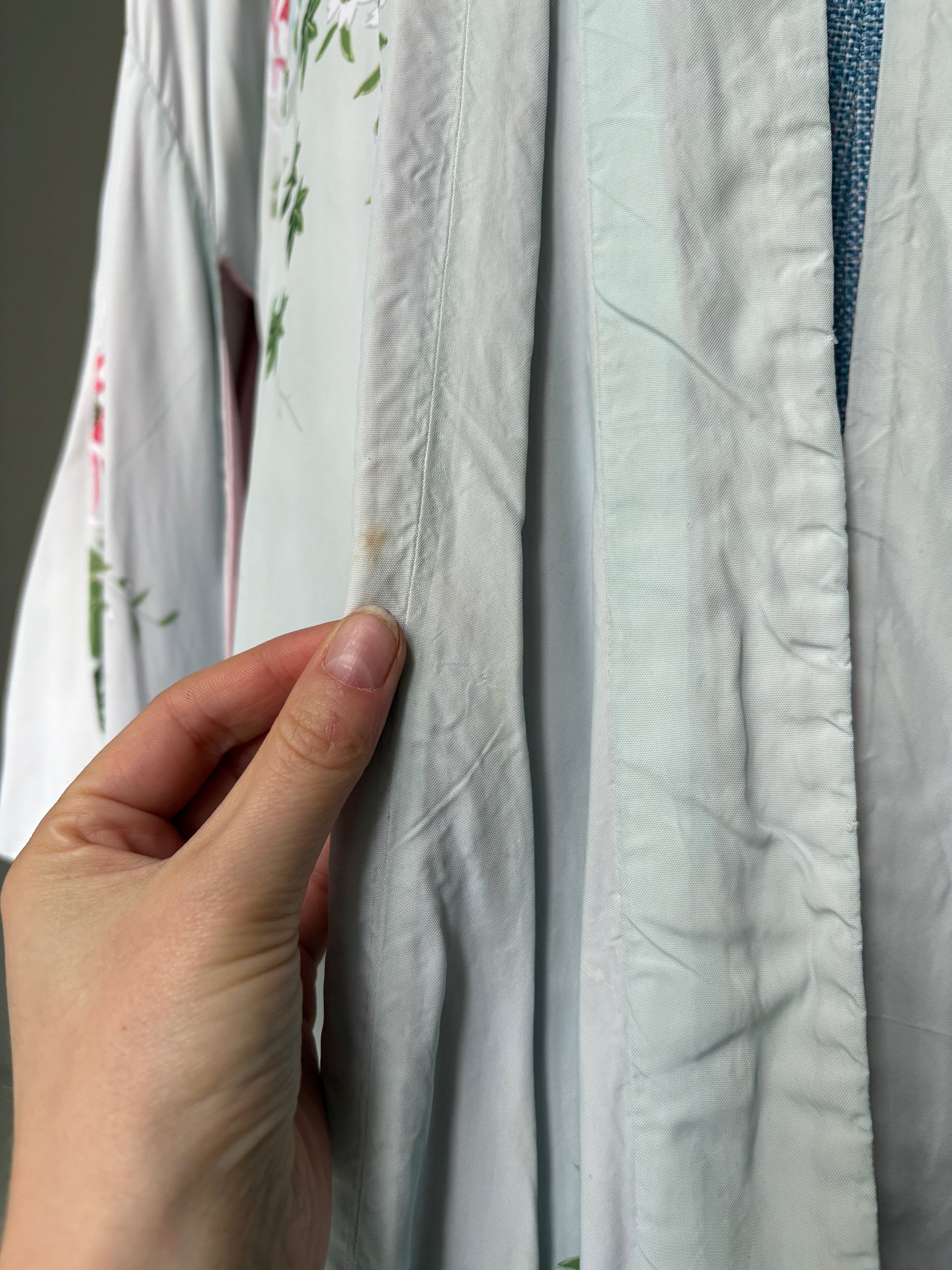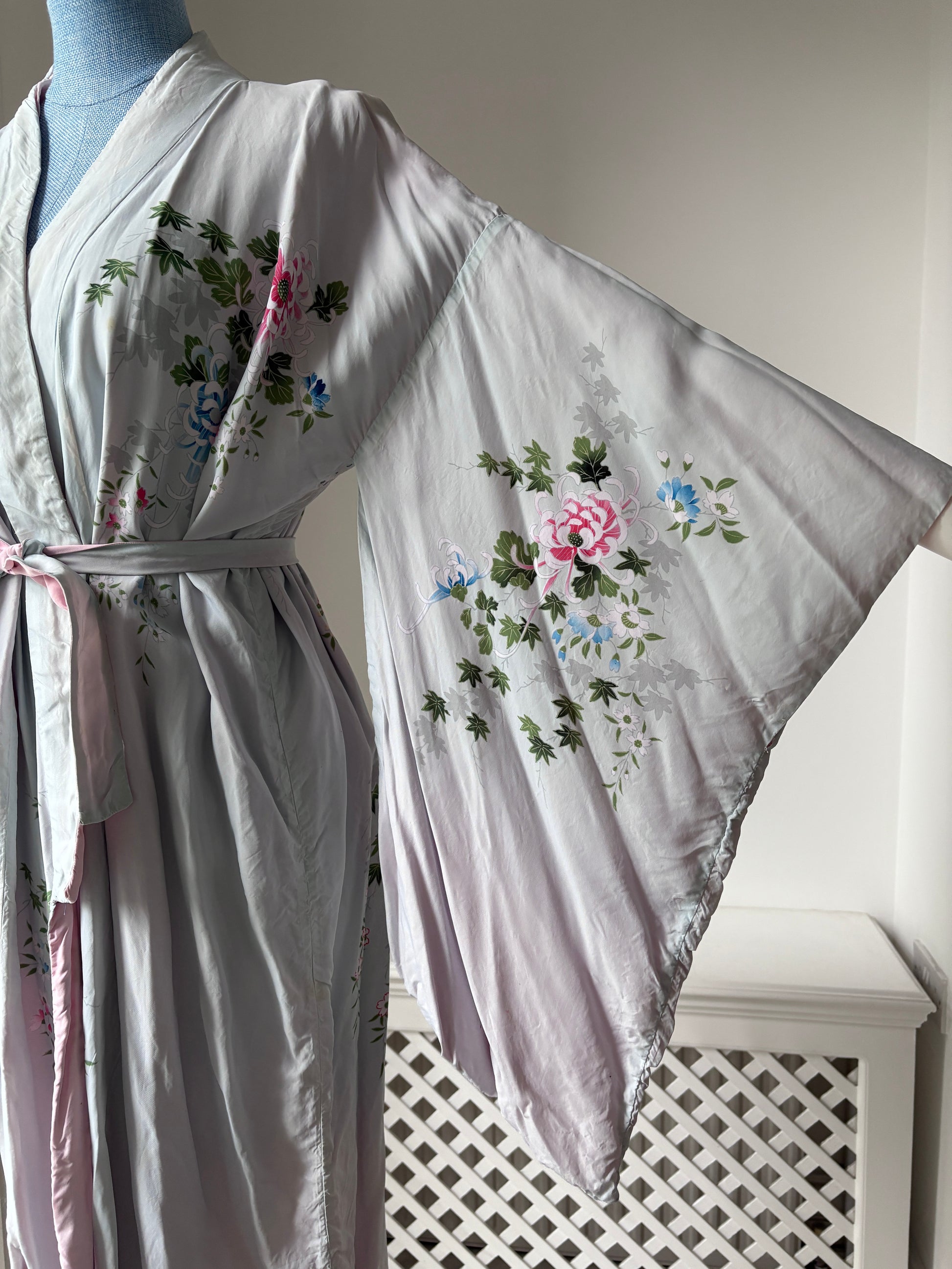 Bought from the original owner, this gorgeous kimono-style housecoat dates from the 1970s. Made from what feels like a heavier rayon with a soft drape, it features a baby blue outer and a baby pink inner. The piece is completely open at the front, with traditional dipped sleeves, a matching belt, and a beautiful printed design across both the front and back. No labels are present.