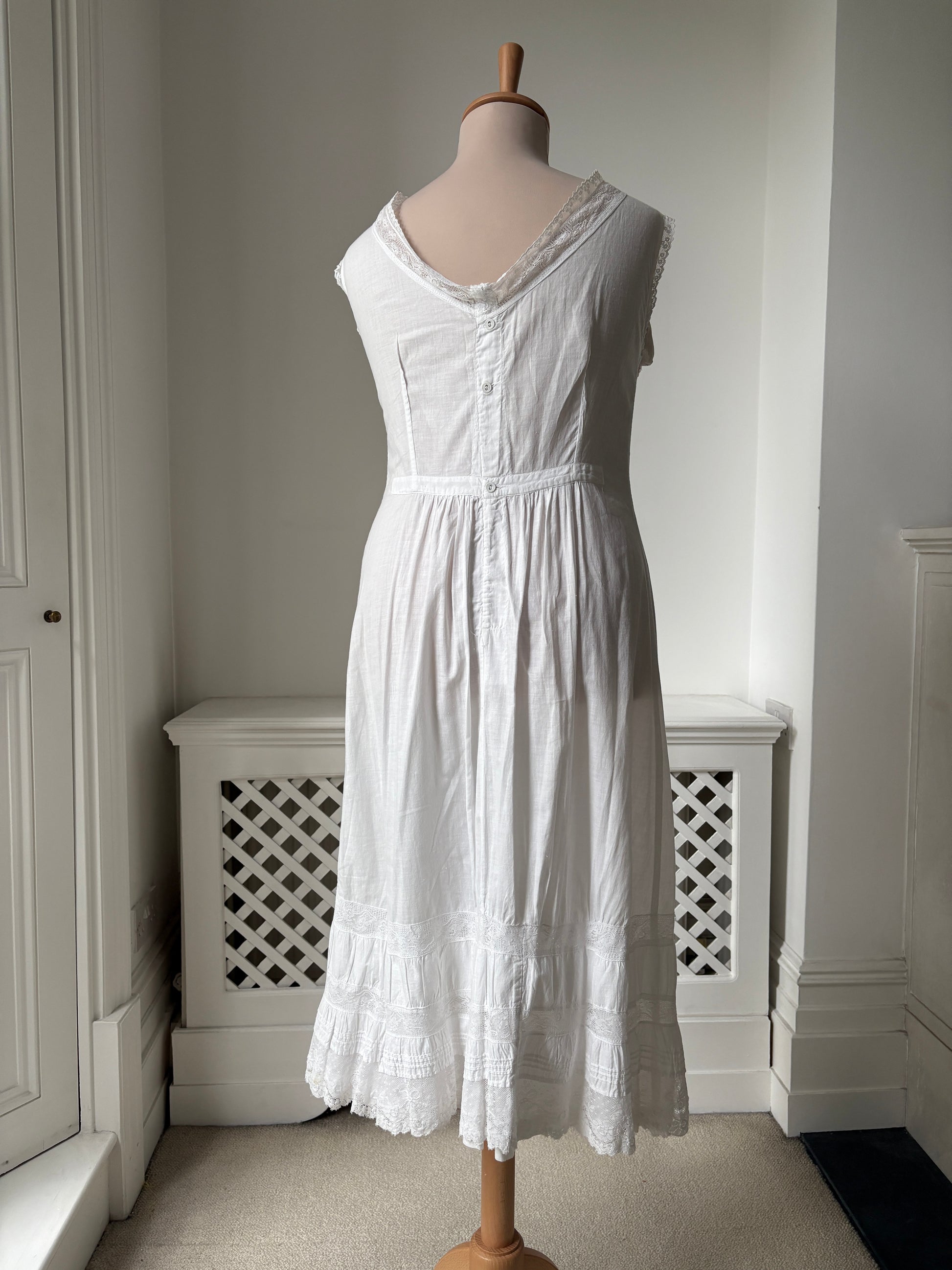 An utterly darling Edwardian nightdress, perfect worn as either a day dress or traditional nightwear. This piece has a loose, smock-like shape with finely detailed lace panelwork at the neck and bust. The hem echoes this design, featuring alternating stripes of delicate lace. Crafted from very lightweight, semi-sheer lawn cotton, it has a beautifully airy quality. Two fine French seams run down the skirt to give shape. At the back, there is a placket finished with hand-stitched herringbone detail and three original covered buttons, though it has since been sewn down so the piece now slips on easily over the head.