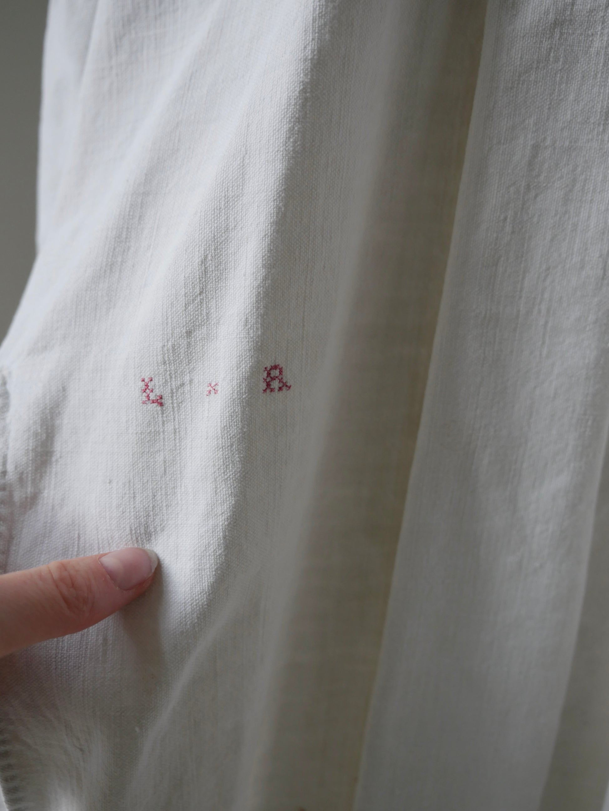 A fabulous and beautifully made traditional French worker’s smock, crafted from a thick linen and cotton blend. It features long sleeves, slits up each side, a grandad collar, and neat pleating through the body. At the hip, the initials “L” and “R” are embroidered, the original owner’s monogram.