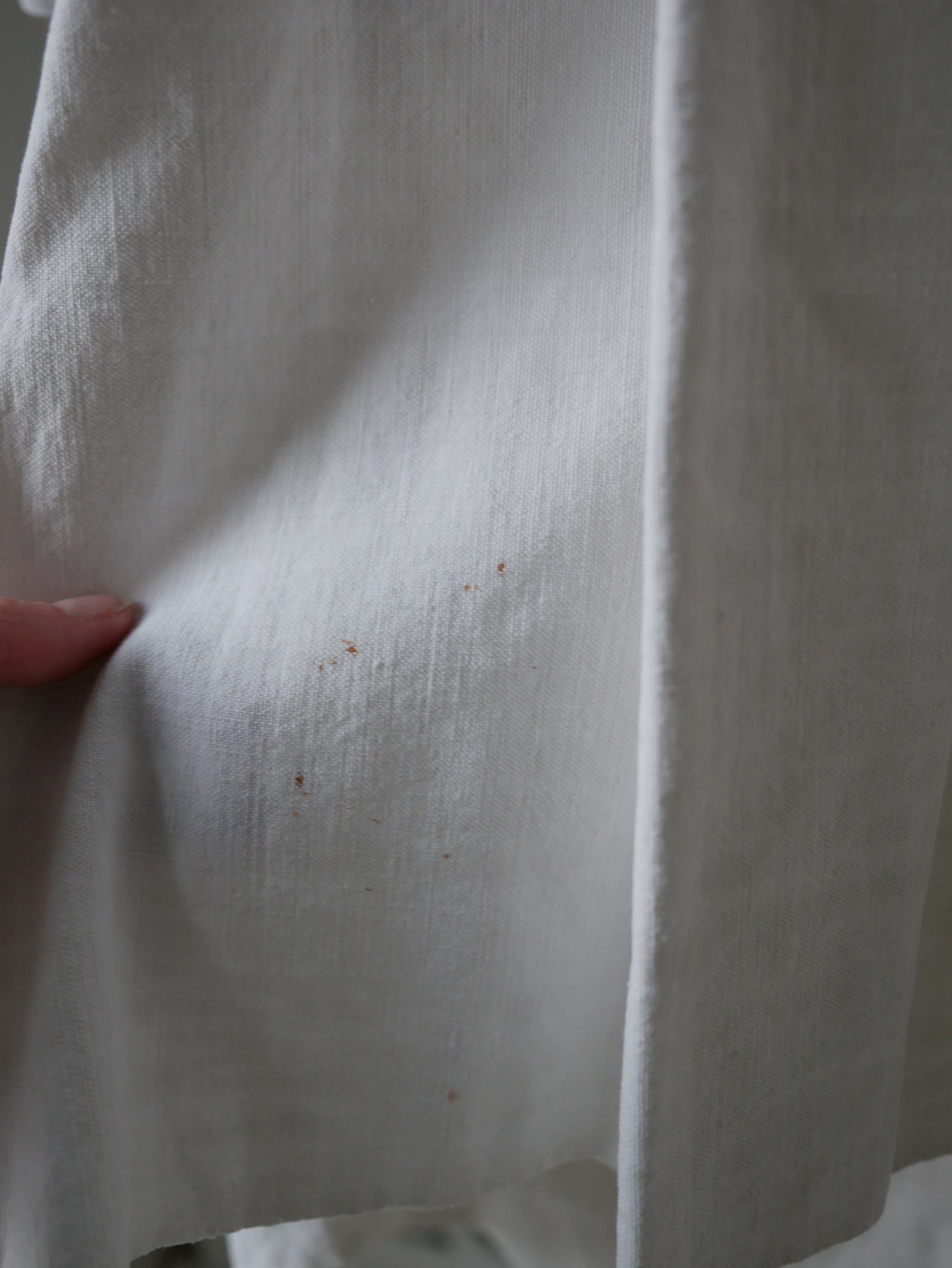 Condition: Very good for its age. The bottom button is missing, and the top button is a more modern replacement. There is some speckled rust marking at the lower left hem, along with two additional marks that have not lifted with treatment.