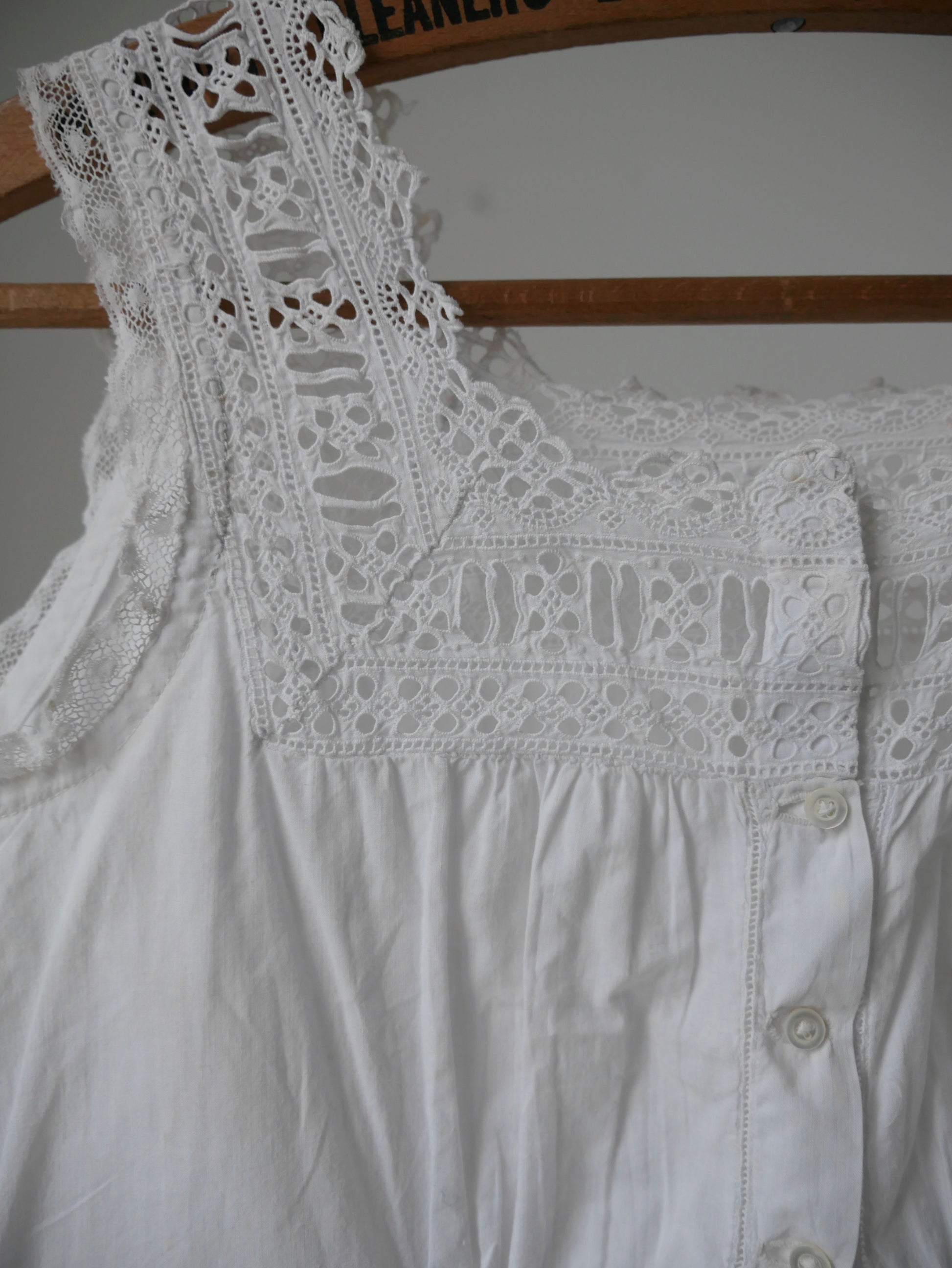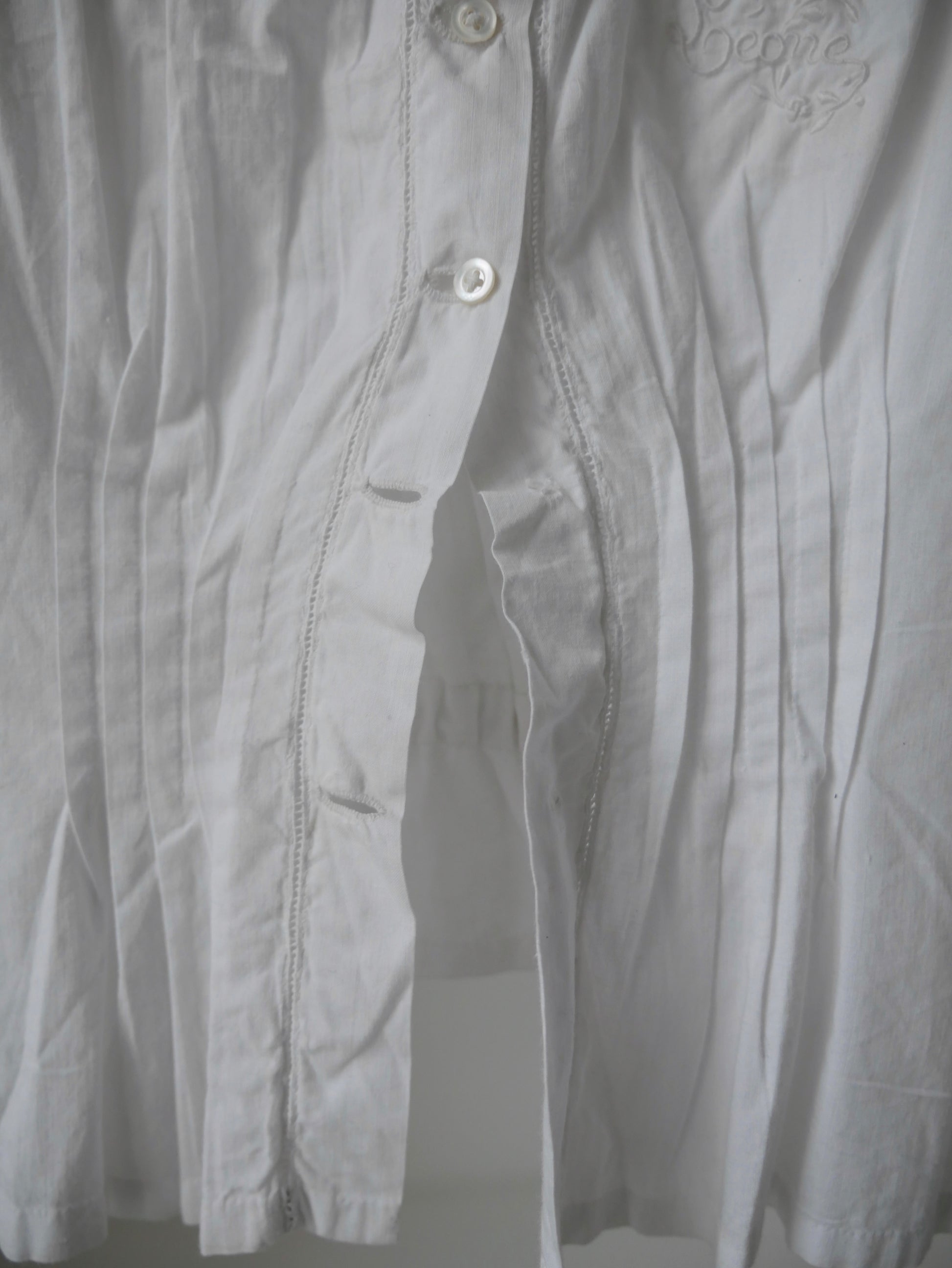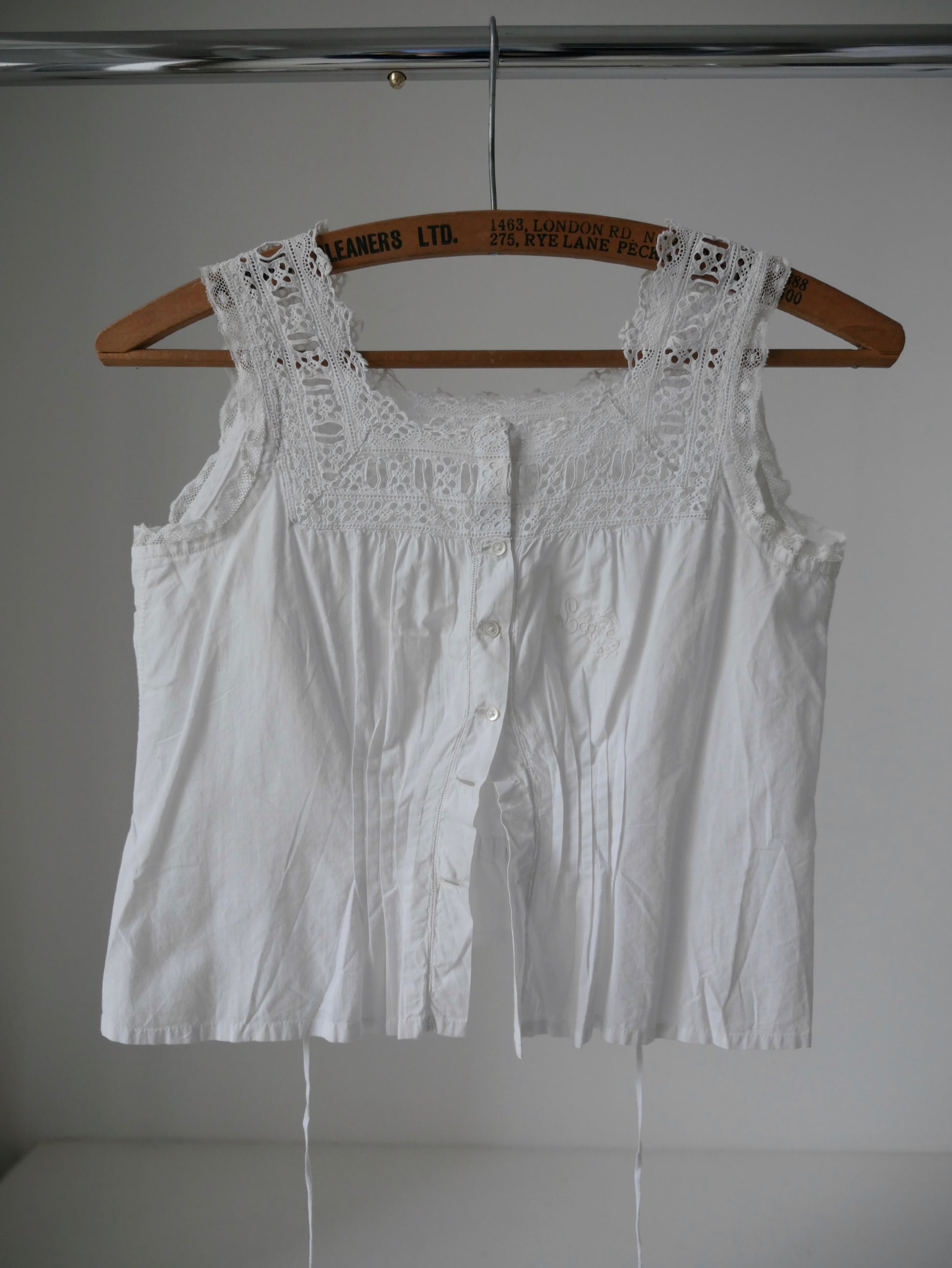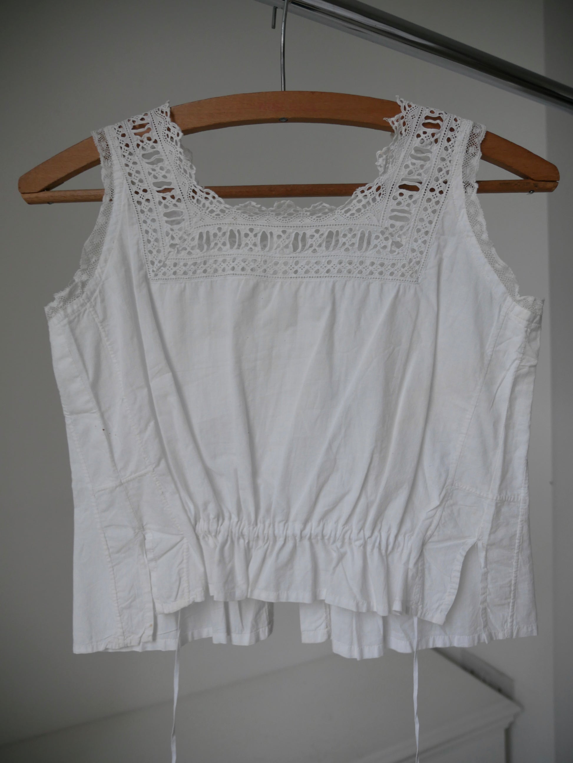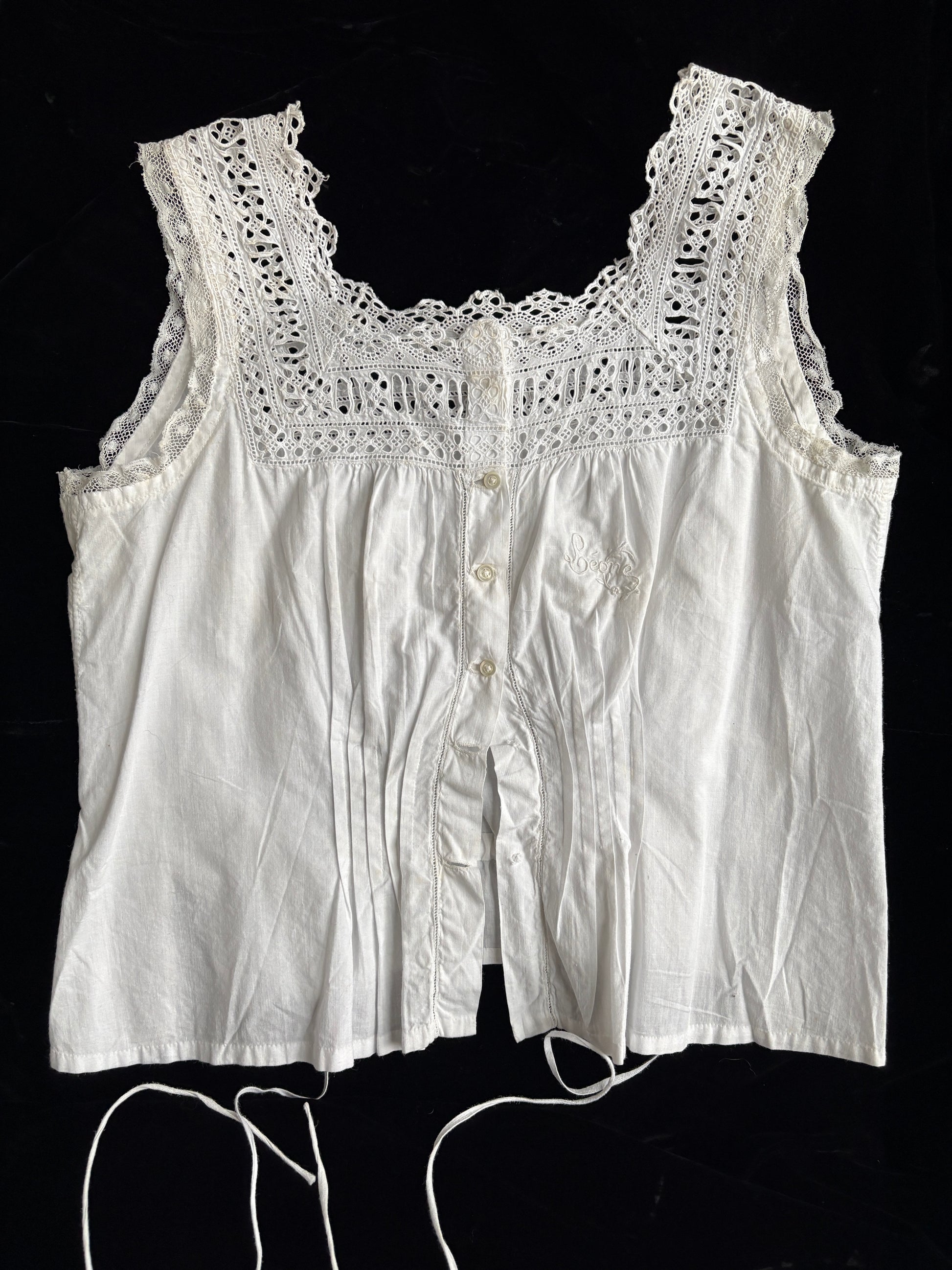 A lovely Edwardian corset cover made from lightweight white cotton, once owned by Léonie, whose name is embroidered across the bust. This is a smaller corset cover, likely made for a teen or young woman. It features fine pin-tucking, embroidered details, and openwork designed for threading ribbon.
