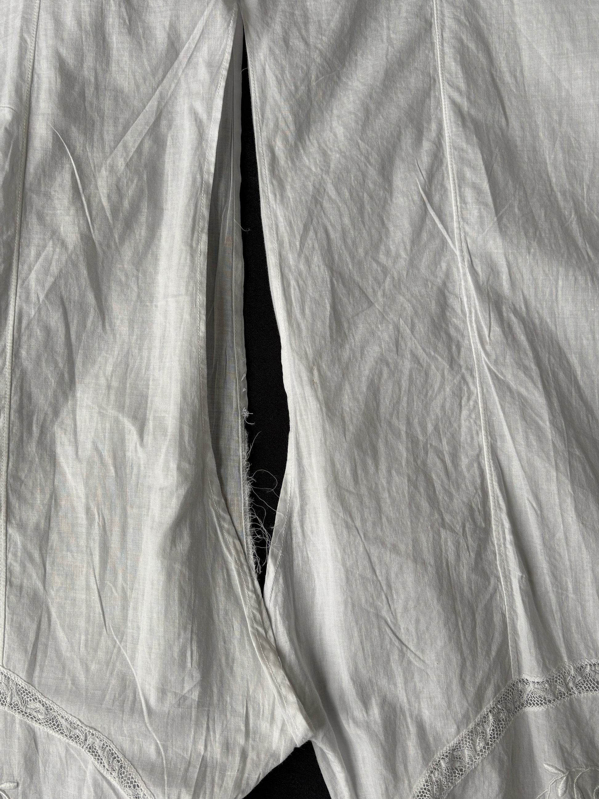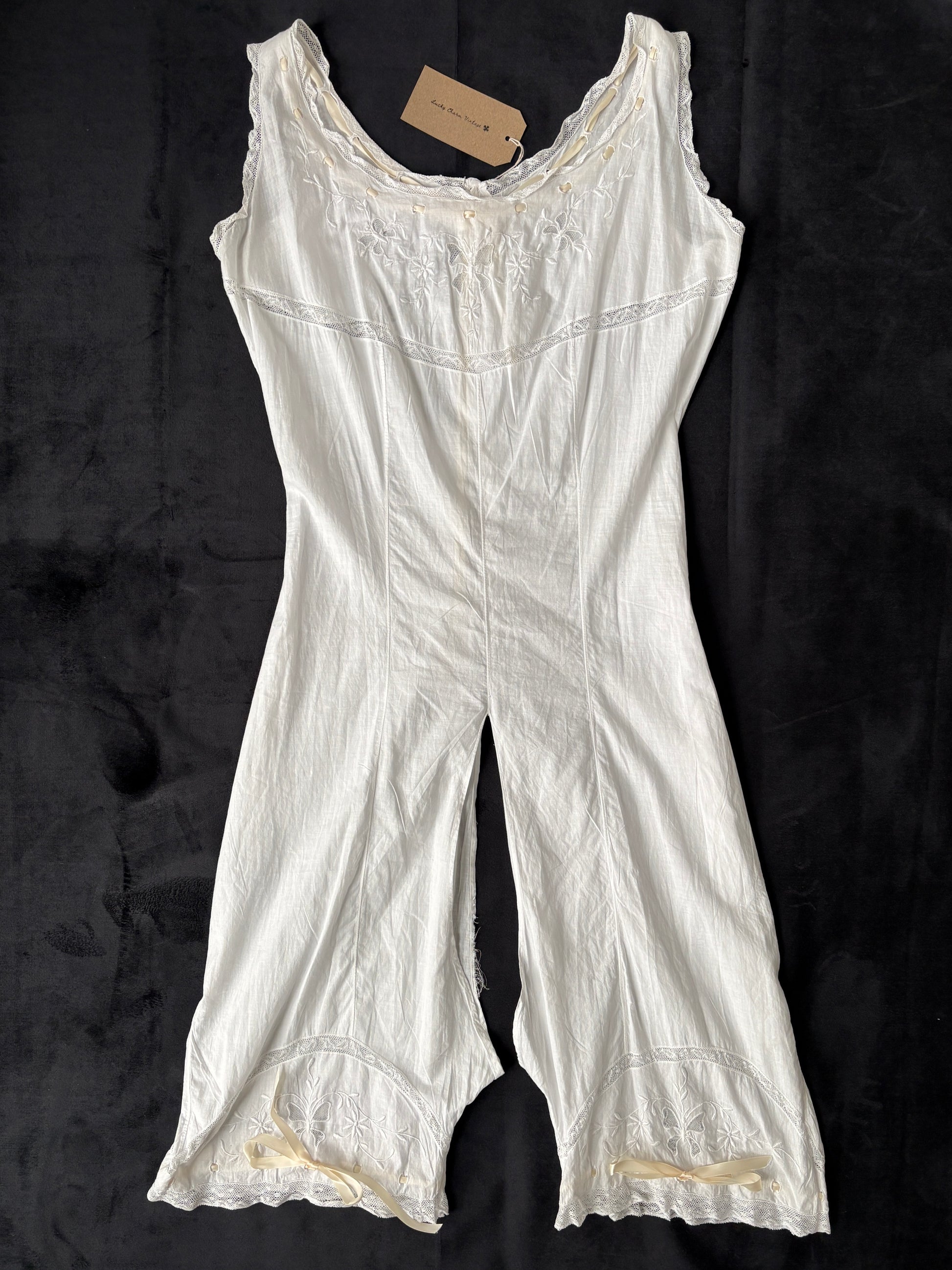 The crotch is open to around mid-thigh, as typical of the period. The neckline is rounded and threaded with ribbon, with a delicate butterfly motif that is also is repeated on the legs. Sheer lace trim finishes the bust and sleeves and is echoed again at the cuffs, where ribbon is also laced through. A special and well-preserved example of early 20th-century lingerie.
