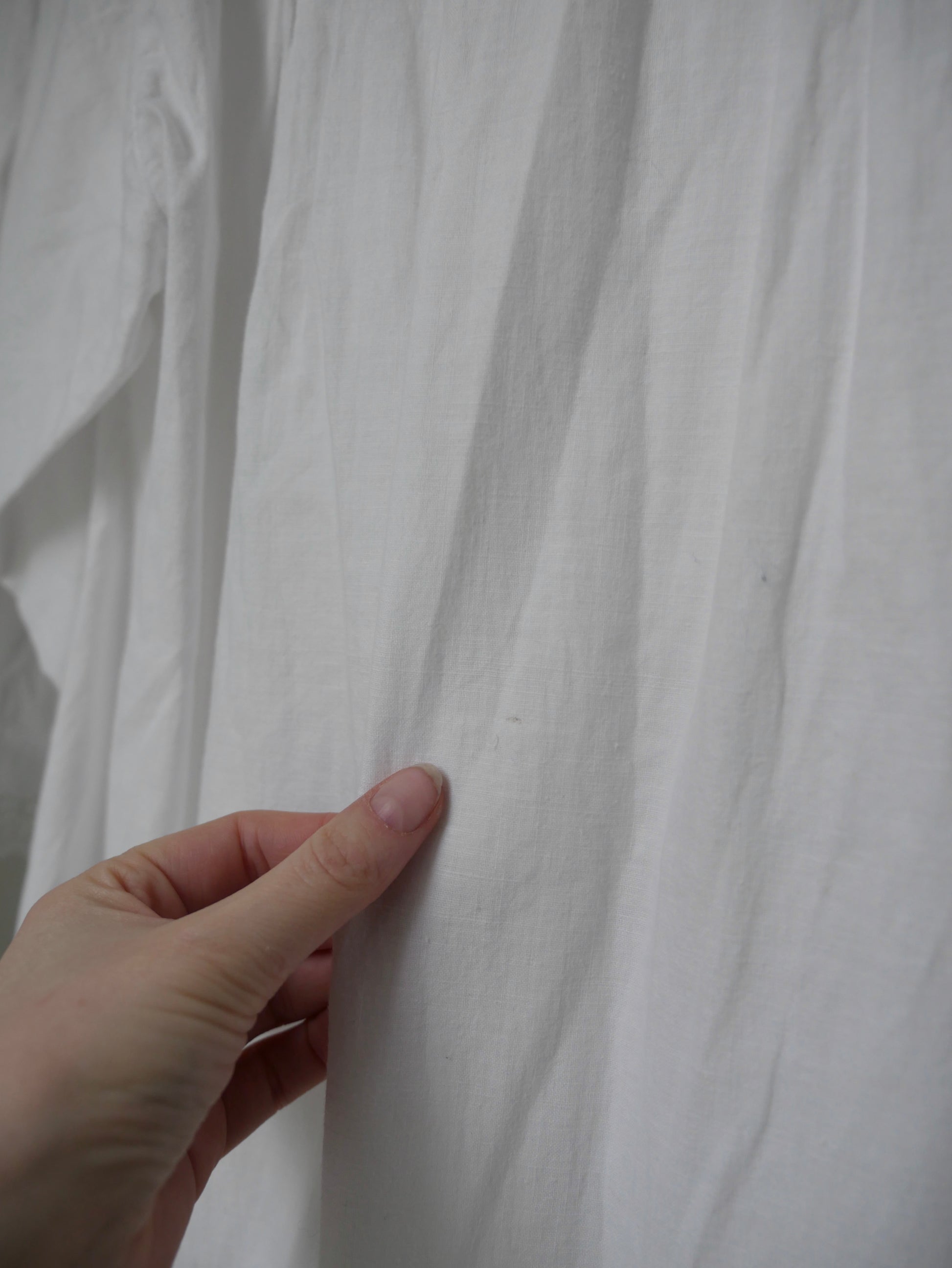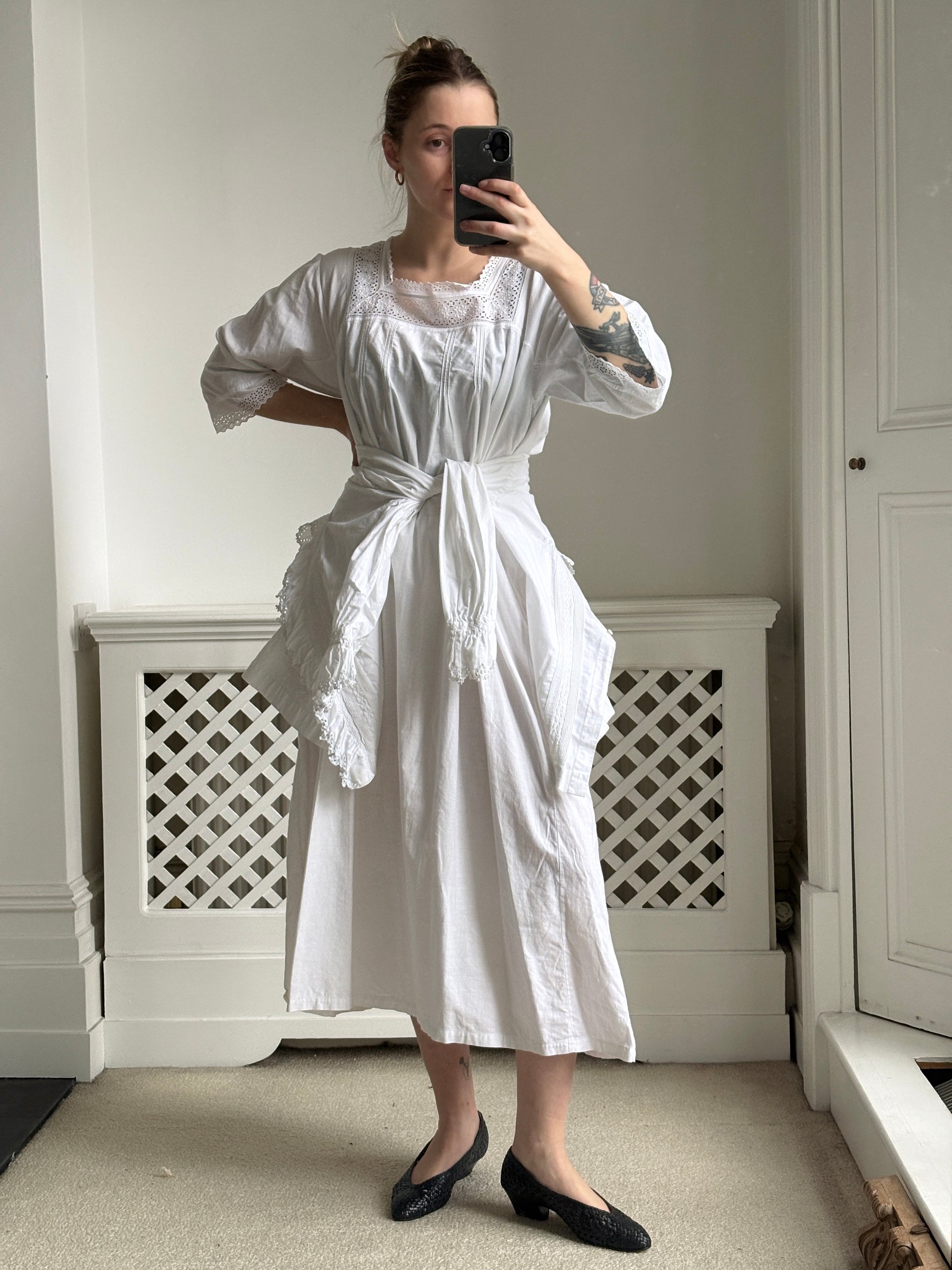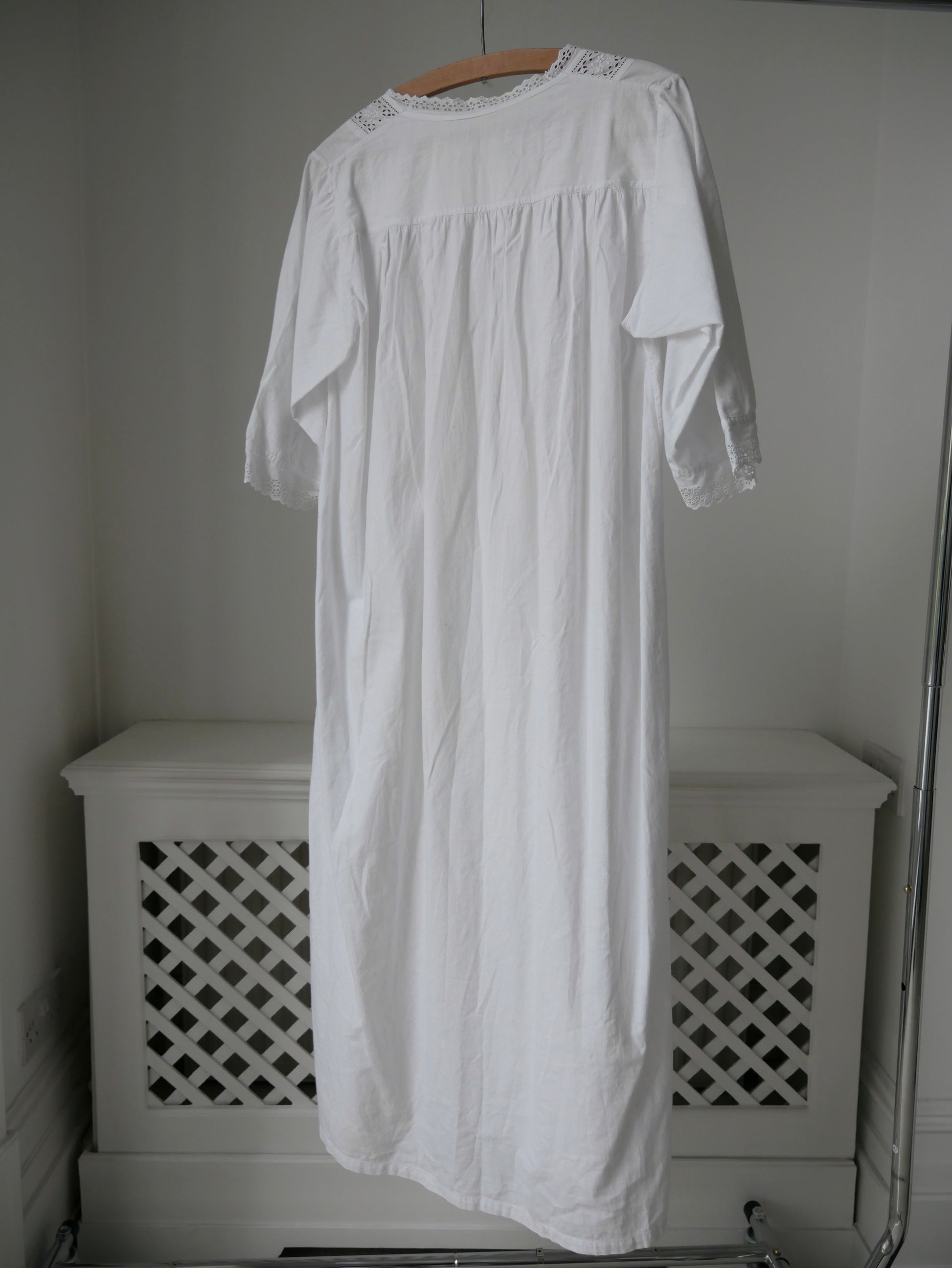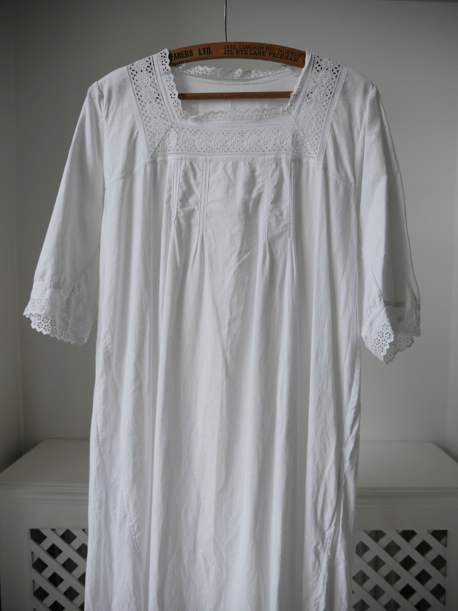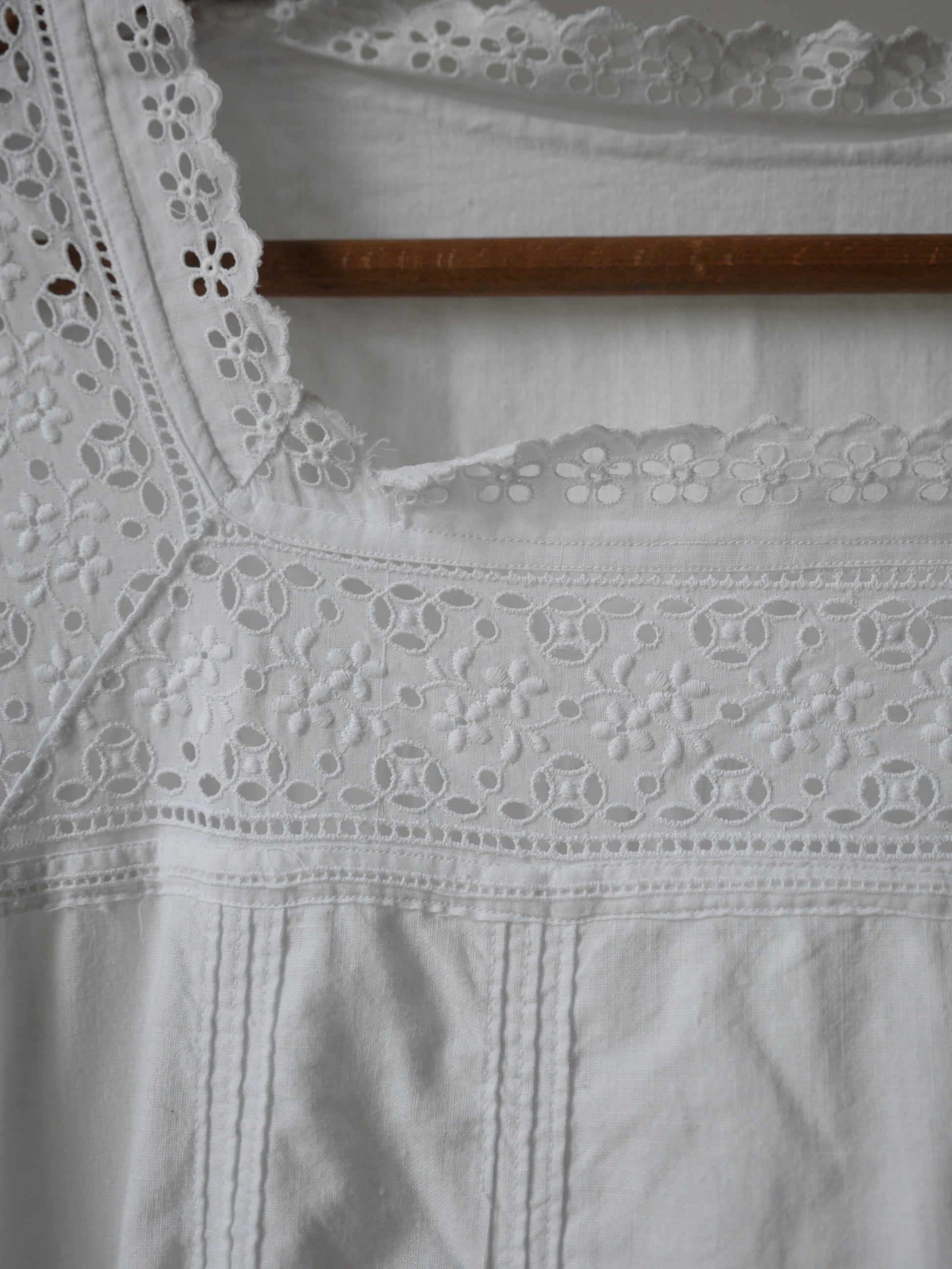 A very lightweight antique nightdress dating from the 1910s to 1920s, made from fine white cotton. It has a loose, slightly A-line silhouette with a square neckline and short sleeves. An embroidered panel with openwork detail sits at the neckline and is repeated at the cuffs. Pin-tucking at the bust adds gentle shape. Extremely light and easy to wear.