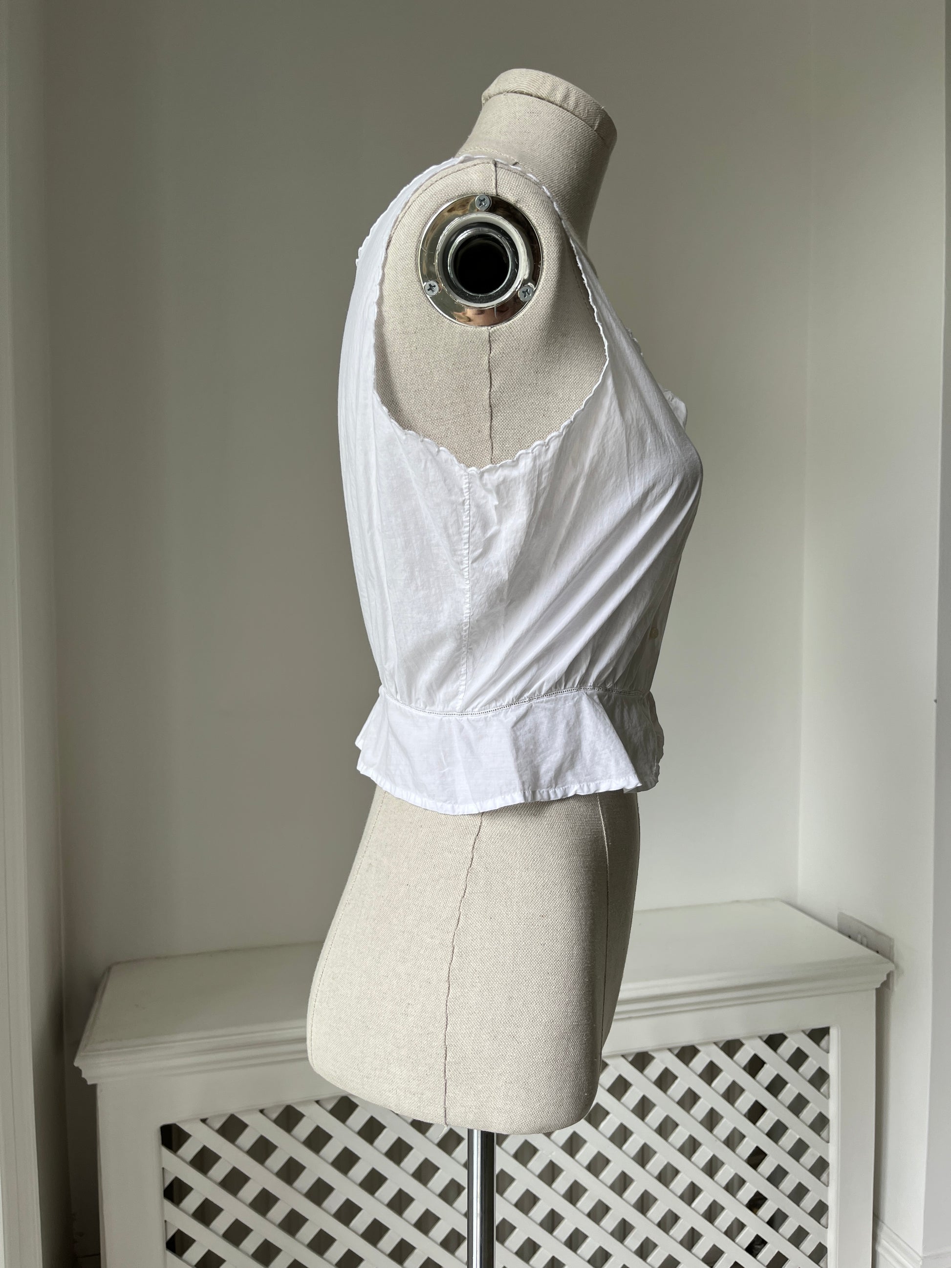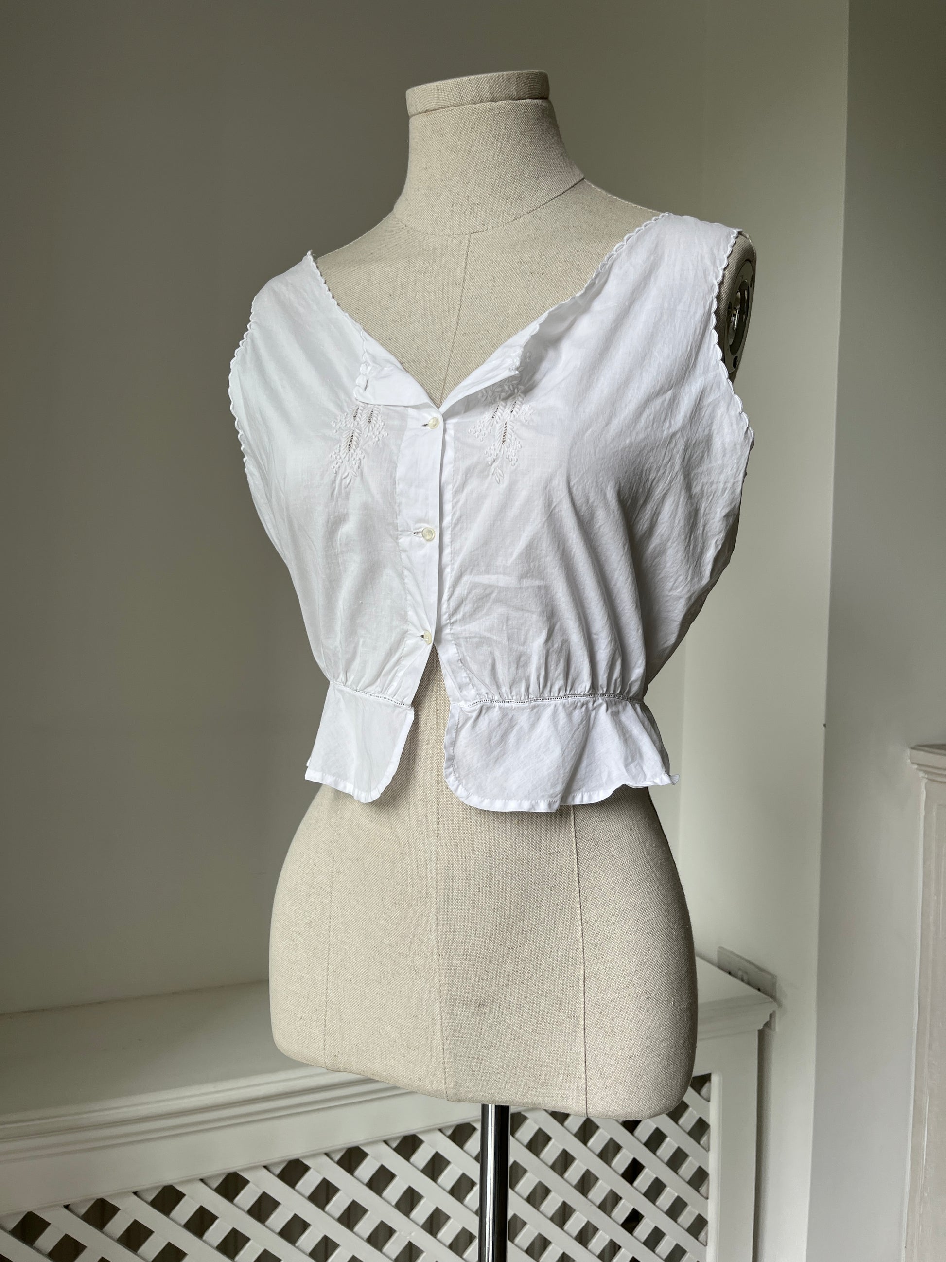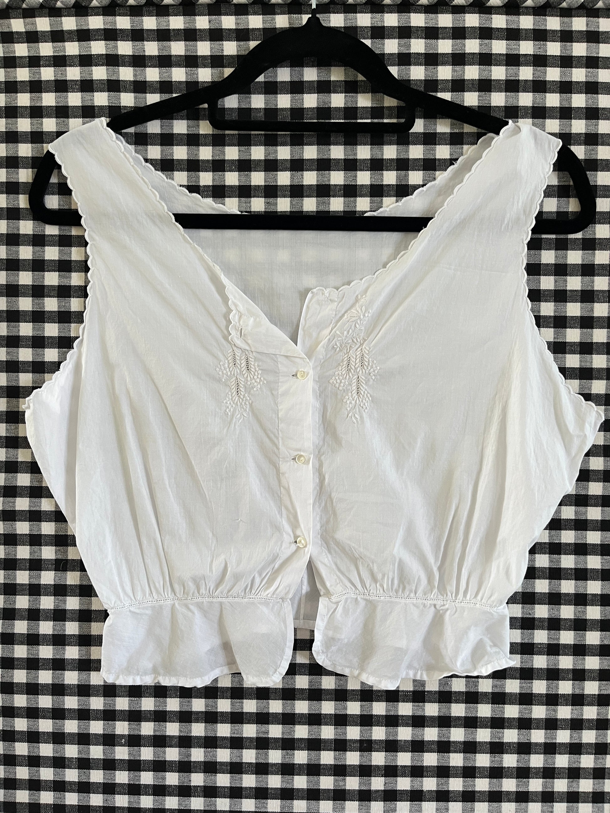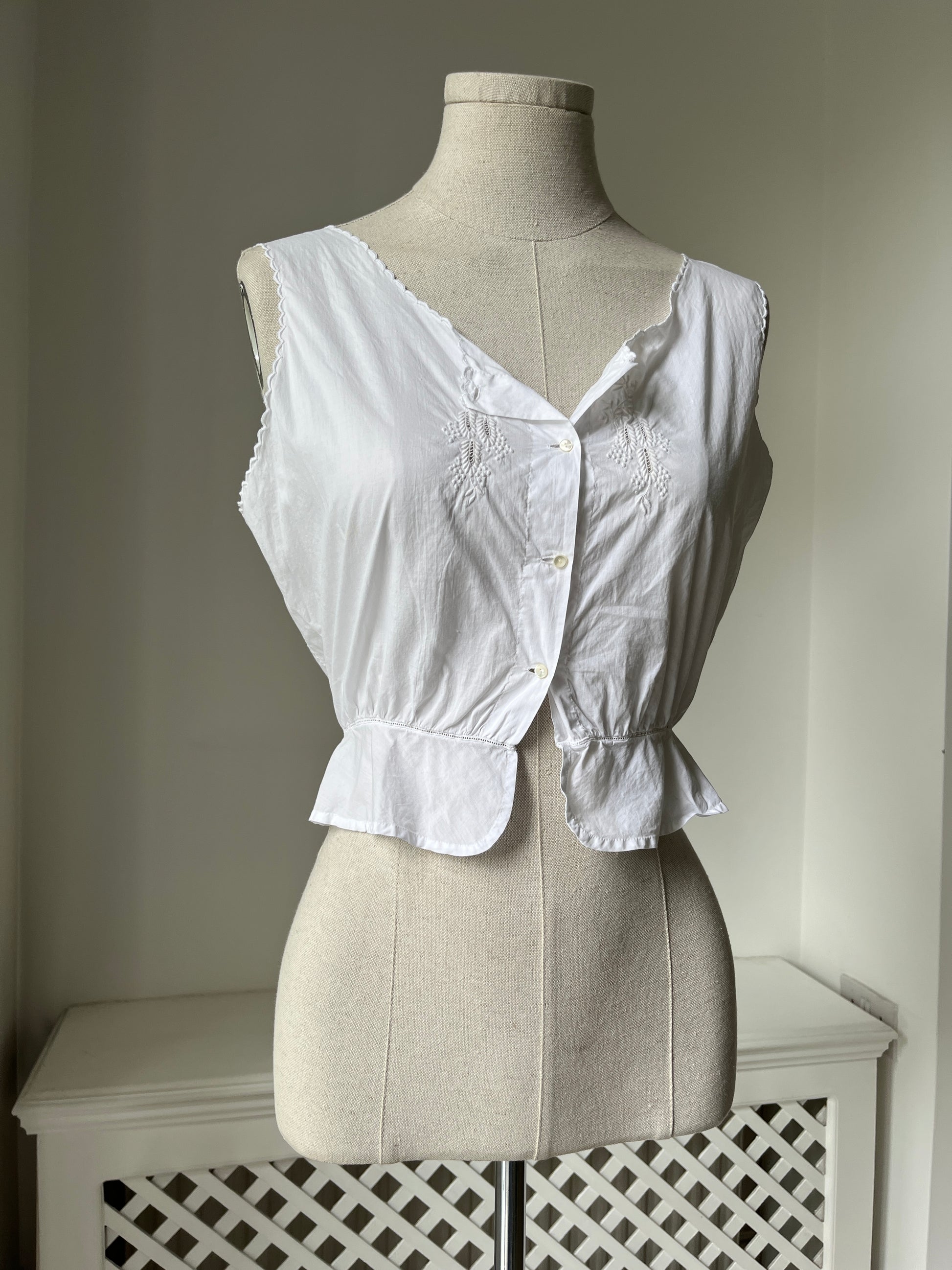 A lovely Edwardian corset cover featuring what appears to be beautifully embroidered wisteria branches on each bust—truly exquisite craftsmanship. It’s cut in a classic shape with a wider bust, scooped neckline, and cinched waist. It buttons down the front with three original buttons. The neckline and sleeves are delicately scalloped, and the hem is slightly curved in a soft peplum style.
