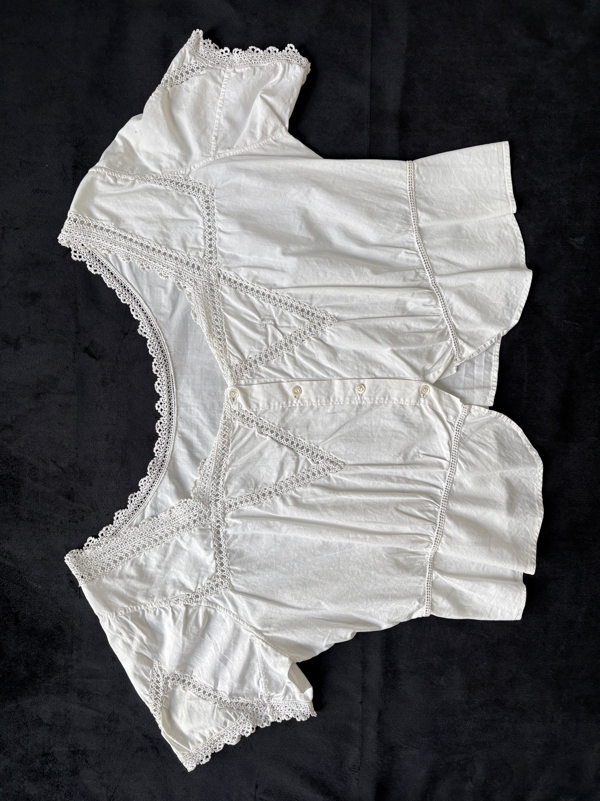 An Edwardian corset cover with short sleeves and openwork crochet detailing. It fastens at the front with four original buttons. The waist is cut more openly than many corset covers, allowing for a comfortable range of fit. The original owner’s initial, “D,” is embroidered on the right bust.