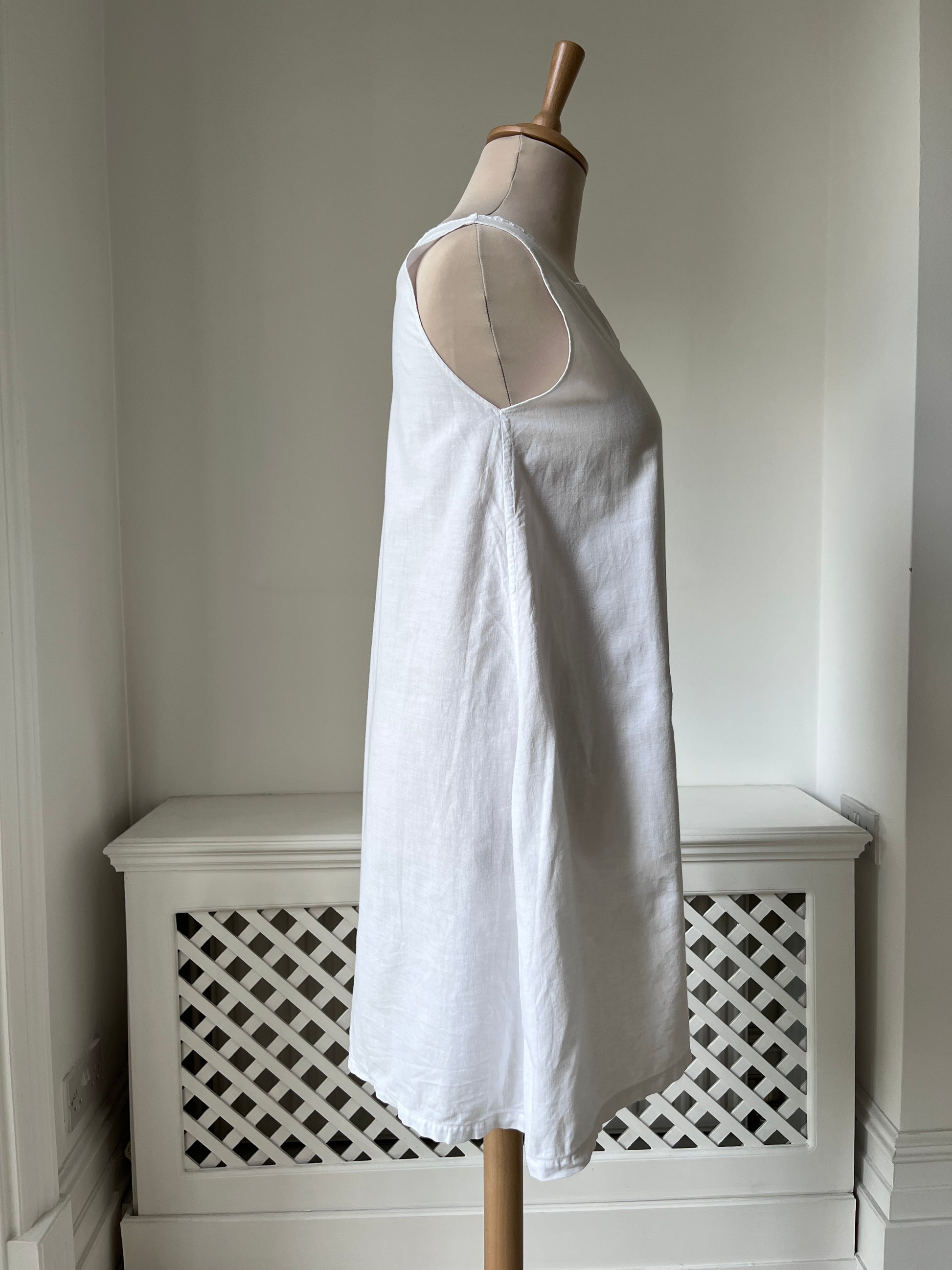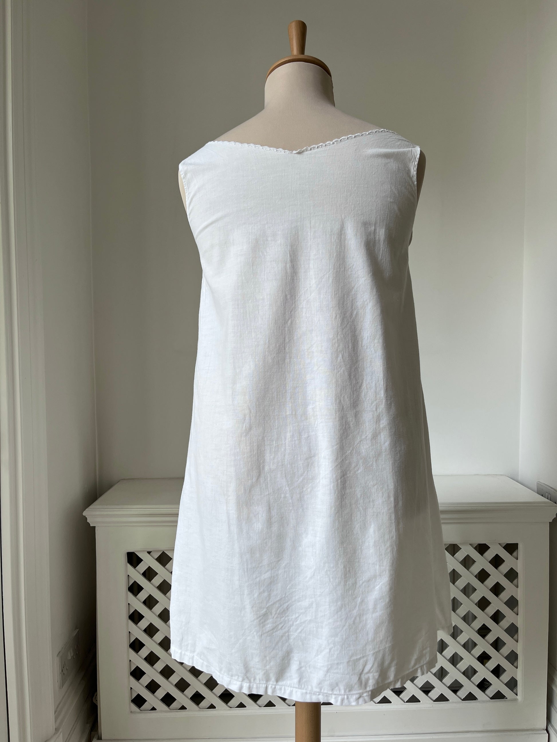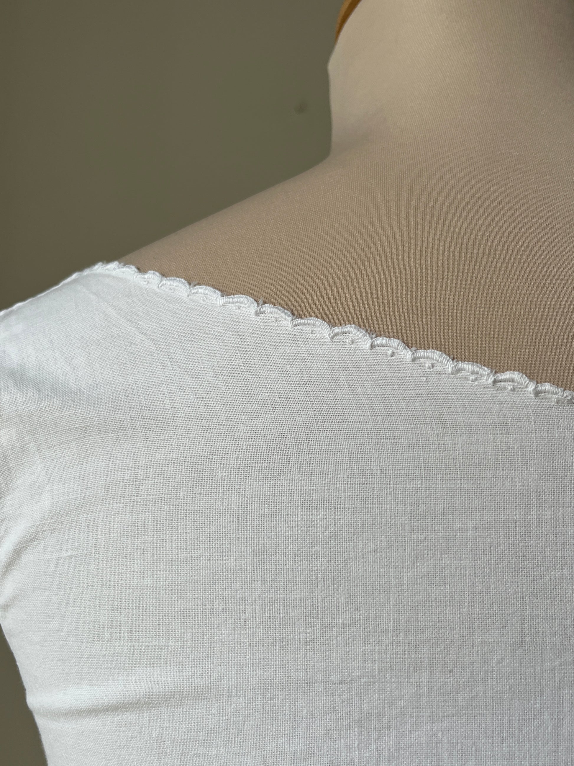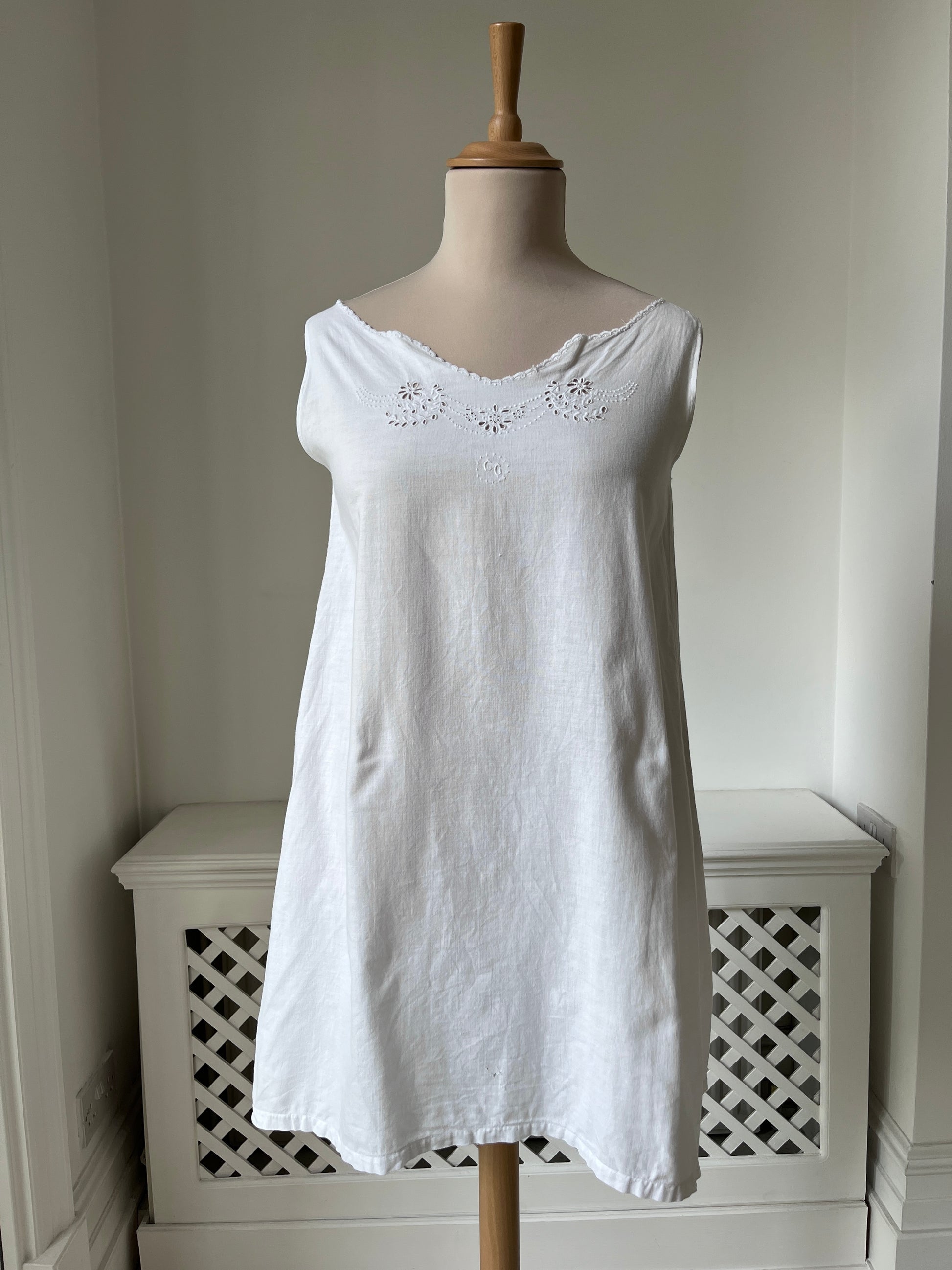 The perfect throw-on piece for a hot summer’s day—or equally lovely as a beach cover-up. This sweet little antique nightgown is cut from crisp white brushed cotton and has a wide, airy A-line silhouette. It features a scalloped hem and a generous wide neckline.The bust is detailed with openwork embroidery and finished with the original owner’s initials, “CG".