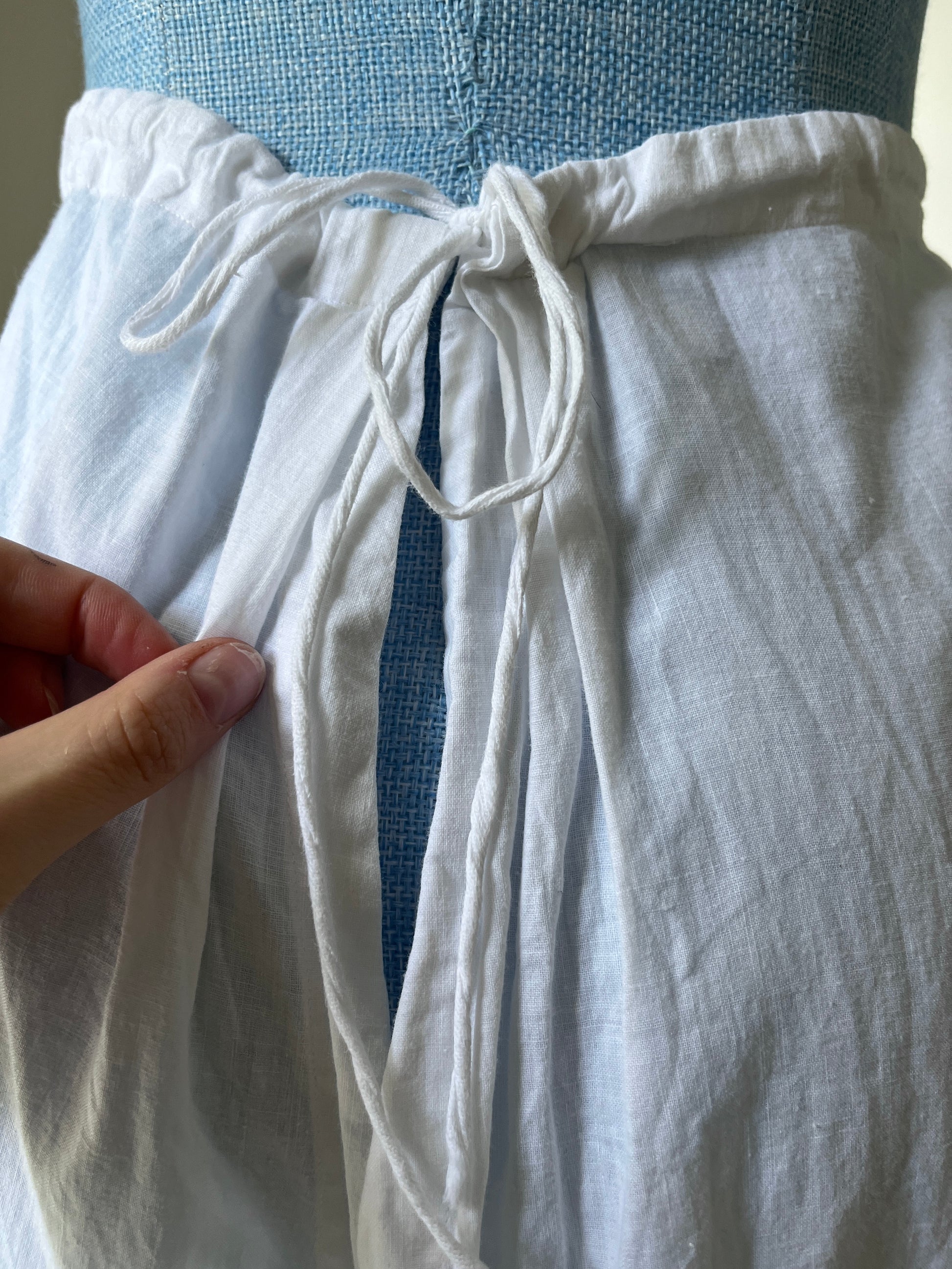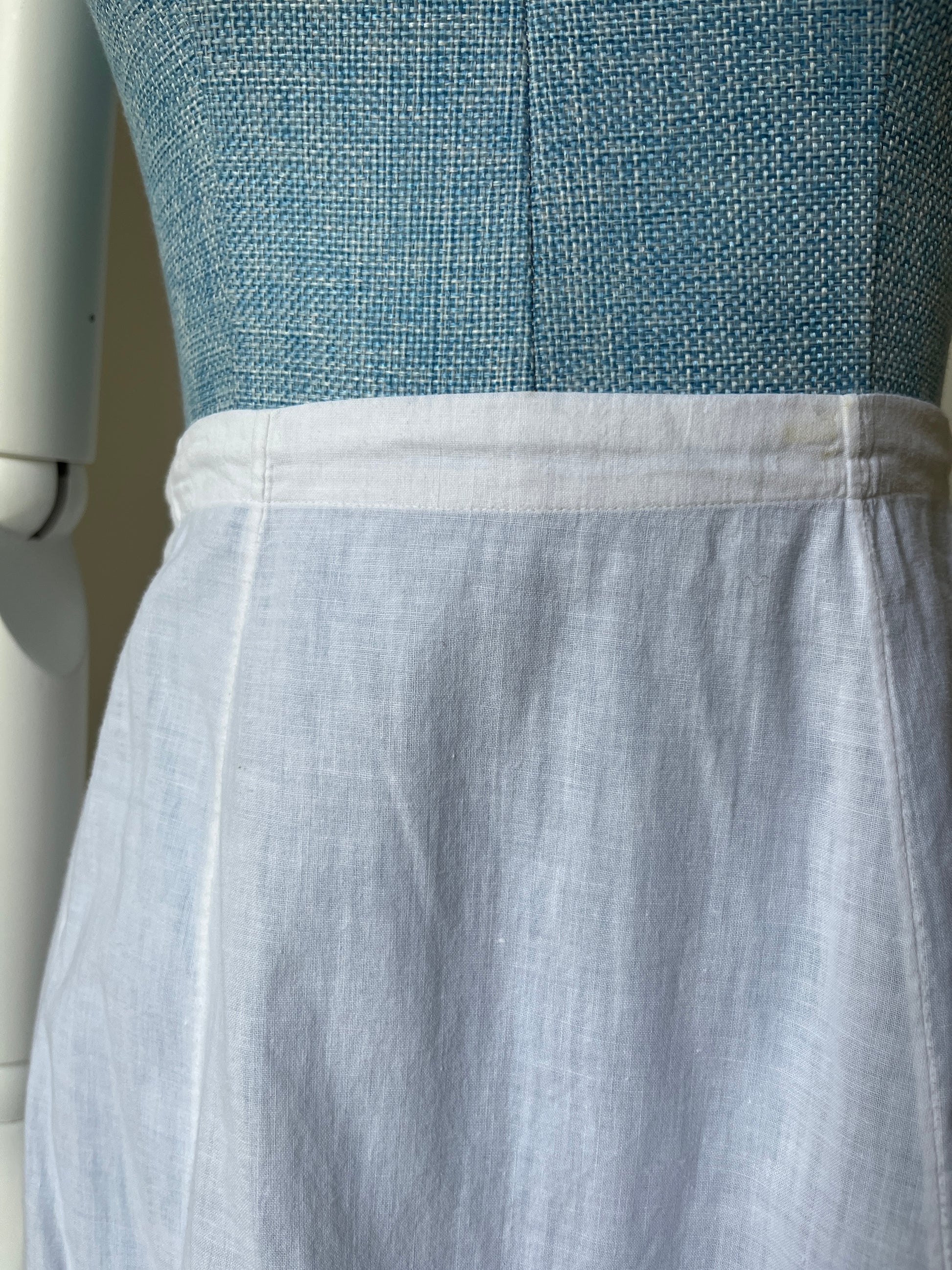 A sweet and simple petticoat, crafted from a very lightweight and semi-sheer white cotton. Dating from the 1910s, it features a classic tie-back closure, a wide band of beautiful openwork and floral embroidery at the hem, and defined seam detailing. Like many petticoats of this era, it has a deep opening at the back, which could be easily closed with a small alteration if desired.