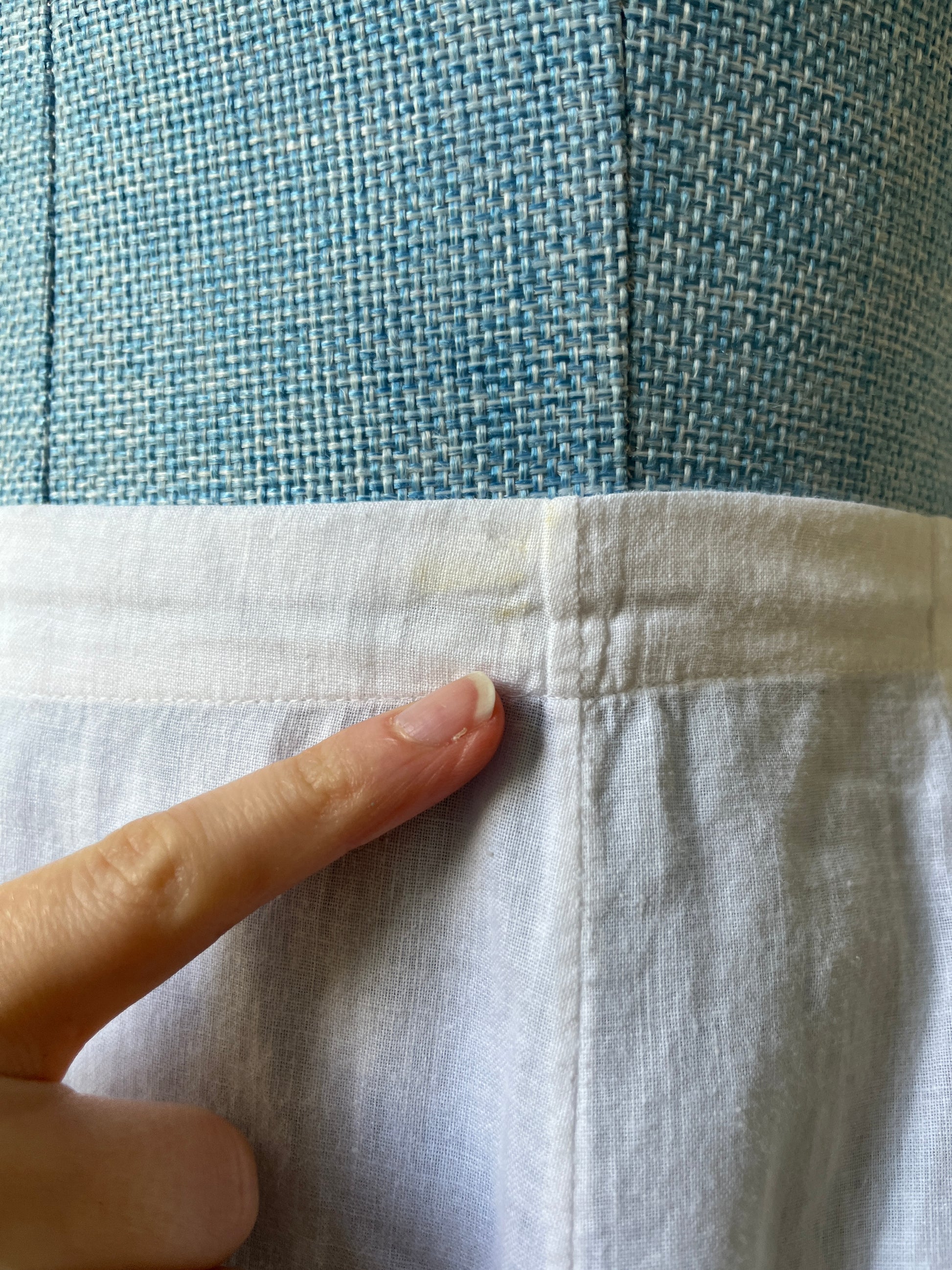 Condition: Very good. There is a small stain at the waistband (photos 8 & 9) that has not lifted with treatment. Aside from that, in very good condition with some light wear to the cotton.