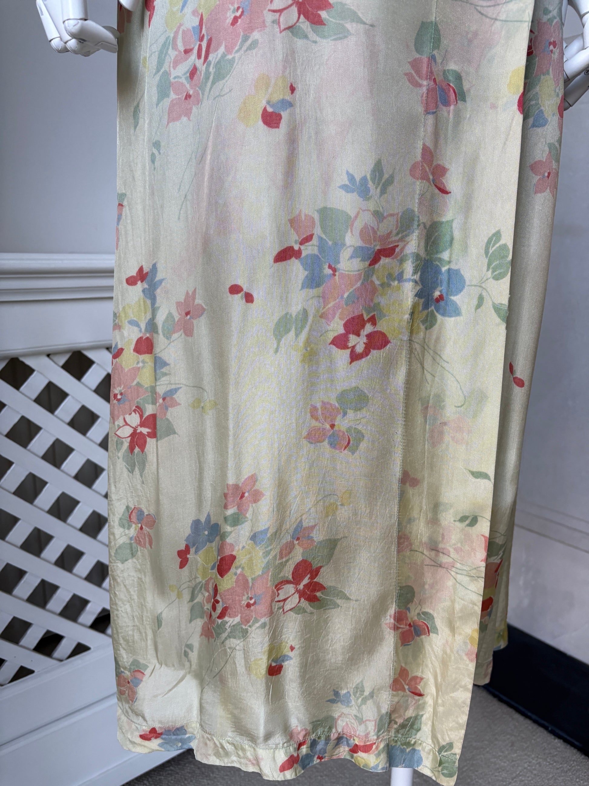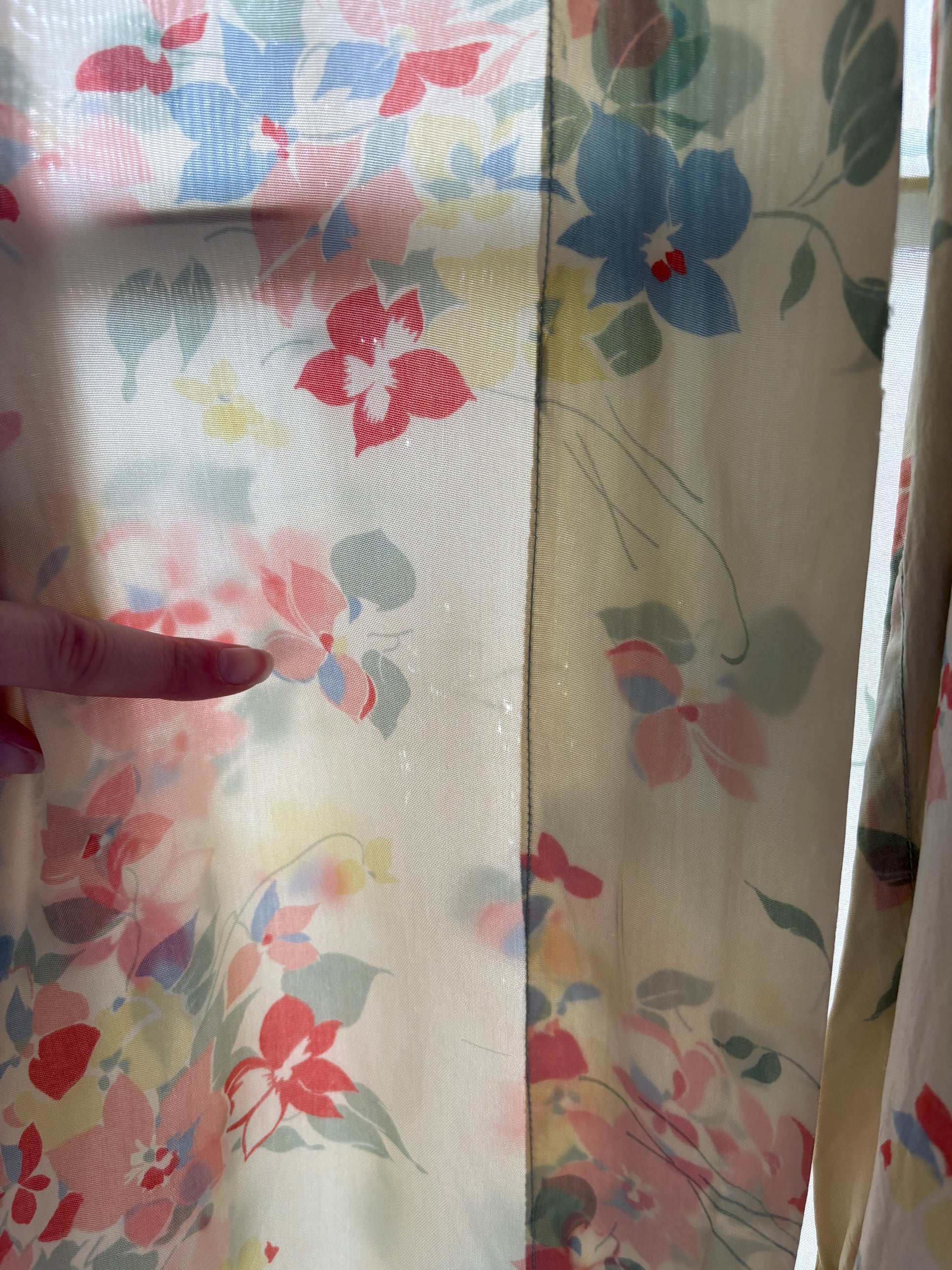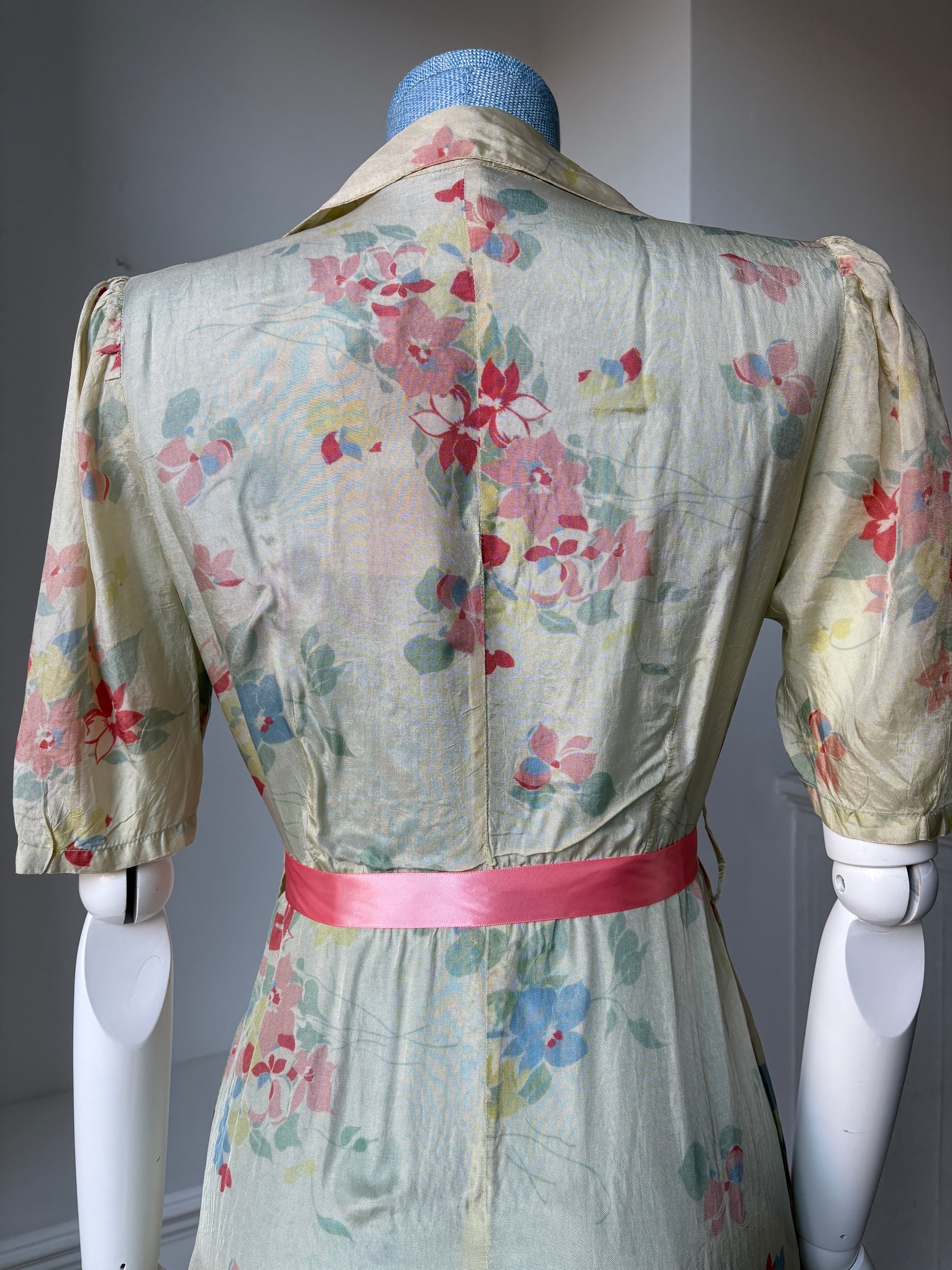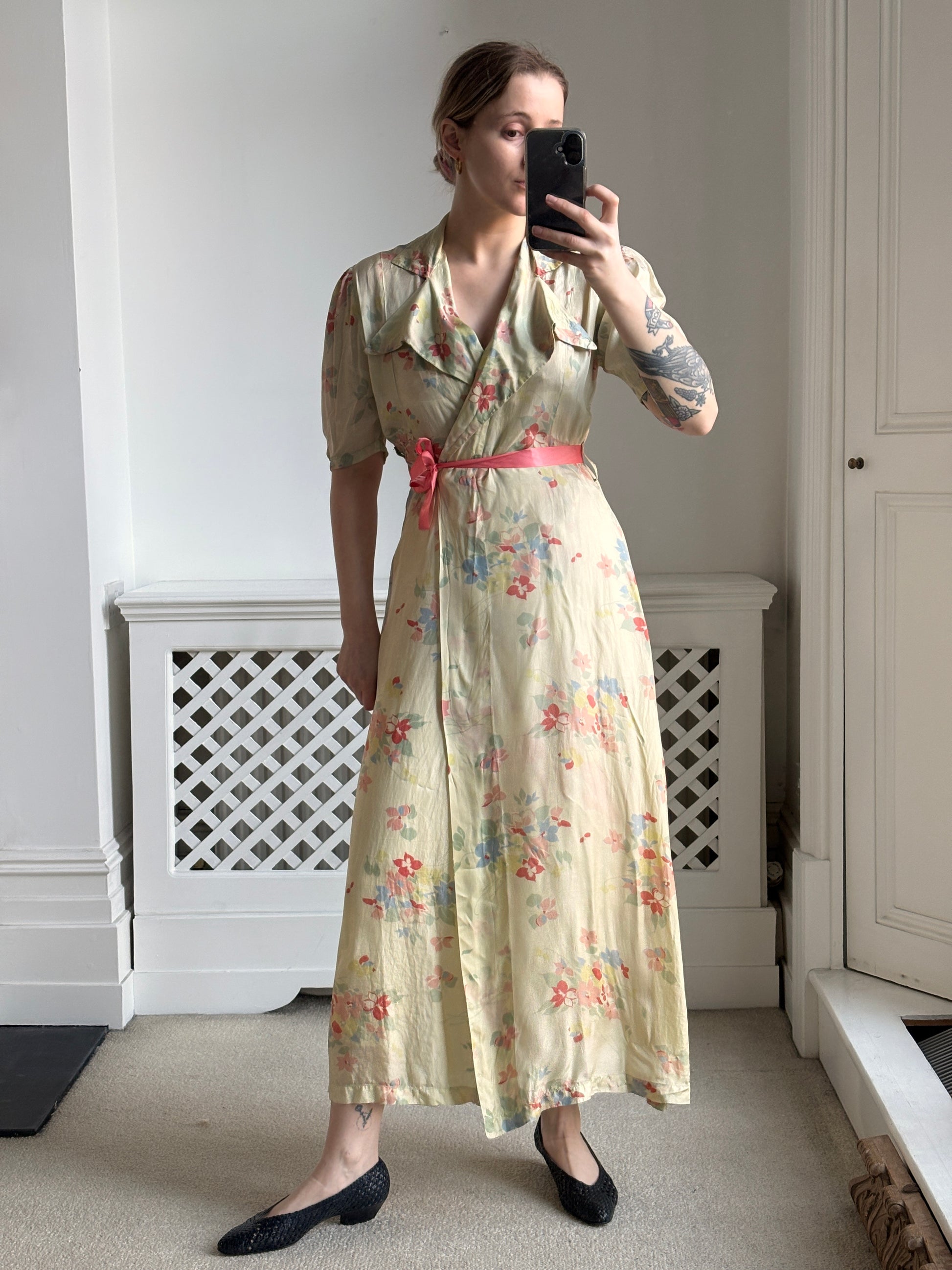 A gorgeous 1940s housecoat, cut from what feels like rayon with a hand-painted style floral design. It features a double lapel collar, lightly puffed sleeves, and a classic wrap-over front. It secures with an internal tie and a popper at the front, and I have added a new satin ribbon belt. The colours are soft and fresh, with pale pinks, blues, and coral set against a very, very pale green, almost cream coloured base. No labels.