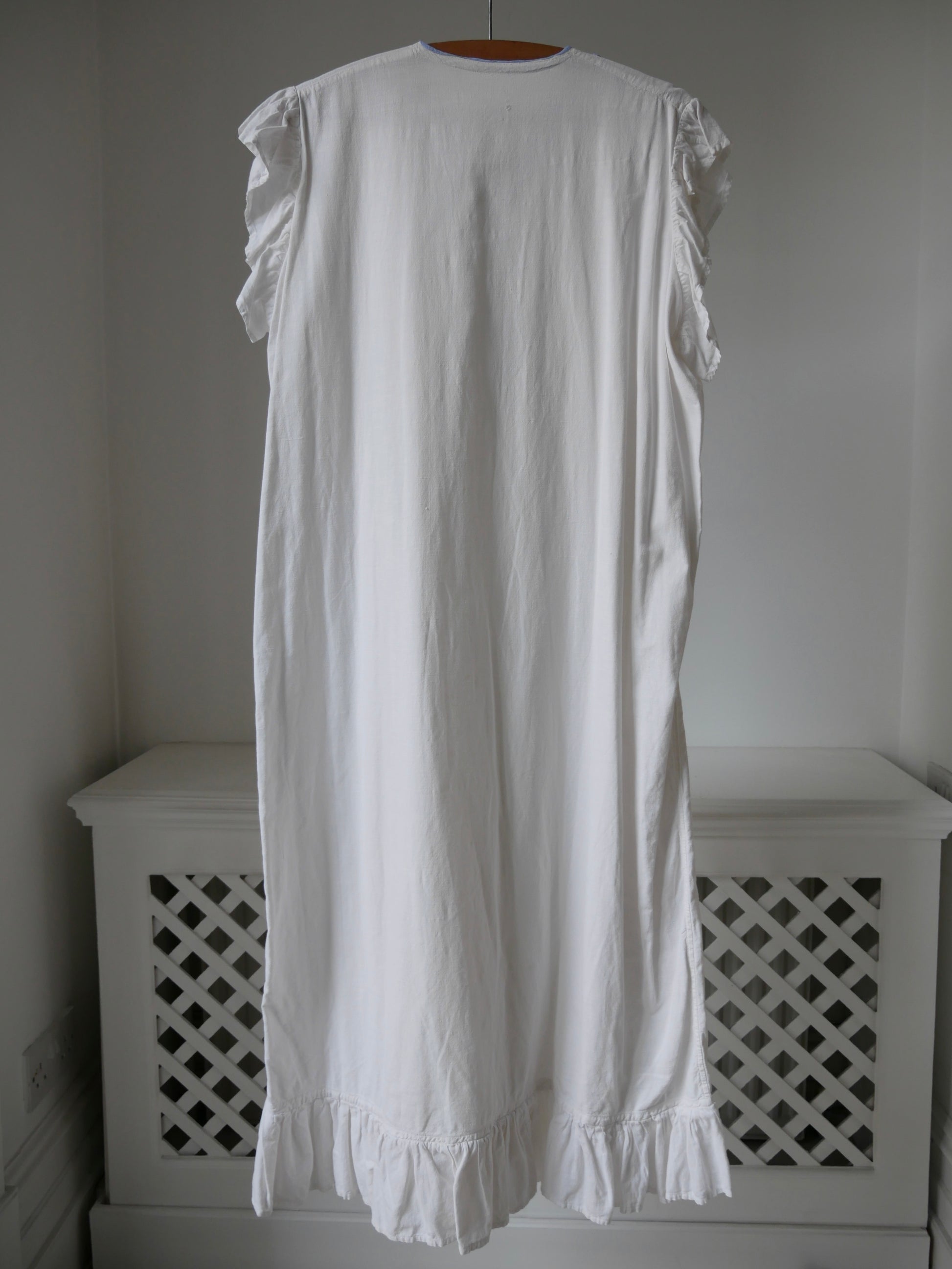 A pretty 1930s homemade nightdress made cotton with embroidered blue detailing. It has a loose, slightly A-line silhouette with frilled sleeves and a matching frill at the hem. The neckline is cut low and fastens with three large covered buttons. An easy, versatile piece that works well as both summer wear or traditional nightwear.