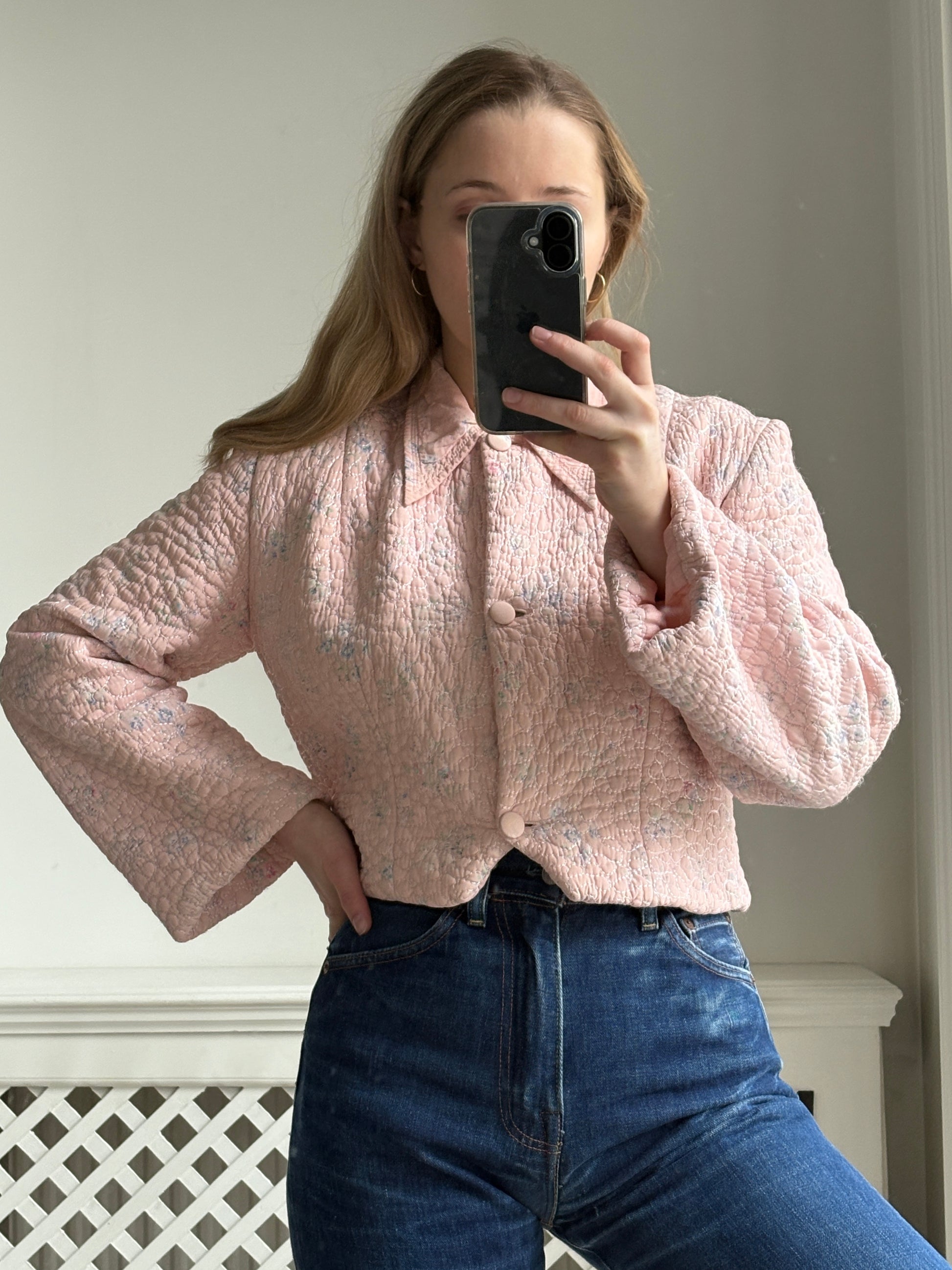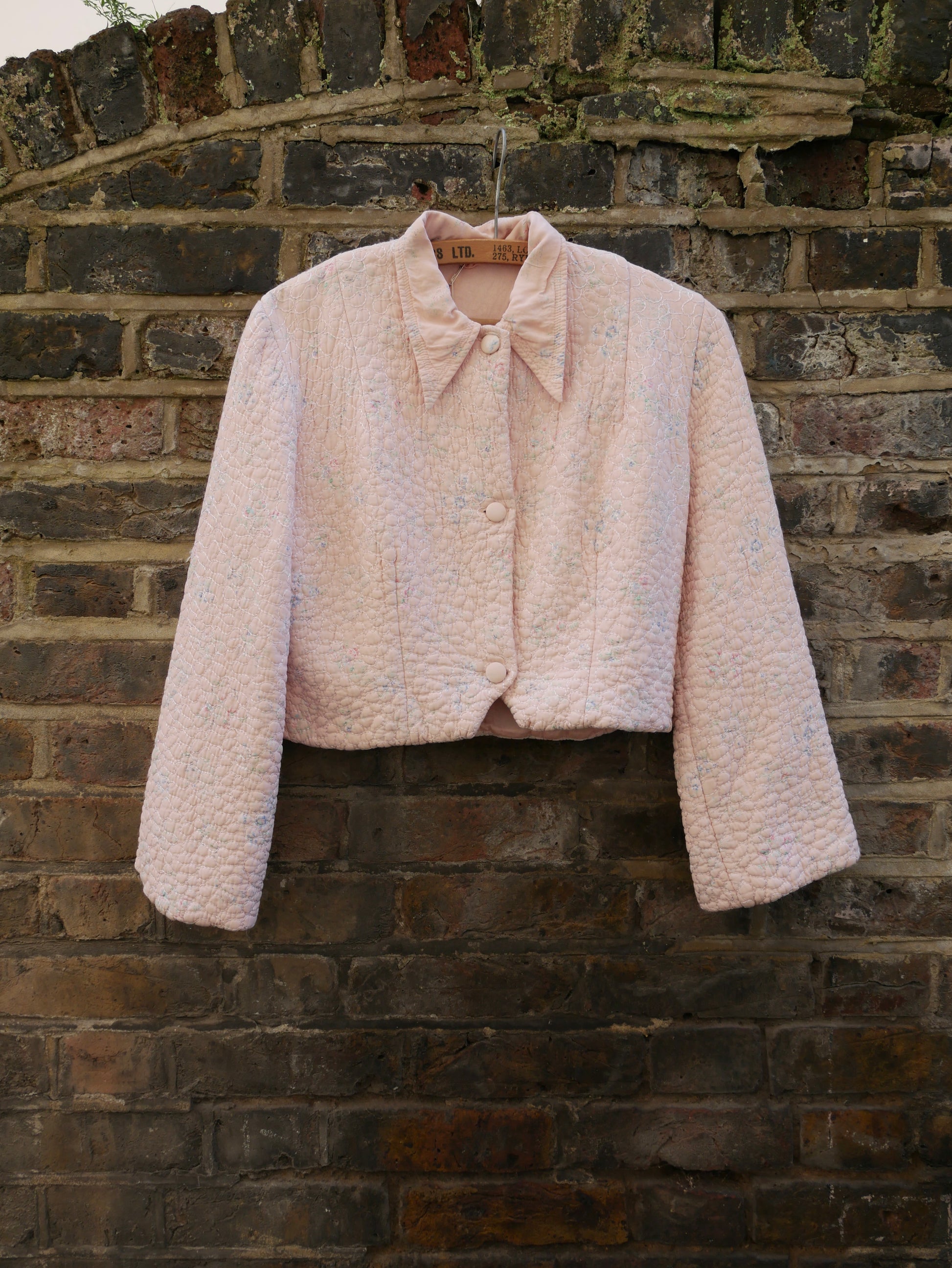 A sweet late 1940s quilted bed jacket made from a pink floral cotton-blend fabric with iridescent stitching throughout. It has a cropped, boxy shape, a pointed collar, and three buttons down the front. The jacket is padded and lined in pink satin, making it a practical layering piece for cooler weather. There is no brand label, but it does have a “Made in England” label at the neck. The model photos show the most accurate colour.