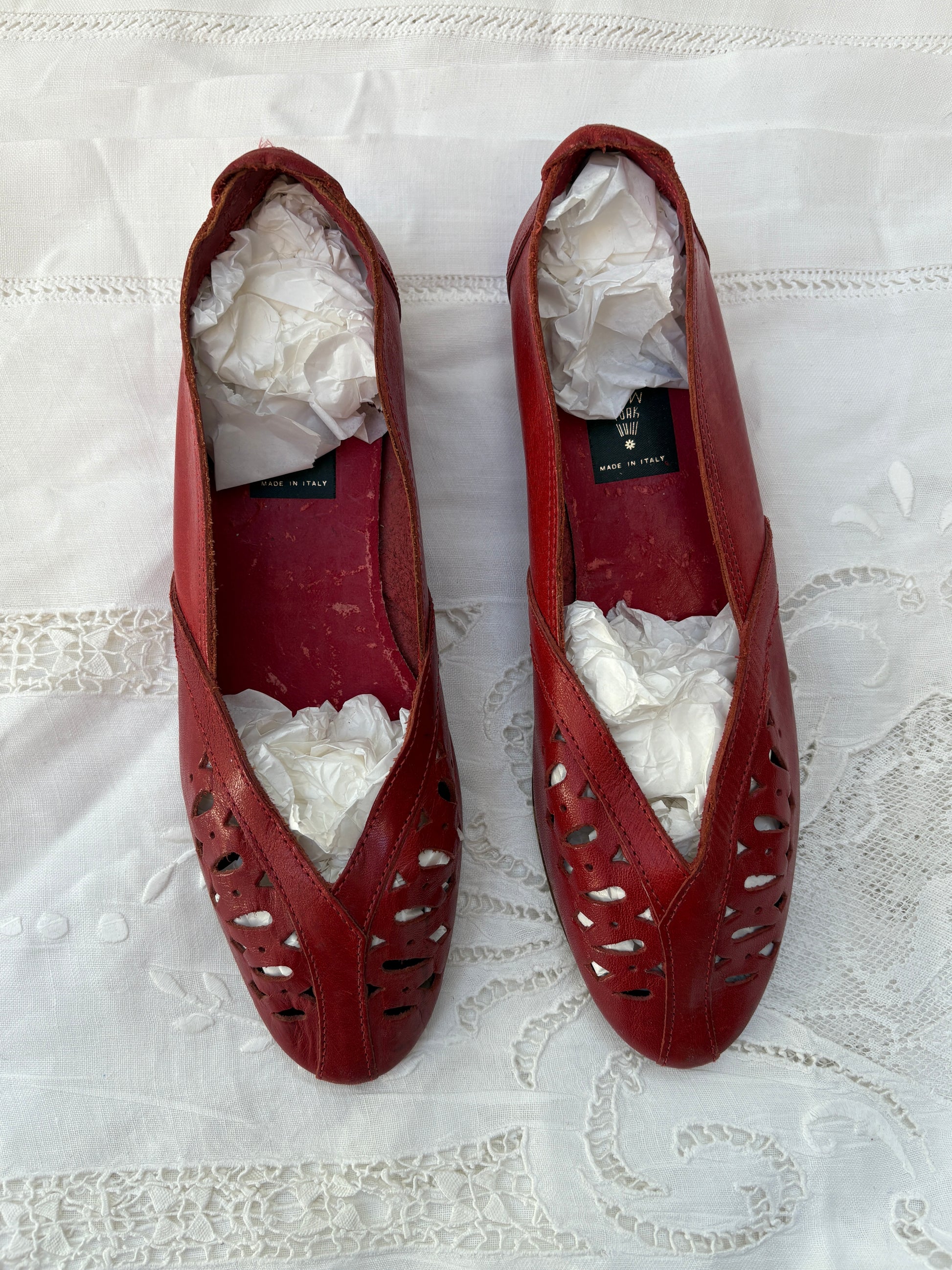 A gorgeous pair of red wedge slipper-style shoes from Bata, an international brand known for its strong European production throughout the mid-20th century. Made in Italy, these are crafted from 100% leather and feature a perforated vamp — a style that became particularly popular in post-war women’s footwear. Lightweight and easy to wear, they work perfectly as house slippers or summer shoes.