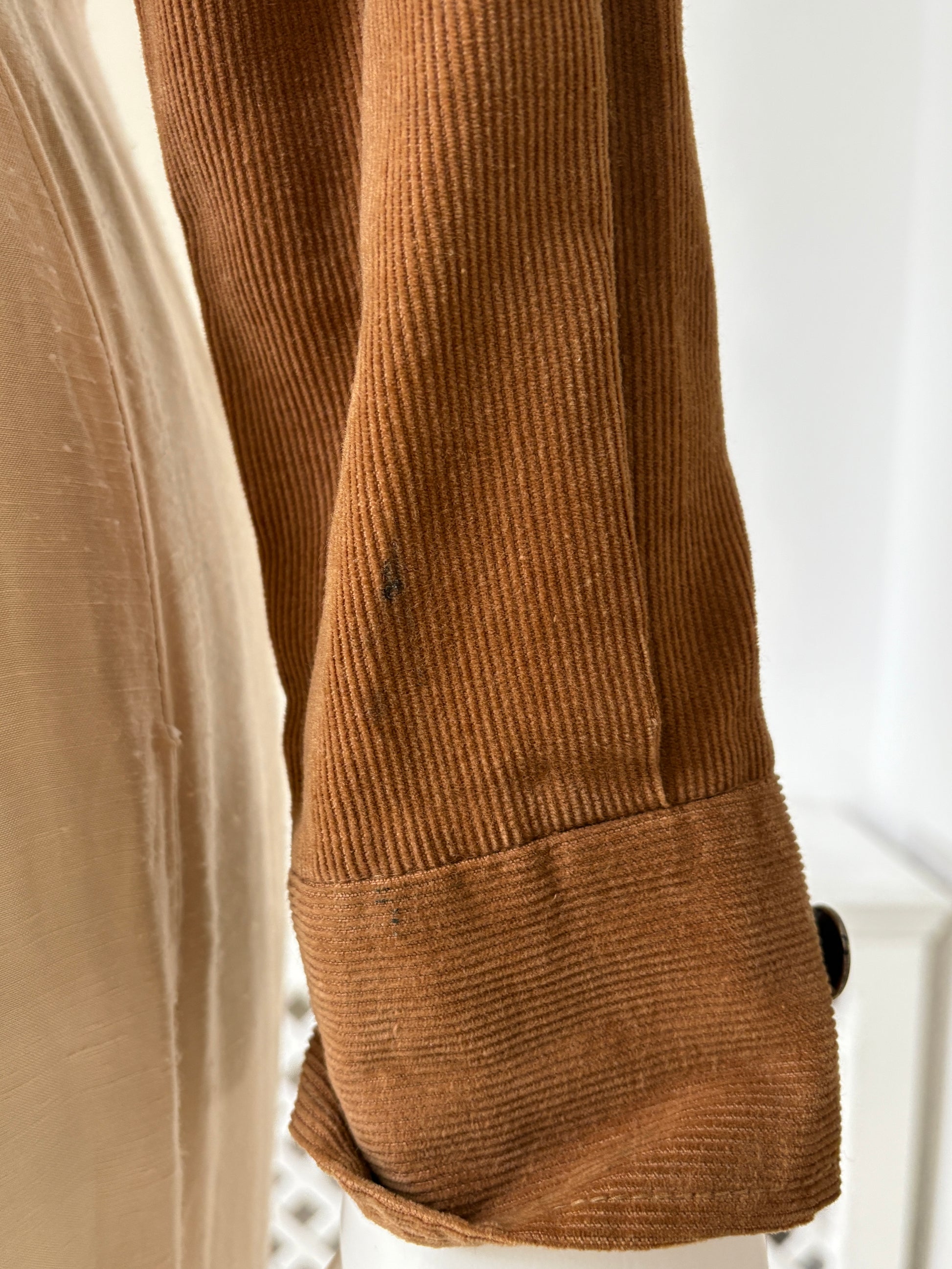 Condition: Very good. Some light staining here and there that hasn’t budged with treatment. This is seen at the cuffs (photos 9 - 11), on the back of the left arm, and on the left shoulder. Please note, this piece has been steam-cleaned but not washed (photo 12).
