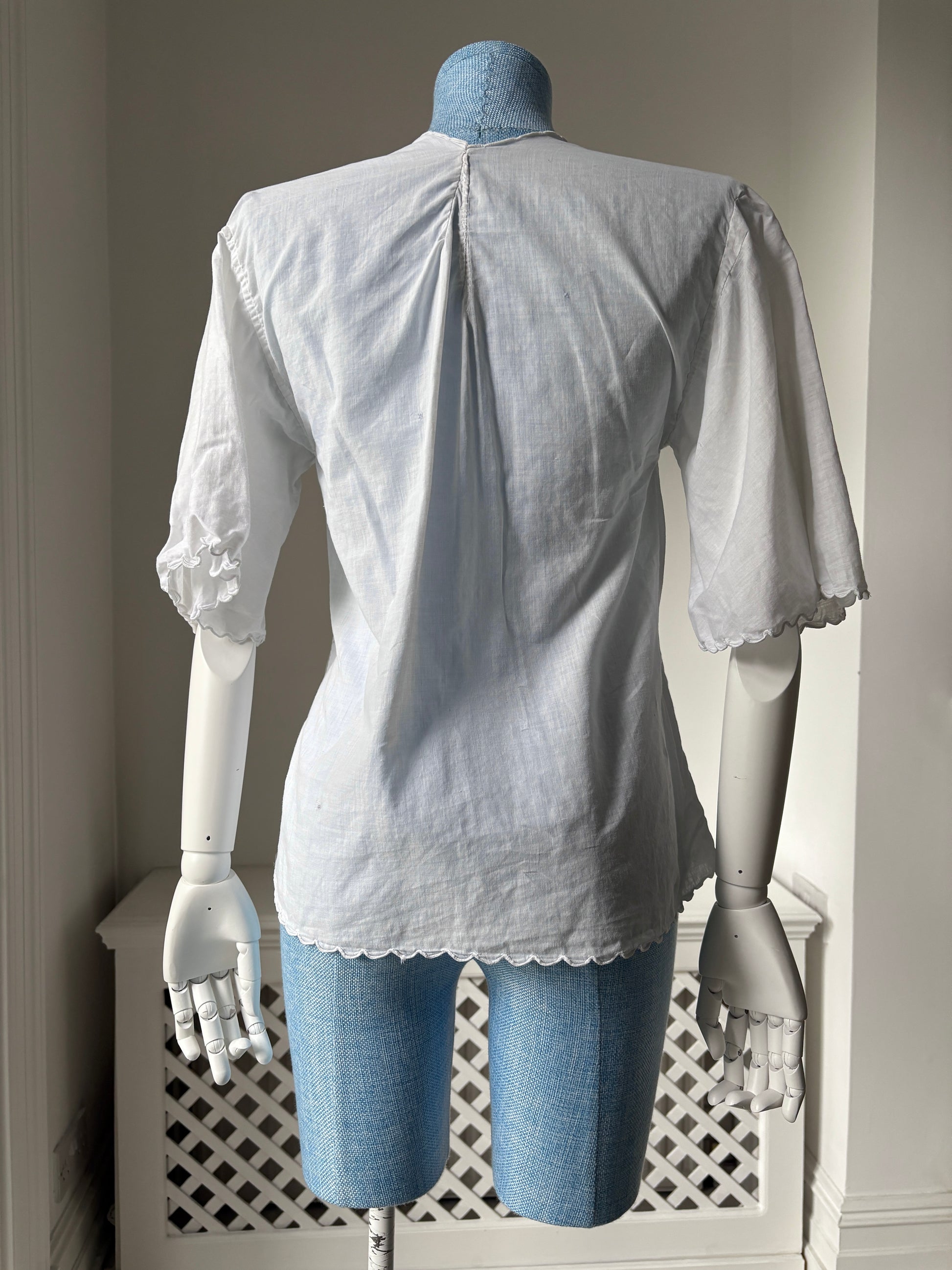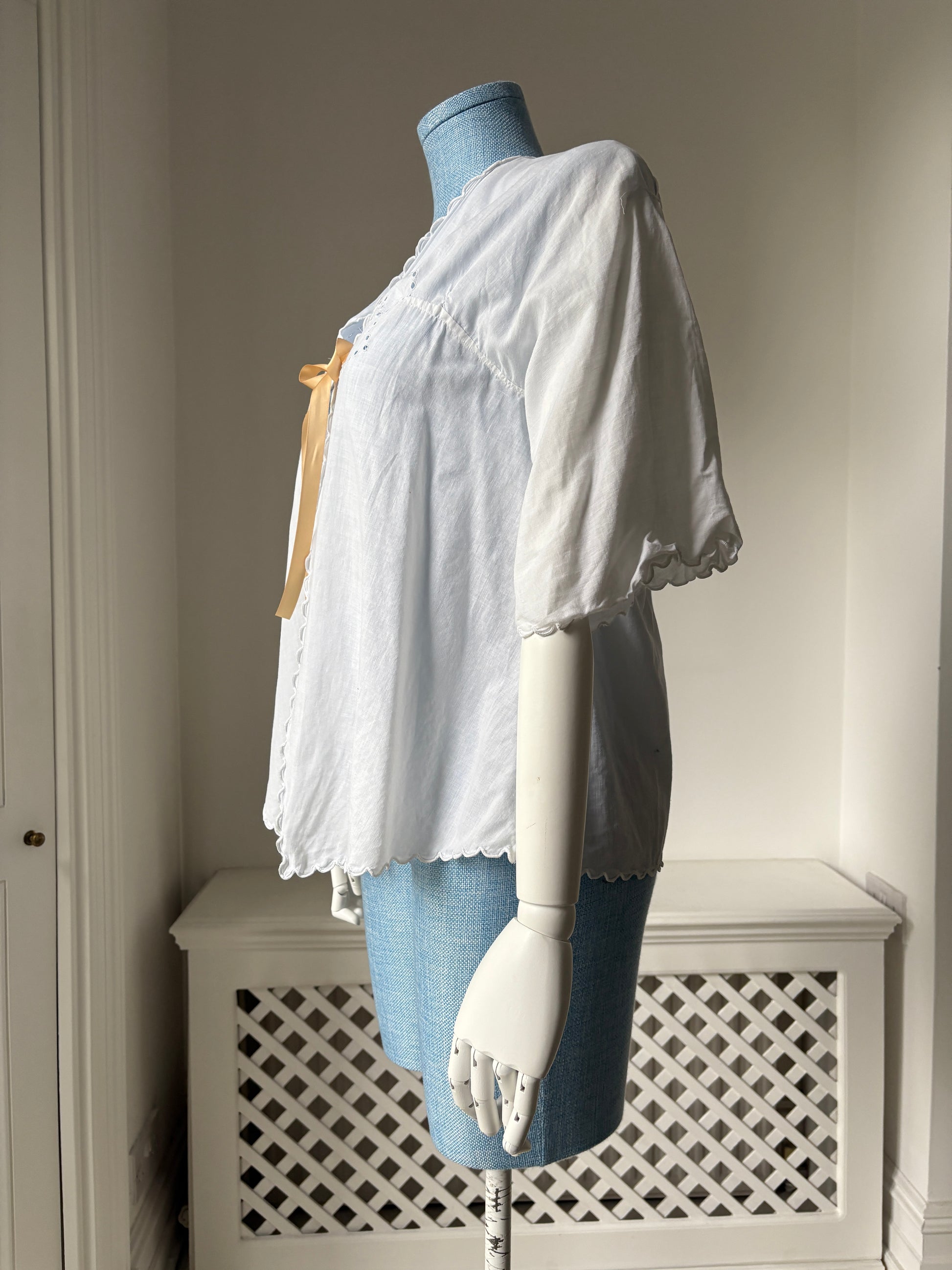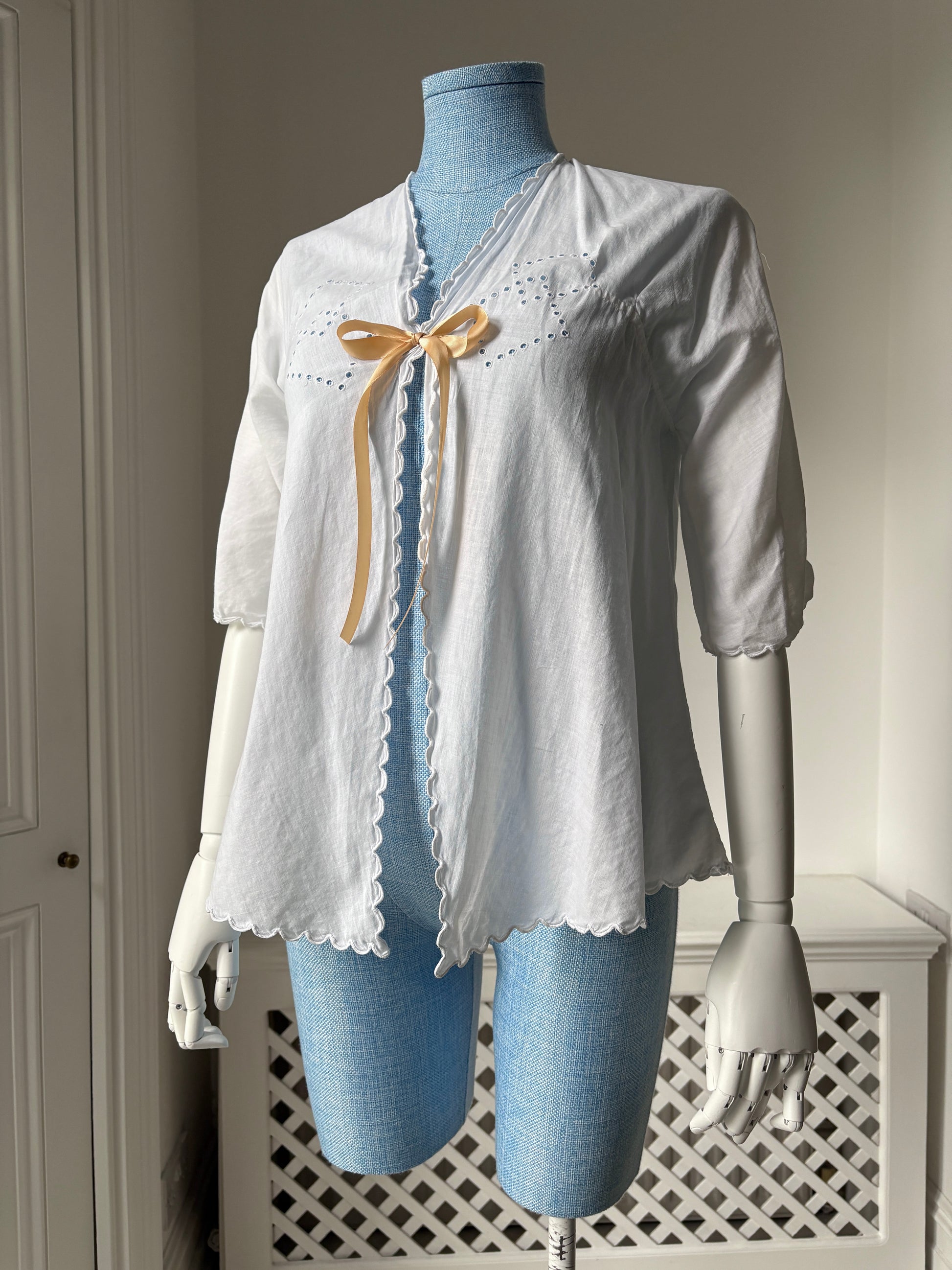 I just love a bed jacket! They look brilliant paired with a white tee and jeans or thrown over a slinky dress — they’re so versatile. This sweet Edwardian bed jacket features beautifully sewn scalloped edges and a tie front. It has an open design that fastens with a (modern replacement) apricot satin ribbon and short scalloped sleeves. The body is detailed with openwork geometric motifs on each side of the bust.