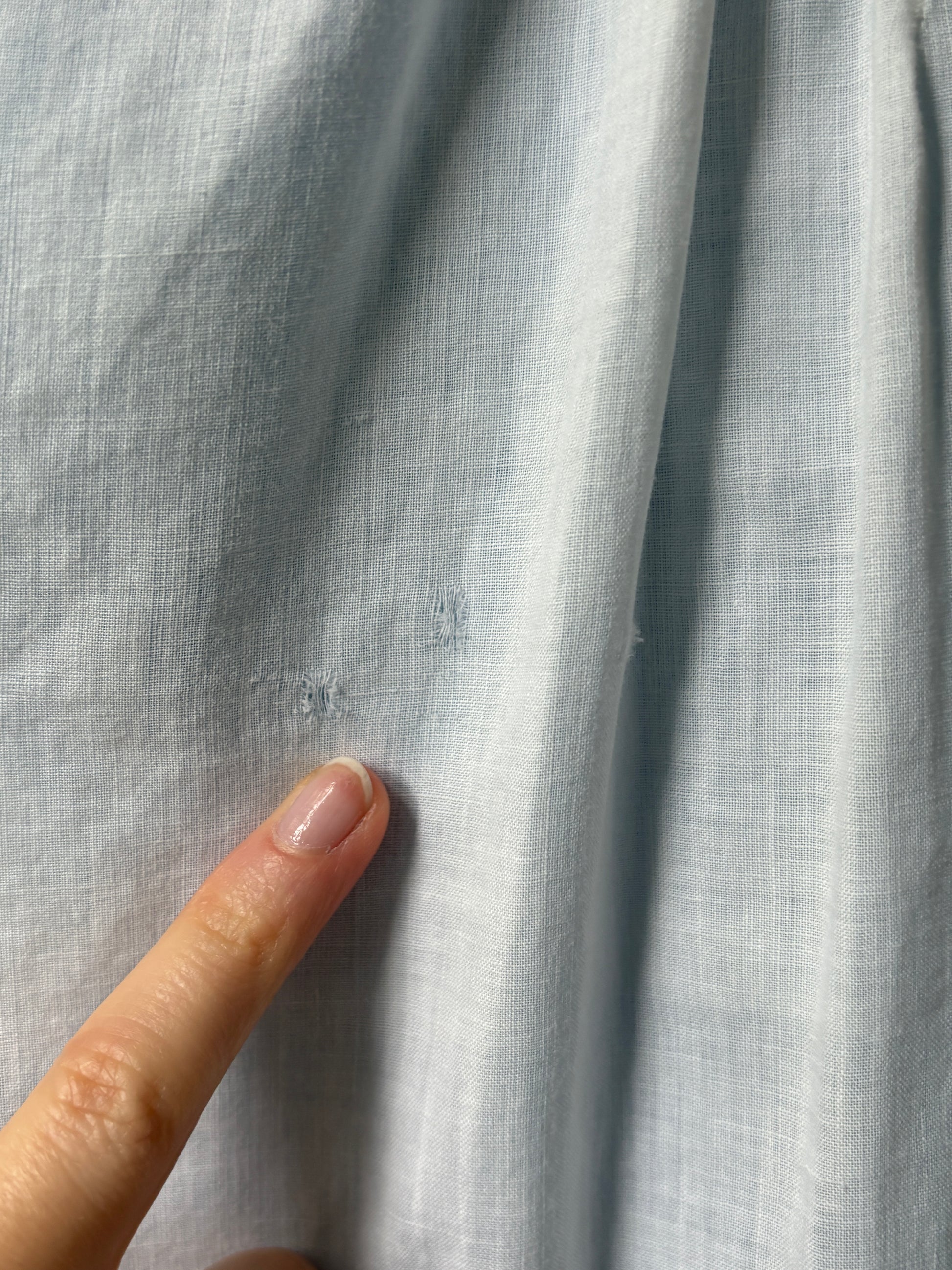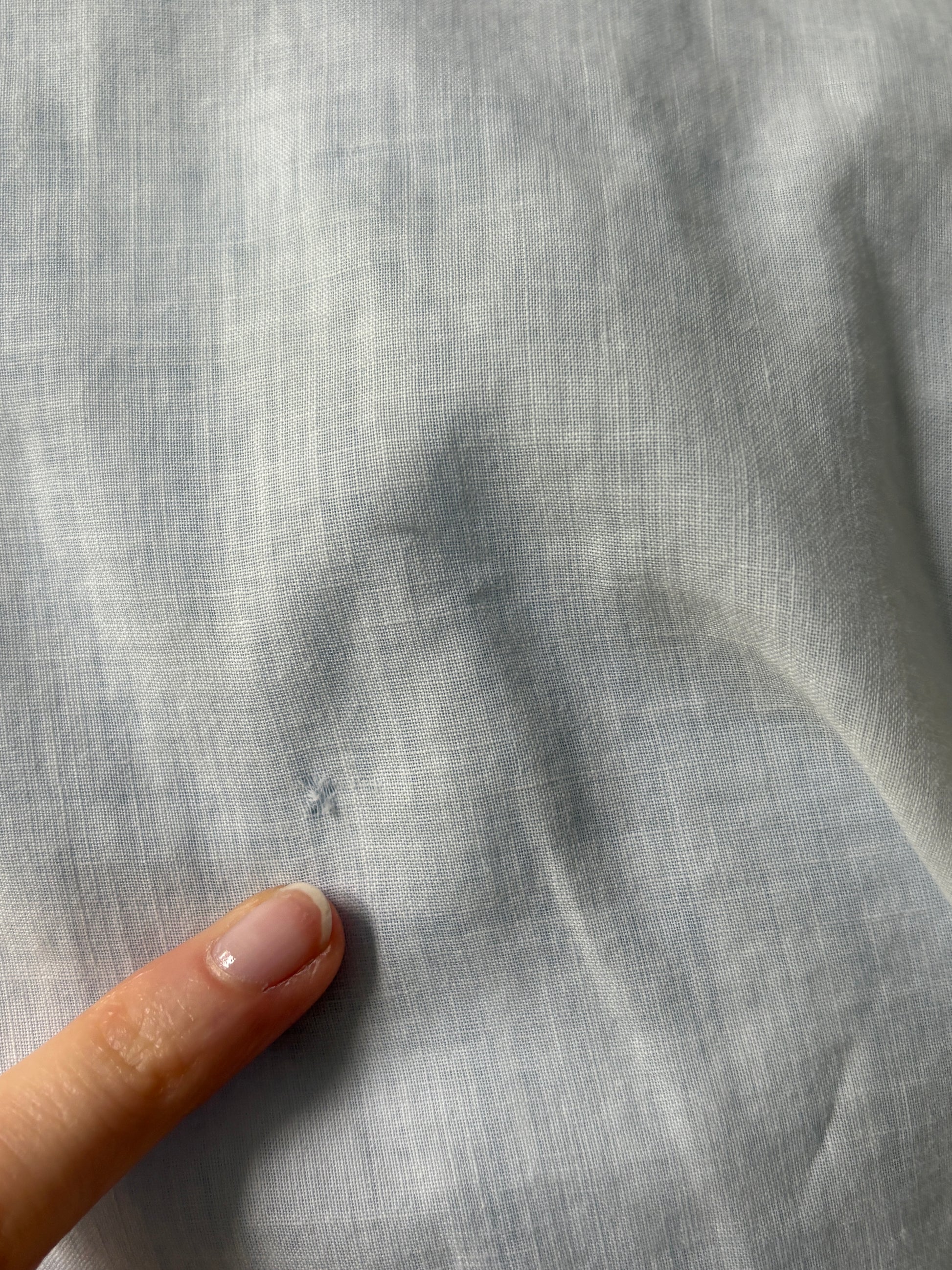 Condition: Very good. There is an alteration at the back of the neck to make it smaller (as shown in the photo 11). I haven’t unpicked this, as it functions well, but it could easily be undone if preferred. There are a few small mends under the arms, a tear to one of the ribbon holes (photo 6), and some wear to the cotton at the back, including minor holes and areas of fragility (photos 12 & 13).