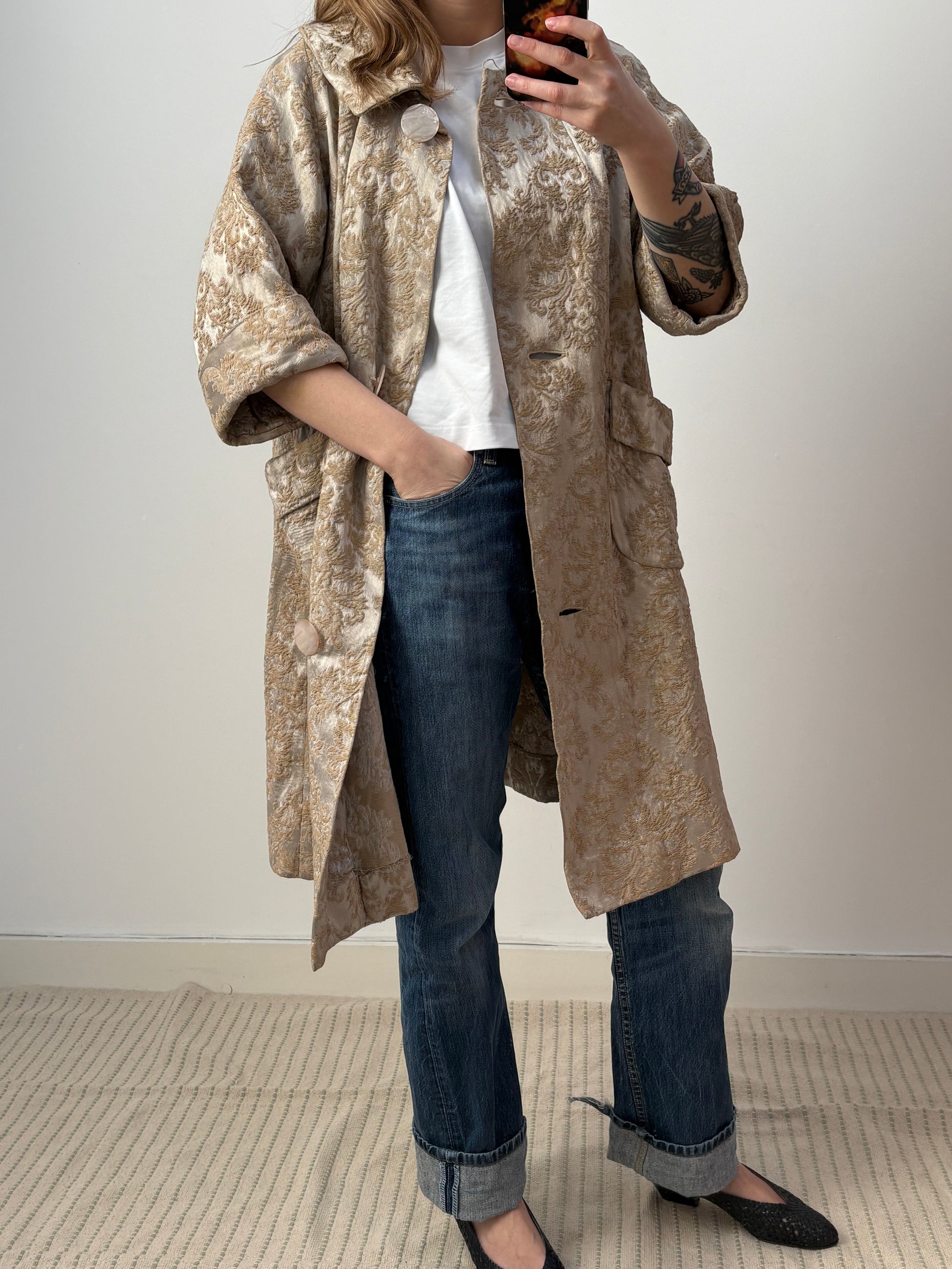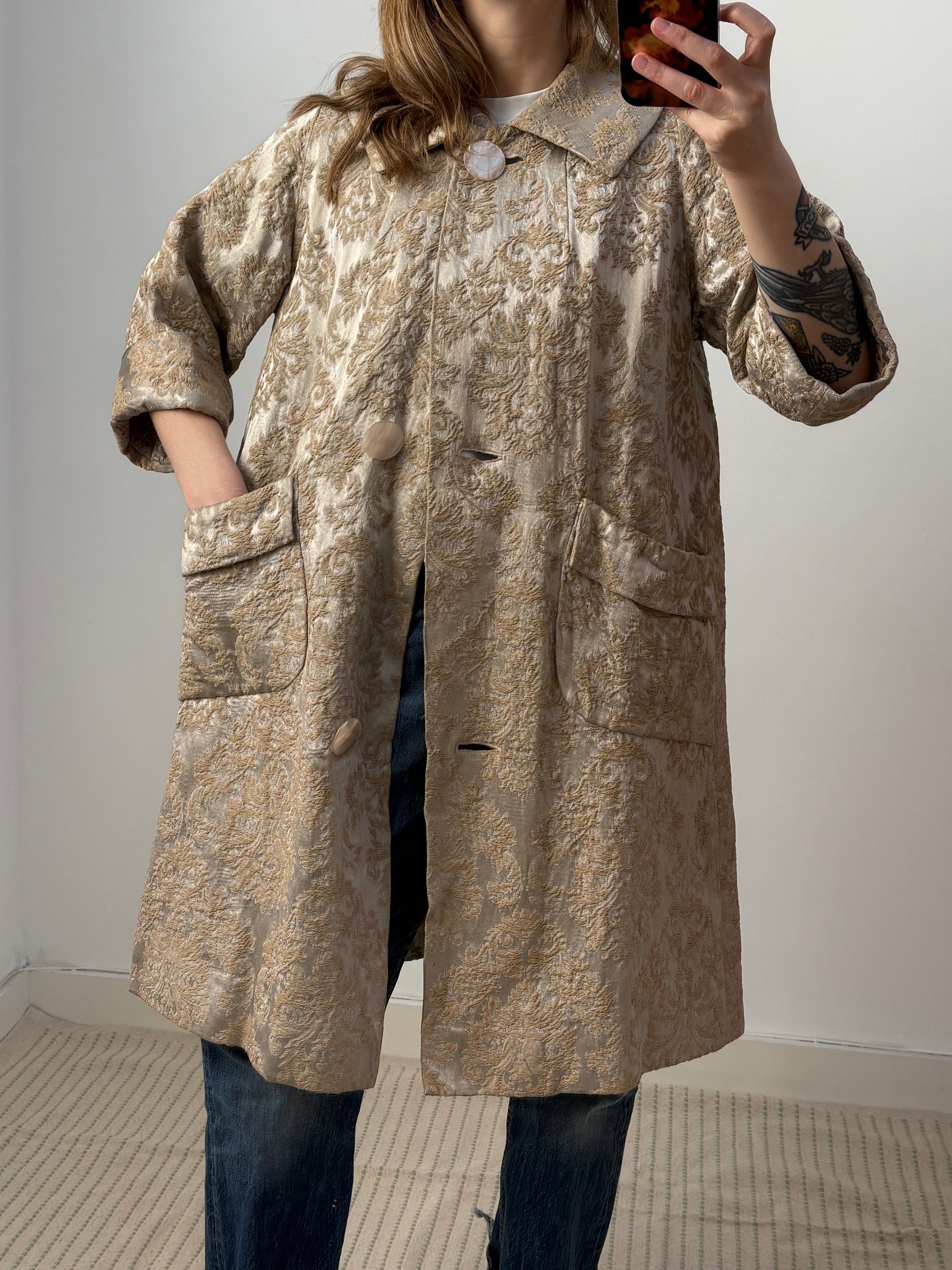 A lovely original 1960s lightweight evening coat in silver and gold. It is unlined, with a classic A line shape, three quarter length sleeves, a collar, and large mother-of-pearl feature buttons. The woven threads give it a beautiful sheen, and it feels very well made. It looks fantastic styled casually over a pair of jeans and a white tee.