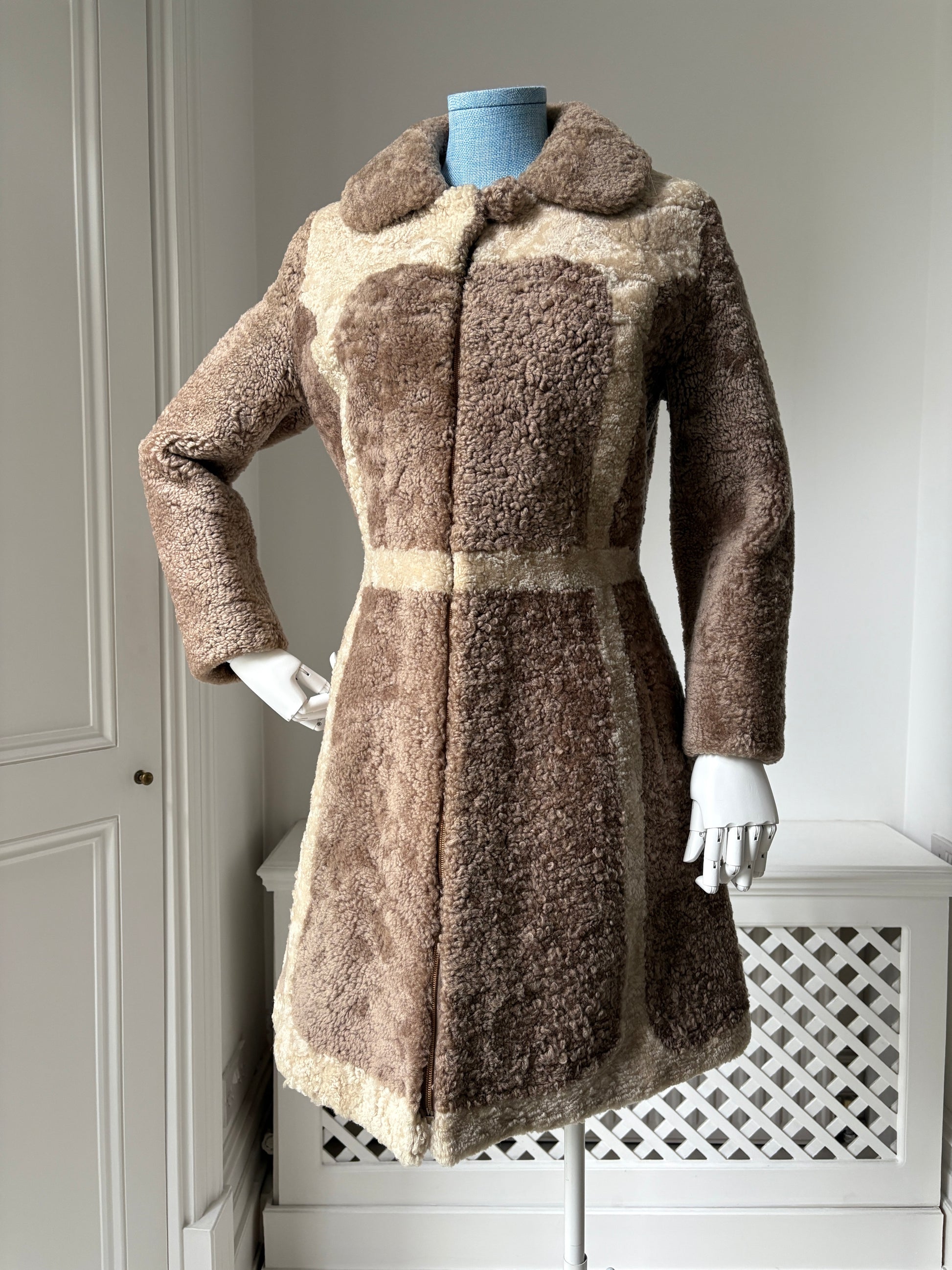 A striking 1960s coat in faux shearling, featuring a bold grid pattern in beige and cream. The shape is flattering, with a wide puffed collar, a nipped waist, and a gently flared skirt. It zips up the front, with the collar fastening by a pom-pom button and elastic loop. Fully lined in satin, with no label inside.