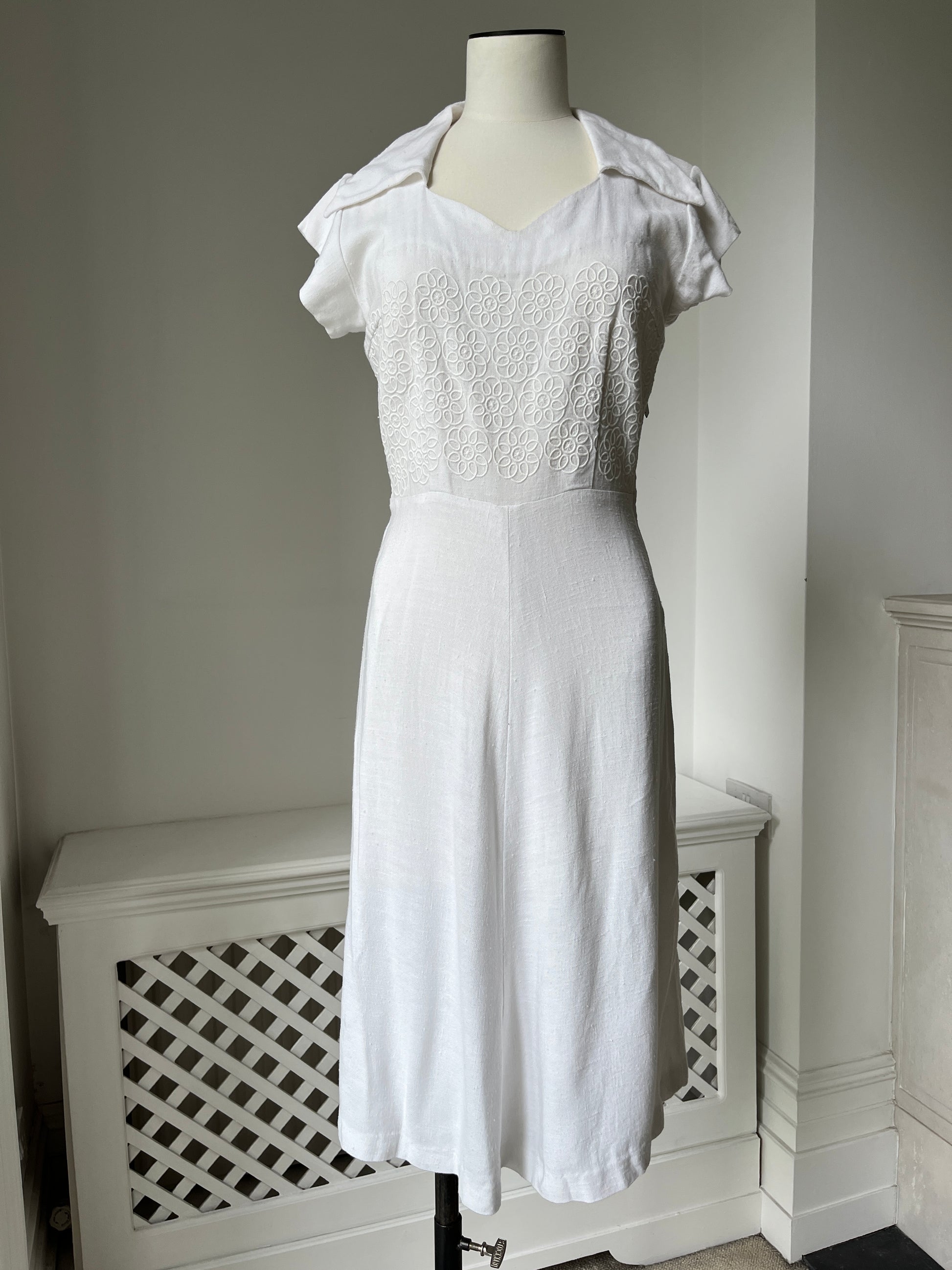 A super sweet homemade summer dress, dating from the late 1950s or early 1960s. This midi-length beauty is crafted from a textured slub cotton and features a flattering V-neckline, wide collar, and half sleeves. The bodice is adorned with a repeating floral design, while the pencil skirt adds a classic silhouette. It fastens at the side with a modern replacement zip, and the skirt is fully lined