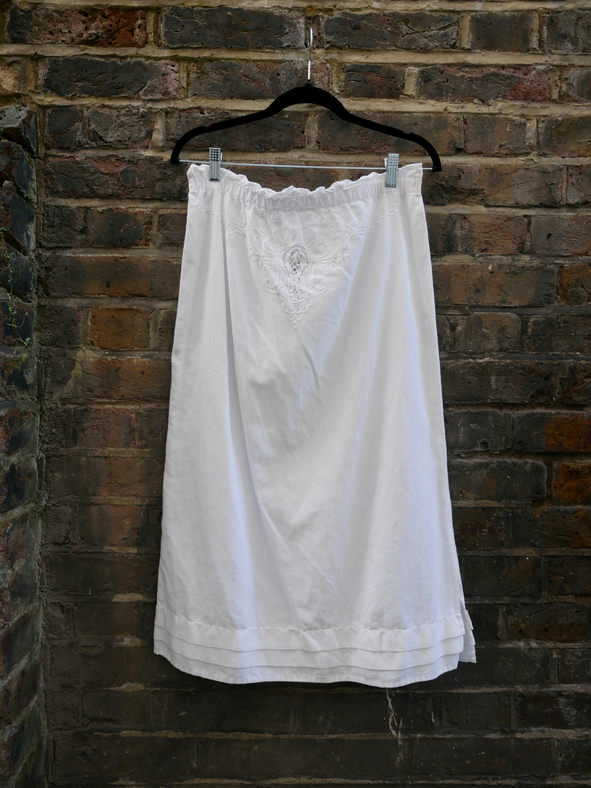 A reworked skirt made in the 1990s from an antique cotton tablecloth. The fabric is a thick, medium-weight cotton with openwork details, a layered hem, and an embroidered motif at the waist. A wide elasticated waistband has been added, giving the skirt a comfortable fit and a gentle flounce.
