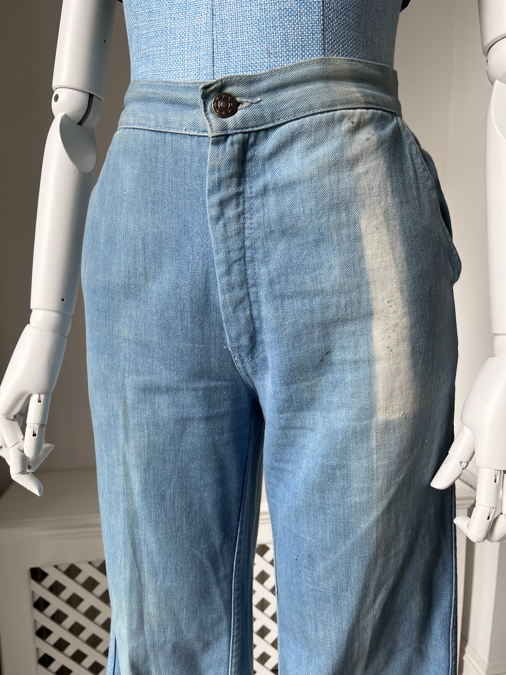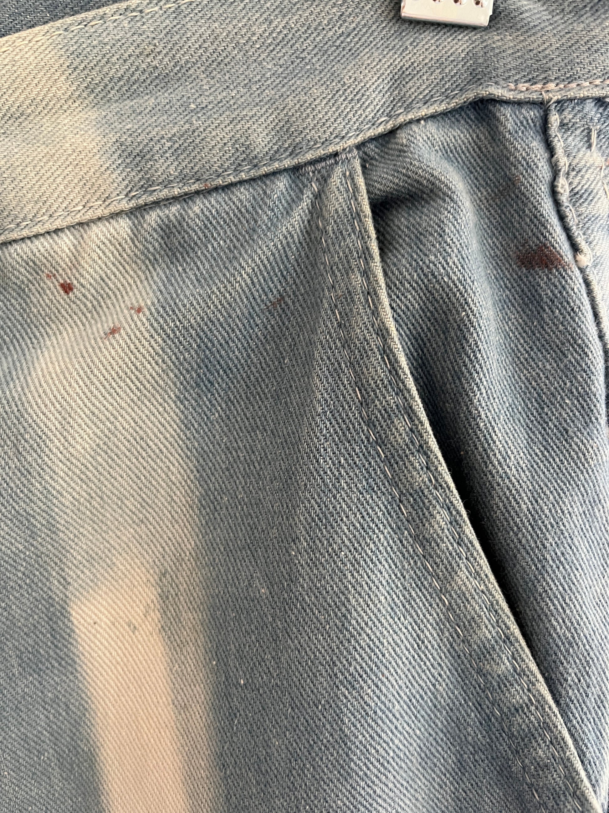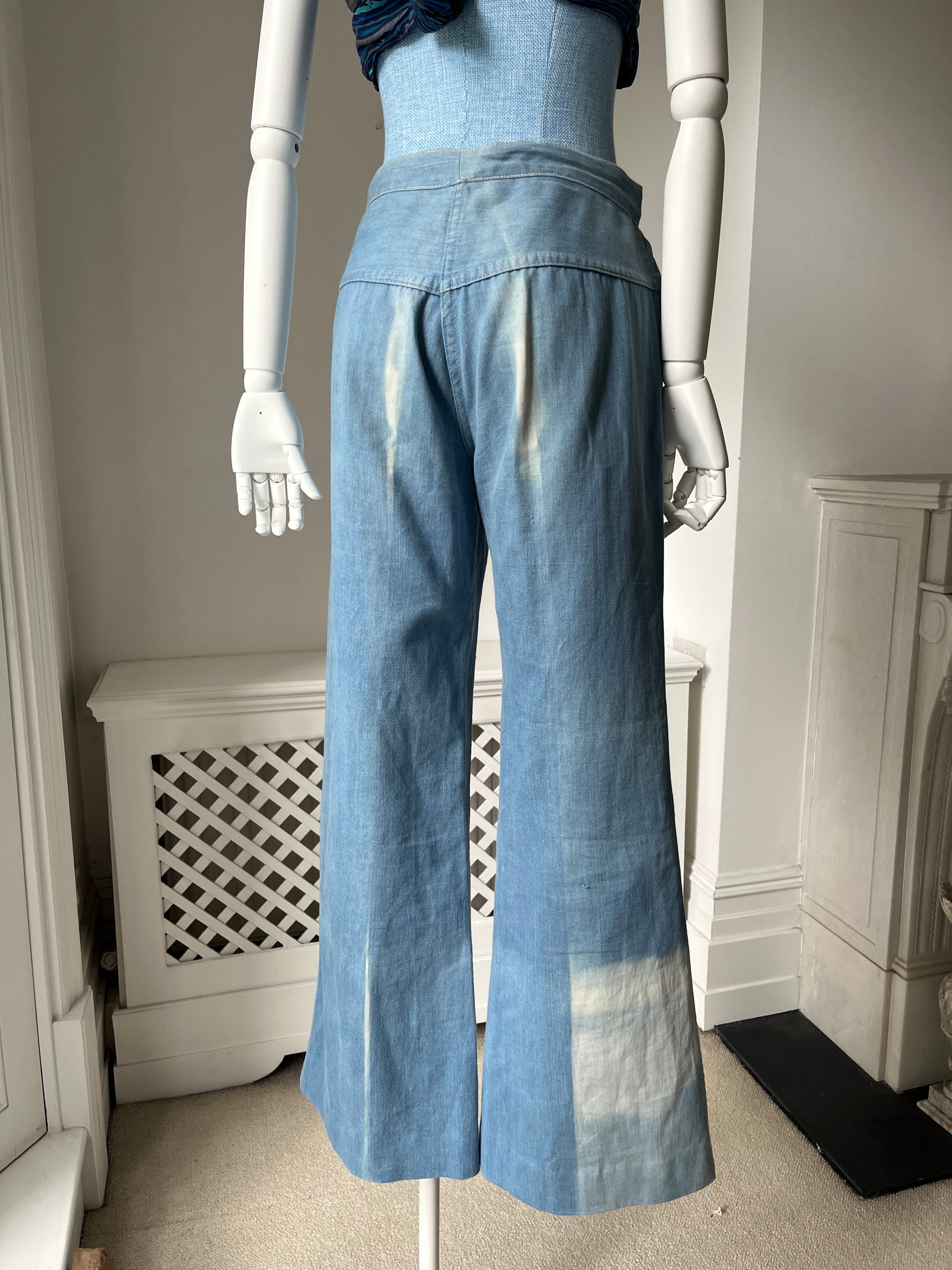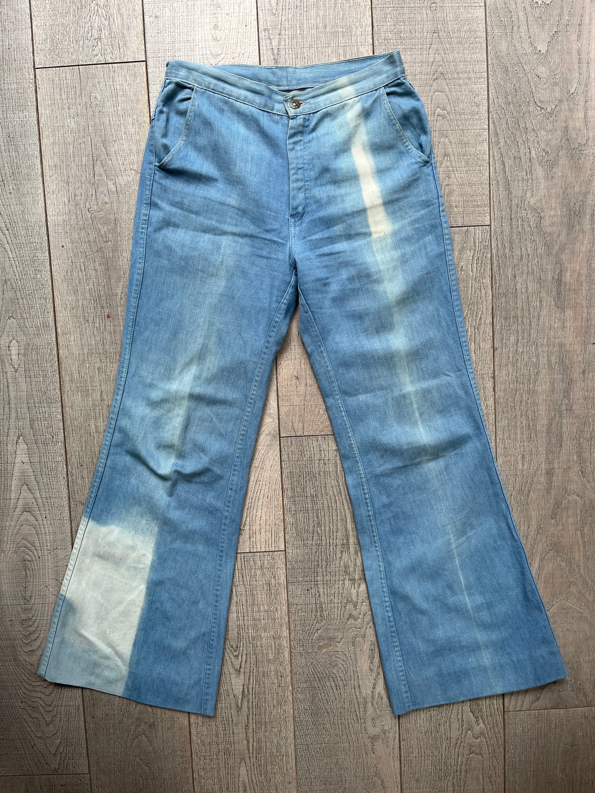 A fantastic pair of perfectly worn-in 1970s bell-bottom jeans with a seriously cool bleached effect. Made from 100% cotton, they come in a soft light blue with contrast white stitching, a button closure with zip, and wide flared legs. A previous owner has given them a unique, hand-bleached finish that adds loads of character. They have no brand label, but retain their material and care tag. Best representation of colour is shown in photos 2 onward.