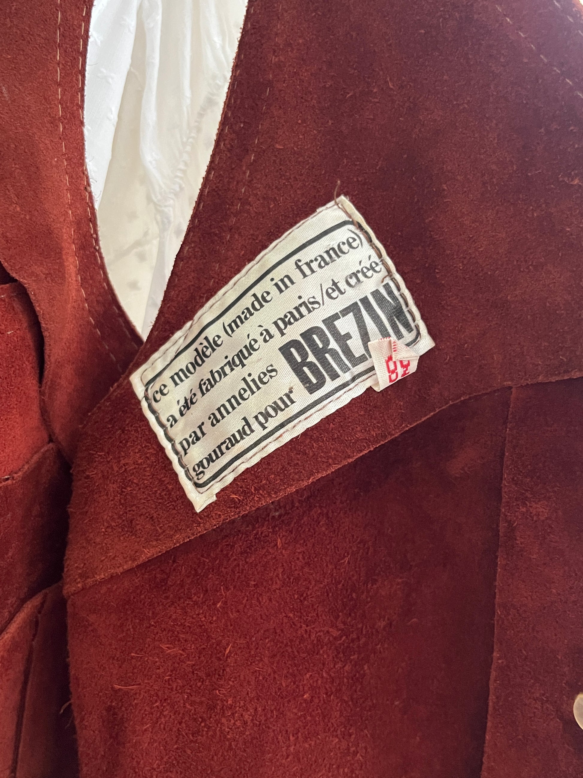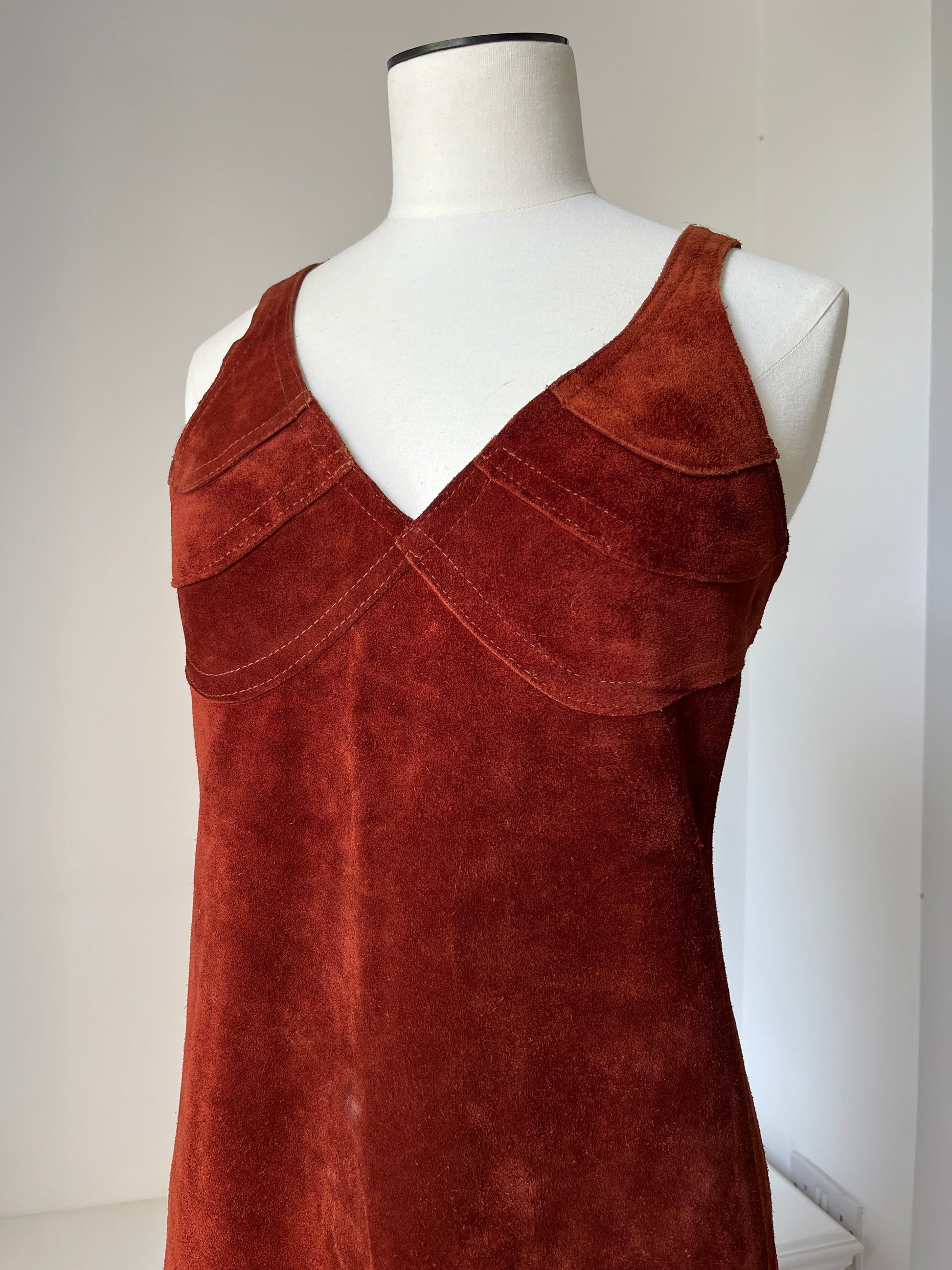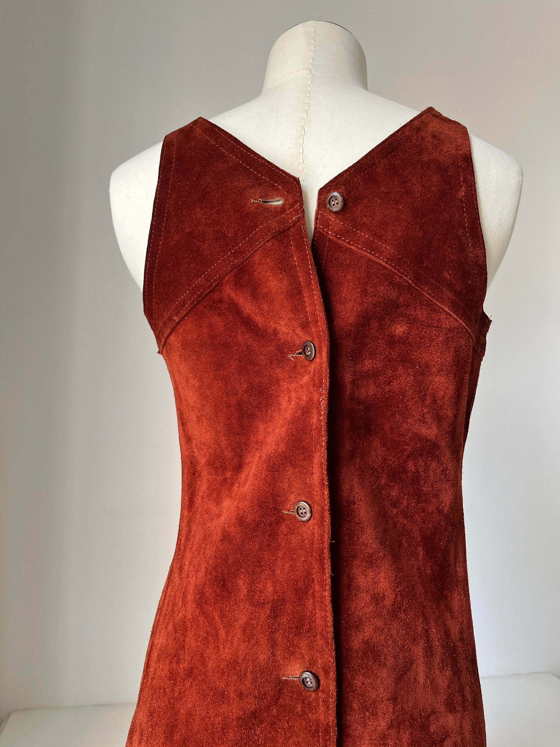An amazing—and very unusual—piece! Dating from the 1960s, this dress is cut from 100% high-quality dyed rust brown suede. It's incredibly weighty, and the craftsmanship is second to none. Made by the French brand Brezin, it features a long, slightly column-like silhouette with a pinafore-style back. The bodice has shaped cups edged with scalloping, and it fastens all the way down the back with buttons. The fit is loose, and it’s unlined. A truly rare and remarkable piece!