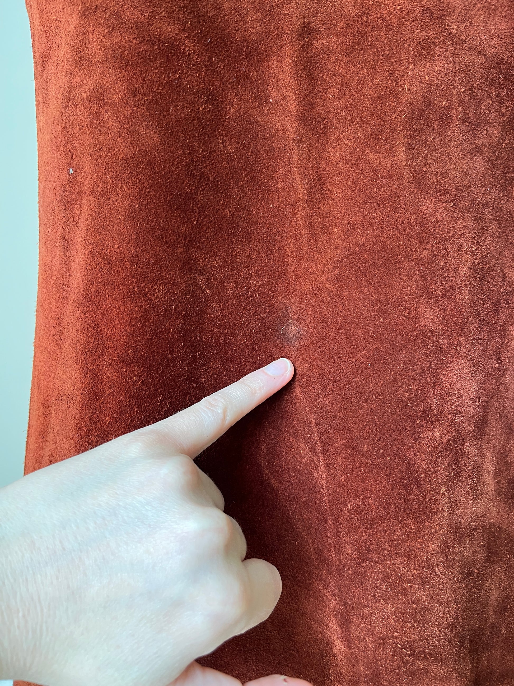 Condition: Very good. As expected with vintage suede, there is some natural fading and wear throughout. The piece has clearly been worn and loved, resulting in some colour discrepancies, mottling, and variations in texture and tone—all of which add to its character. There is one small mark at the waist that appears to be a cigarette burn or something similar.