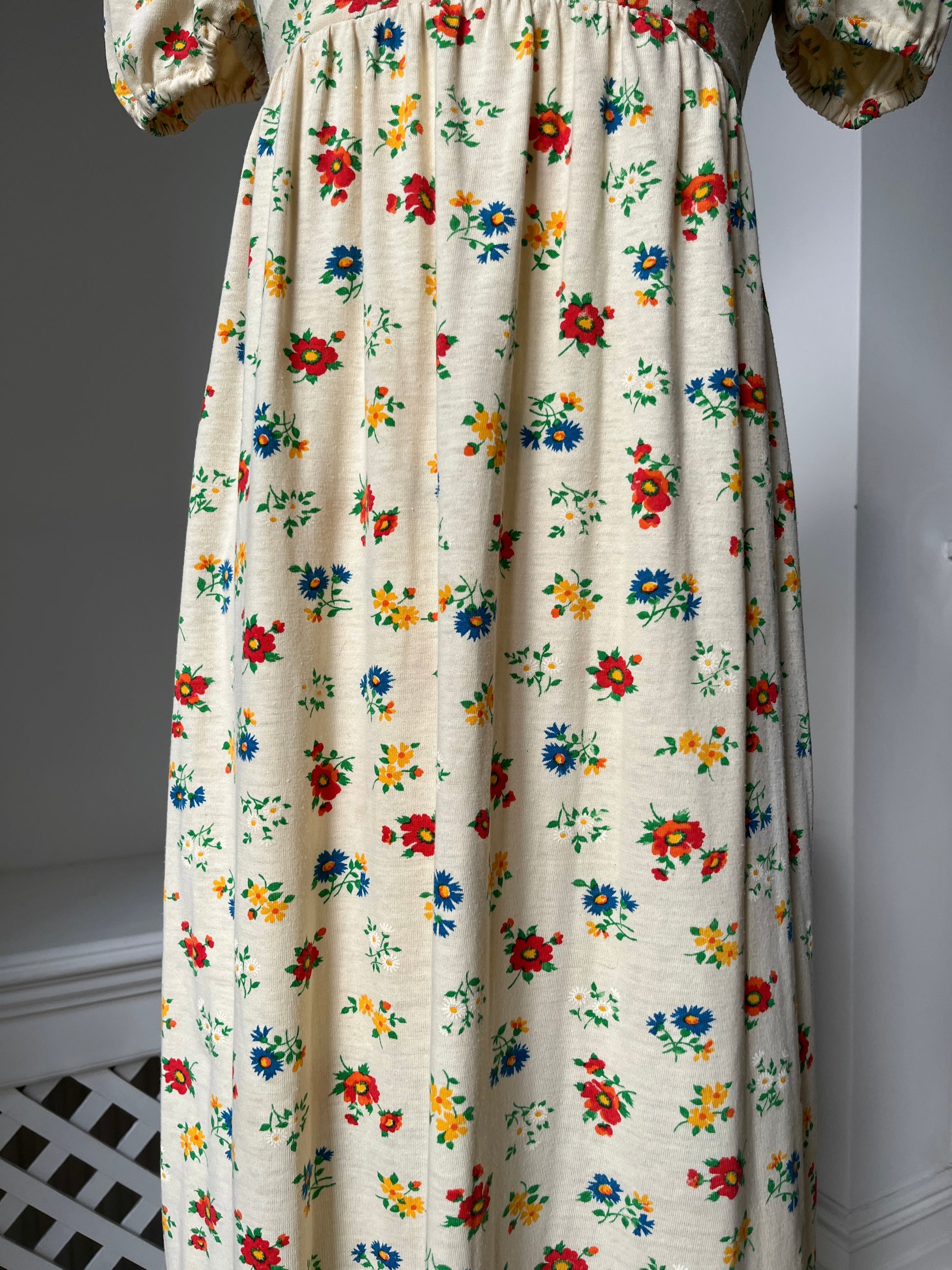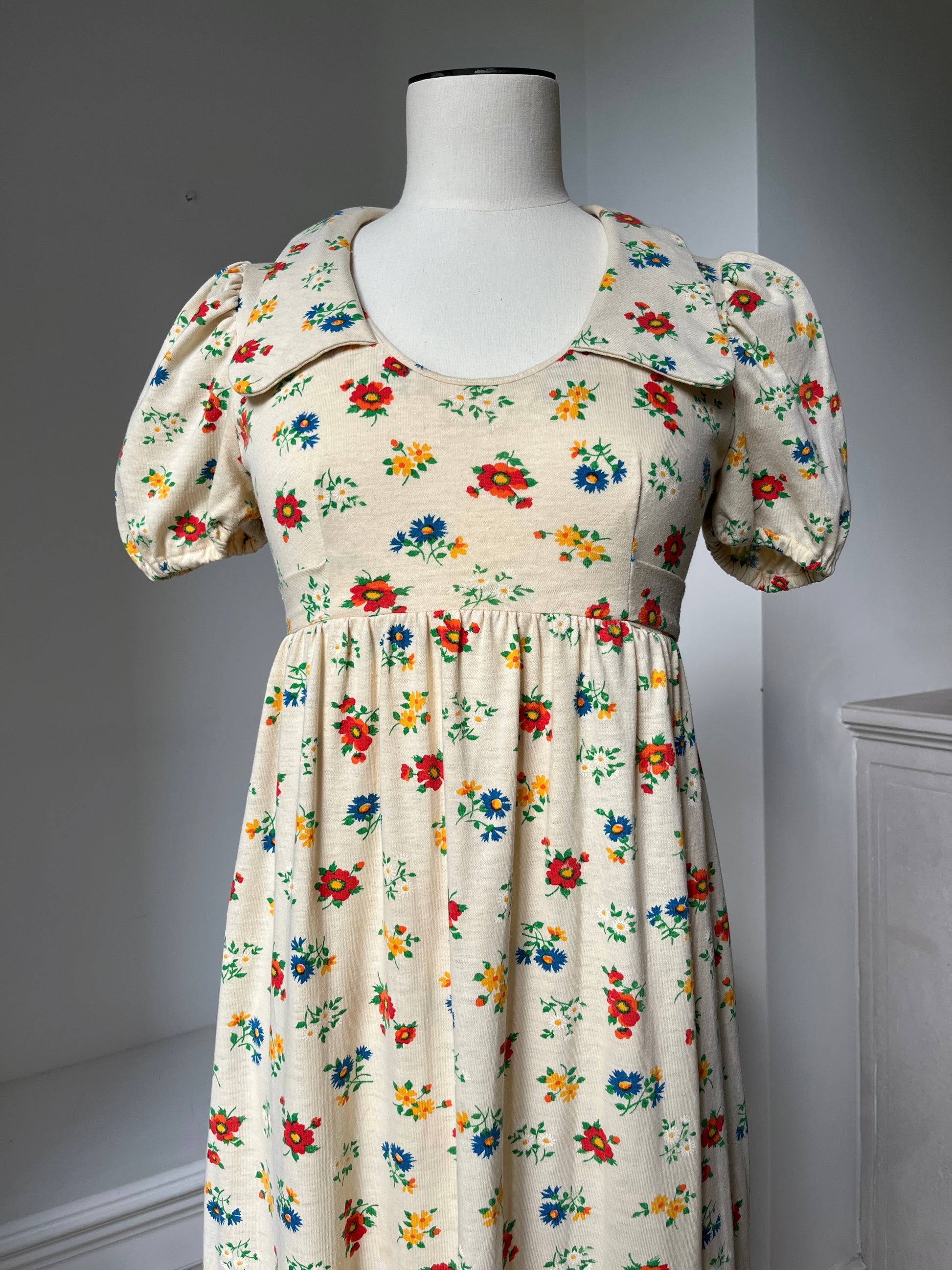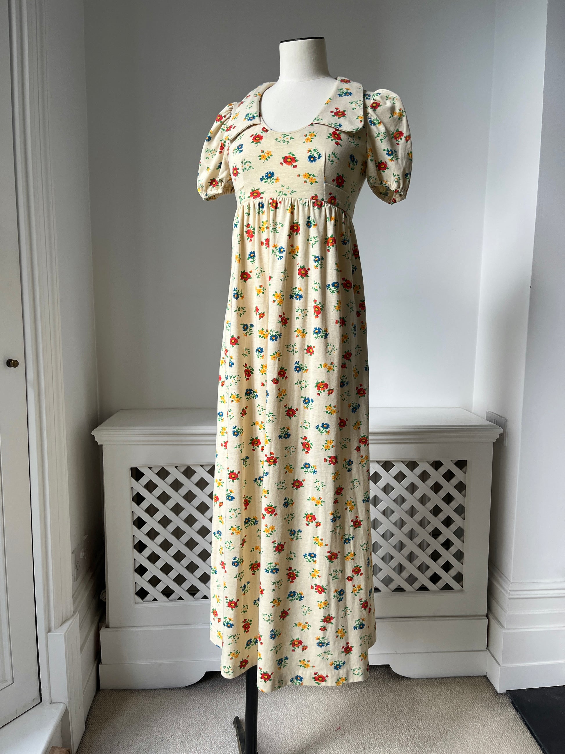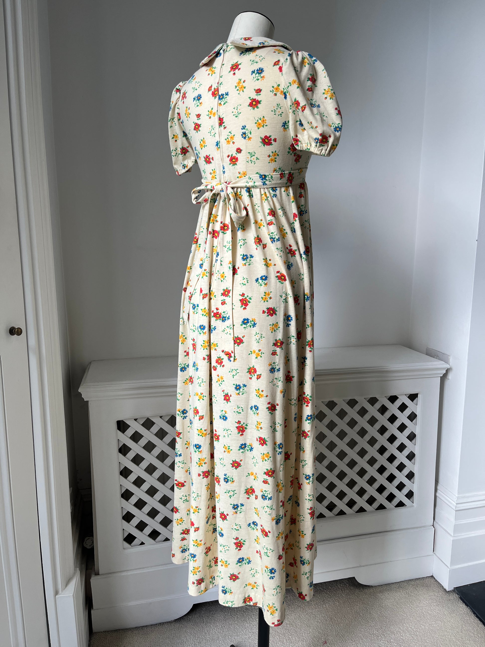 An adorable little 1970s dress and such an easy piece to wear. Most likely homemade, it’s crafted from a very soft jersey—most likely a cotton blend. It features a babydoll silhouette with a high waist, puffed sleeves, and a rounded collar. Full-length and unlined, it comes with a matching belt to cinch the waist and fastens at the back with a nylon zip. Best representation of the colour shown in photo 9.
