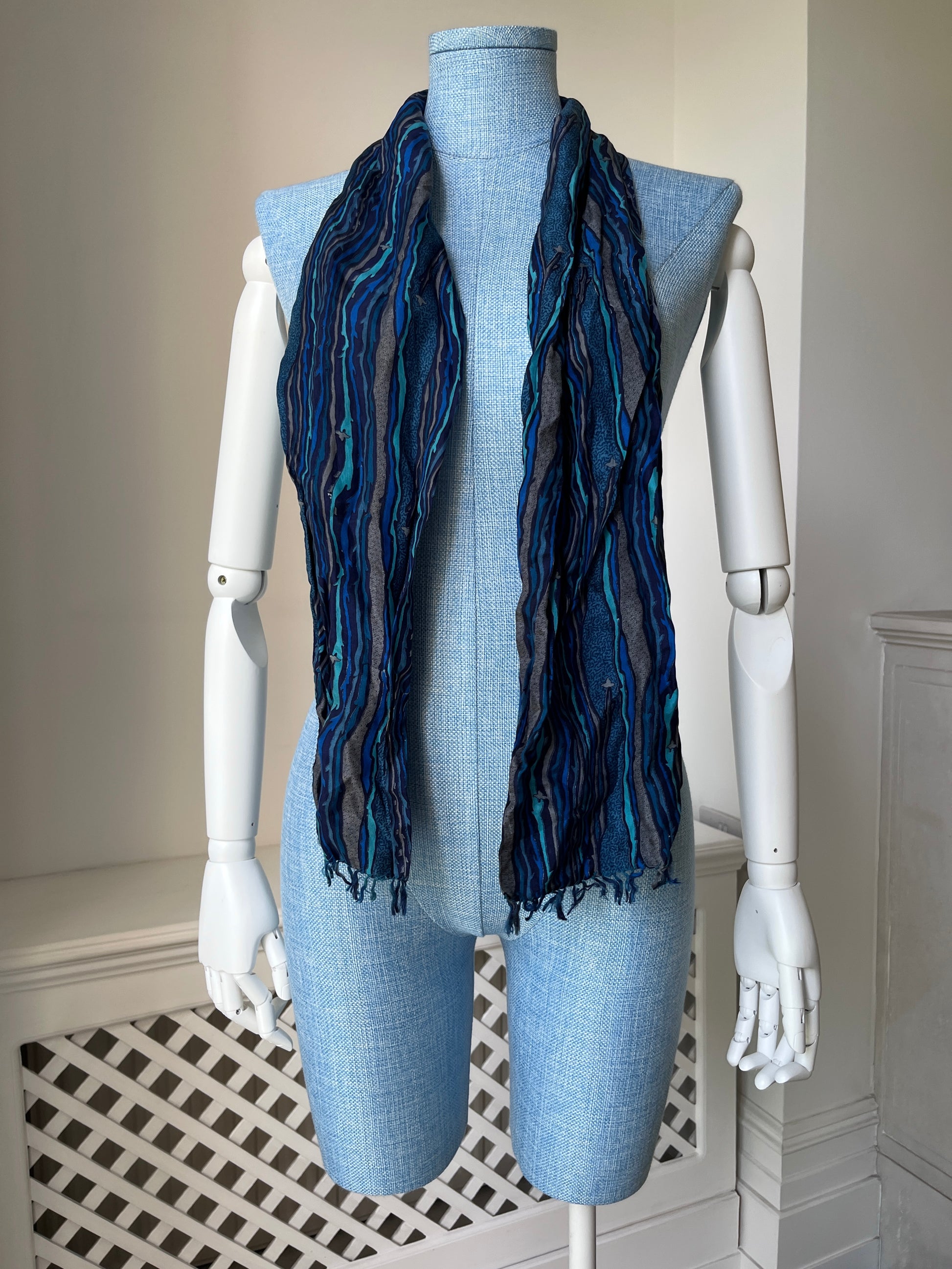 A very pretty silk scarf in vibrant shades of blue. Its long, narrow rectangular shape suggests it may have originally been a men’s cravat, but it works beautifully styled as a top too! Made from a folded sheet of printed silk, it features hand-stitched tasselled ends and machine stitching along the length.