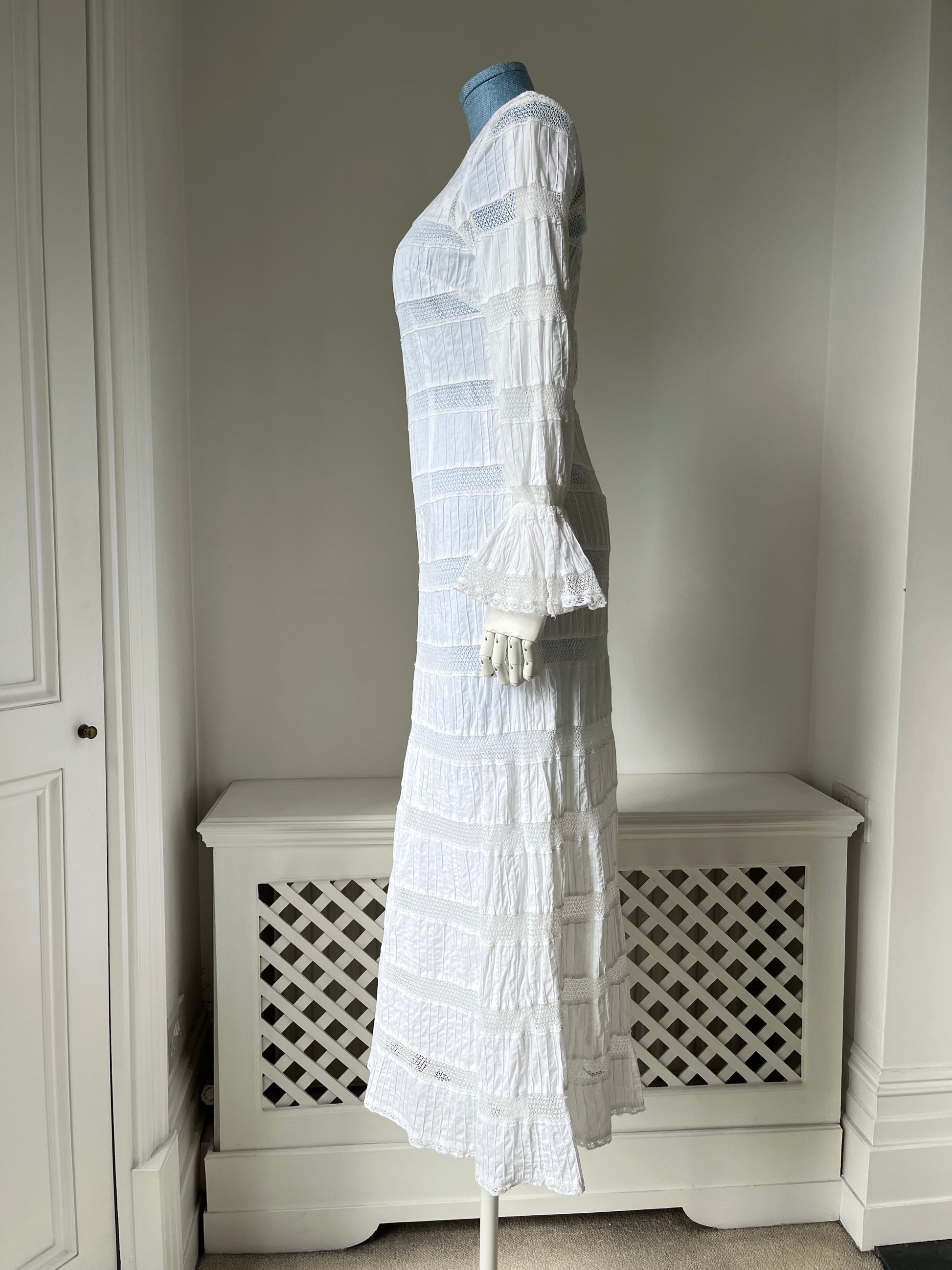 The dress has a gentle column shape, with long sleeves that finish in feature cuffs, and a square neckline. Crafted from white cotton, it’s pleated and intricately pin-tucked throughout, with panels of sheer tonal lace adding detail and depth. It fastens at the back with a long metal zip and hook-and-eye closure. The original wearer’s mother handmade a matching slip to wear underneath—it’s made from an unusual thick nylon and will be included in the sale. That said, a pair of cycling shorts and a bra would work just as well. All photos have been taken with the slip underneath.