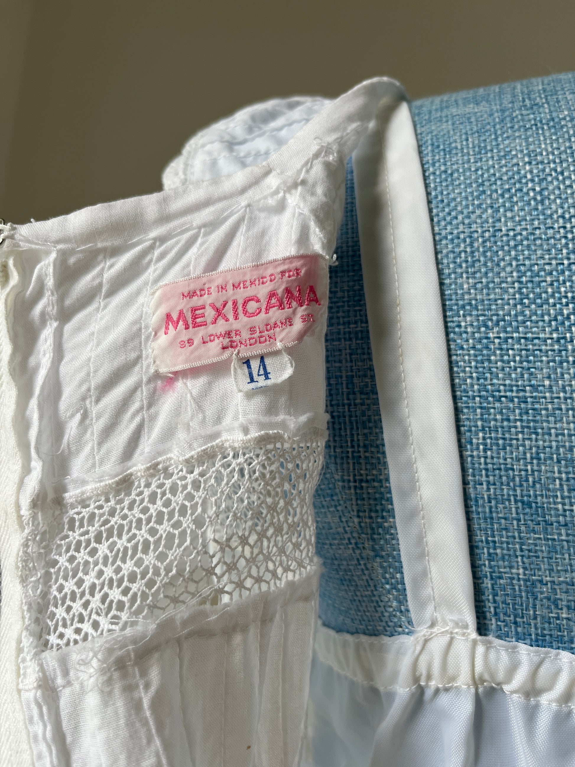 An incredible and rare wedding dress from the iconic 1970s boutique and brand Mexicana. Founded by couturier John Cavanagh and Alfredo Bouret—an illustrator who had worked with Chanel and Dior—Mexicana was celebrated for its opulent, bohemian gowns inspired by Bouret’s Mexican heritage. This beautiful piece was purchased directly from the original wearer on her wedding day in 1975 and has been lovingly preserved ever since. Ah, the memories it holds!