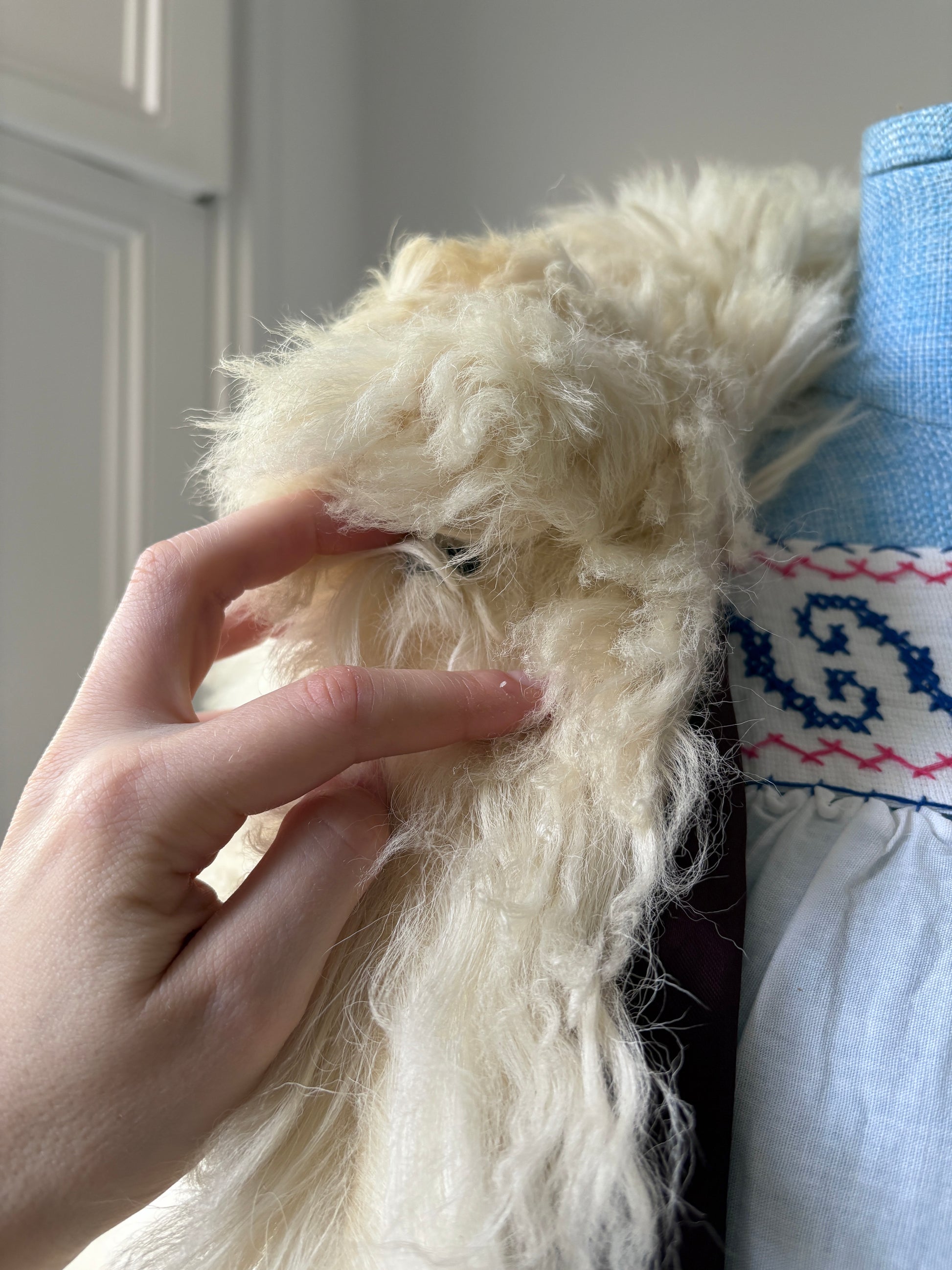 Condition: Very good. The fur shows some light signs of wear here and there, but it has been freshly brushed and presents beautifully. There’s a small area of staining near the left pocket (photo 14). Please note, this piece has been steam-cleaned but not washed. A very very slight storage smell is lingering. With a proper airing out at home this will dissipate.
