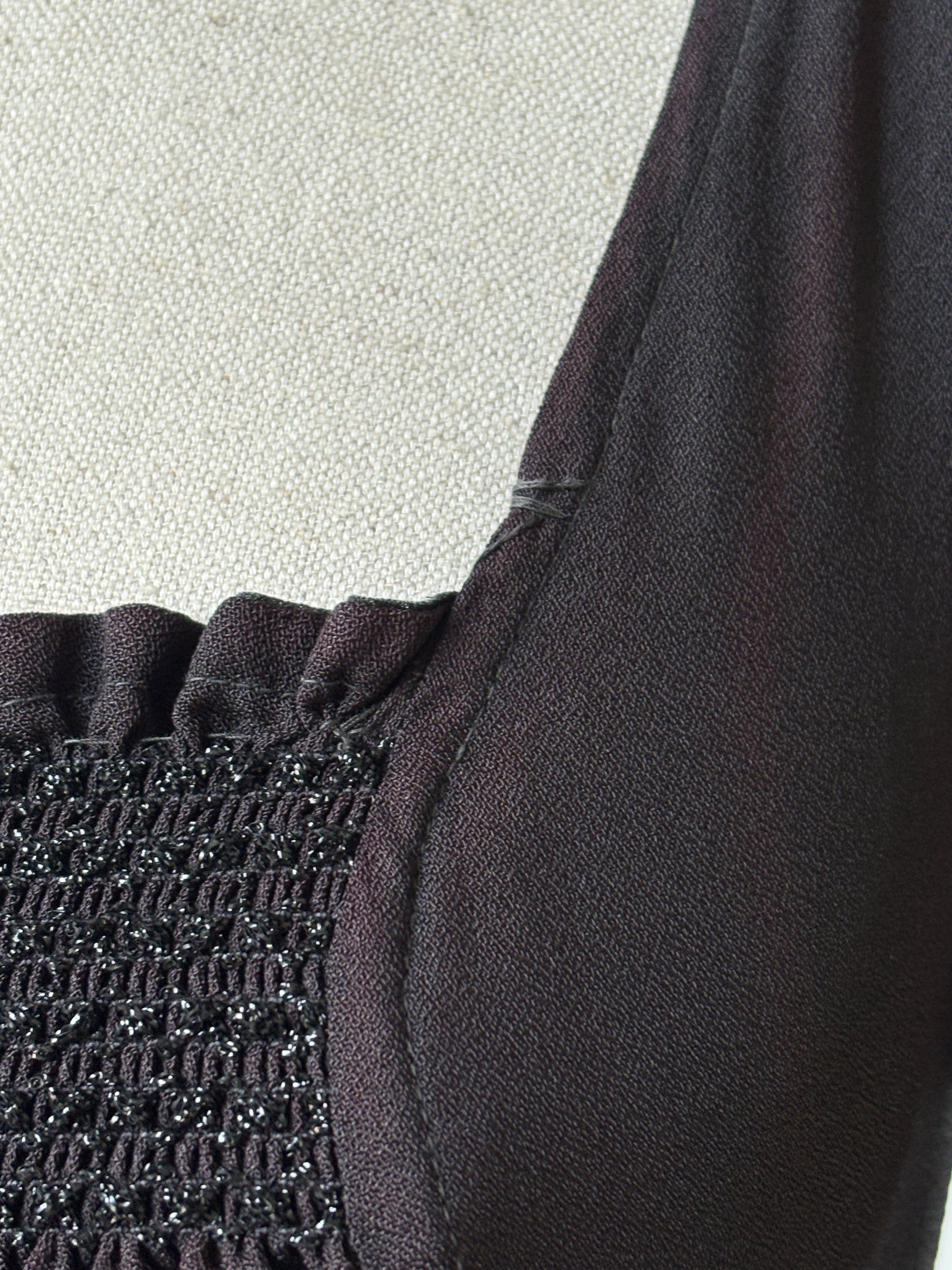 A witchy 1970s smocked maxi dress from Zanie, made from true black crepe. It features a glittered smocked bodice and cuffs, billowy sleeves, and a square neckline. The dress fastens with a zip at the back and is unlined.
