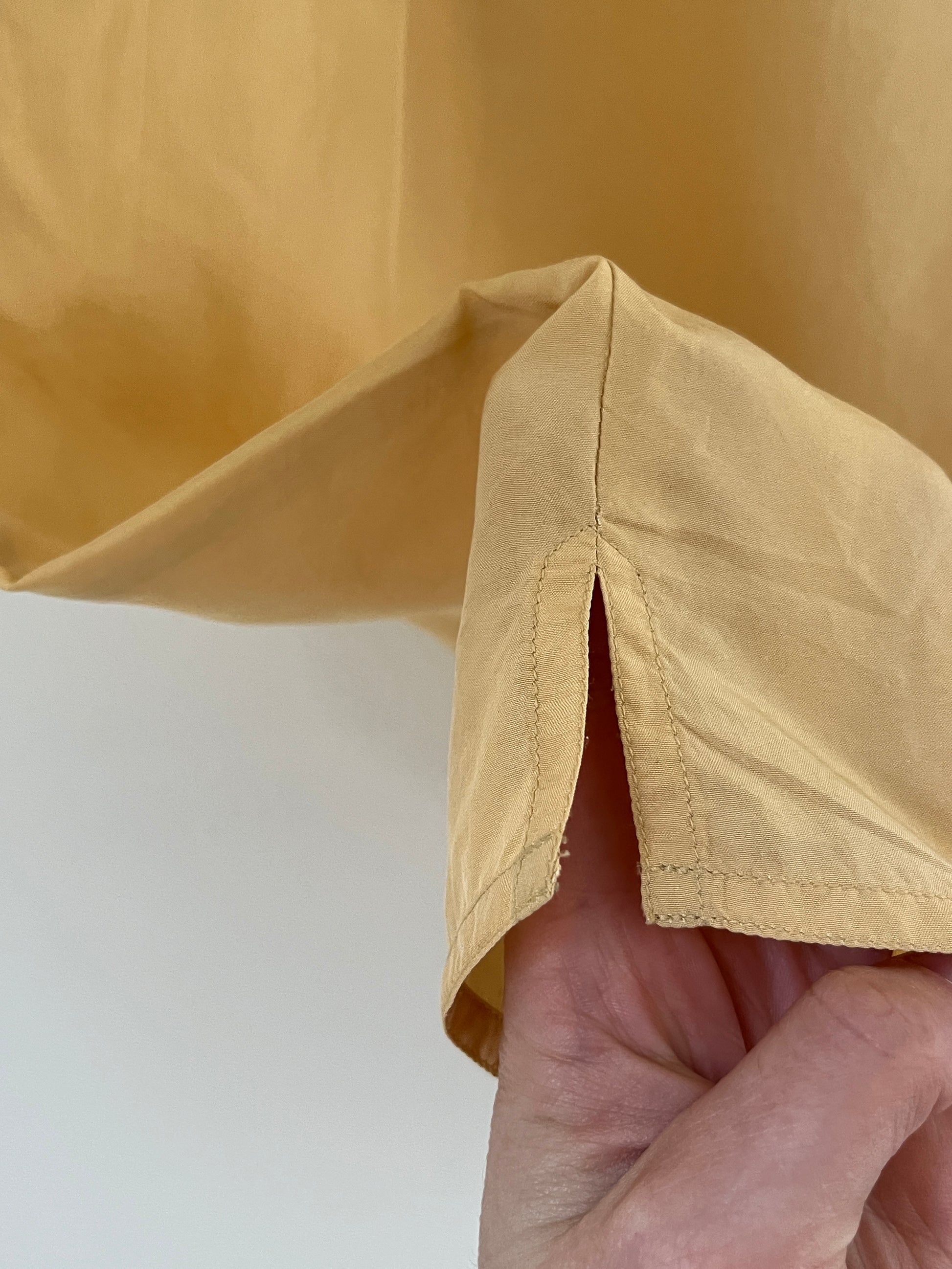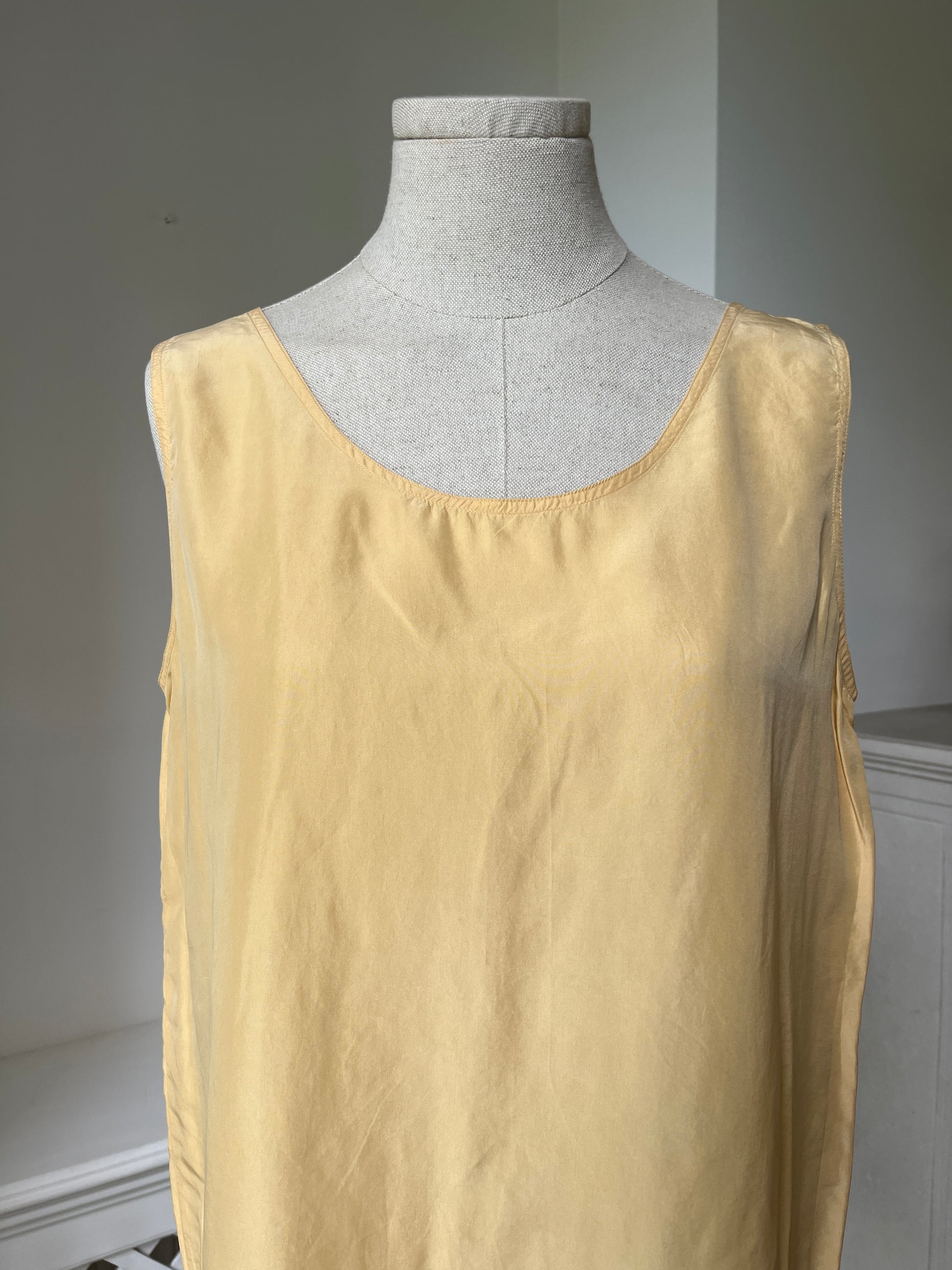 The perfect basic—crafted from 100% silk in the most glorious shade of gold and beautifully floaty. This 1980s camisole blouse is by the Italian brand Balloon and features a loose, slightly boxy silhouette with side slits for movement. It has no closures and slips on easily over the head. Wonderfully lightweight and ideal for throwing on during hot summer days. Photo 1 is the best representation of the colour.