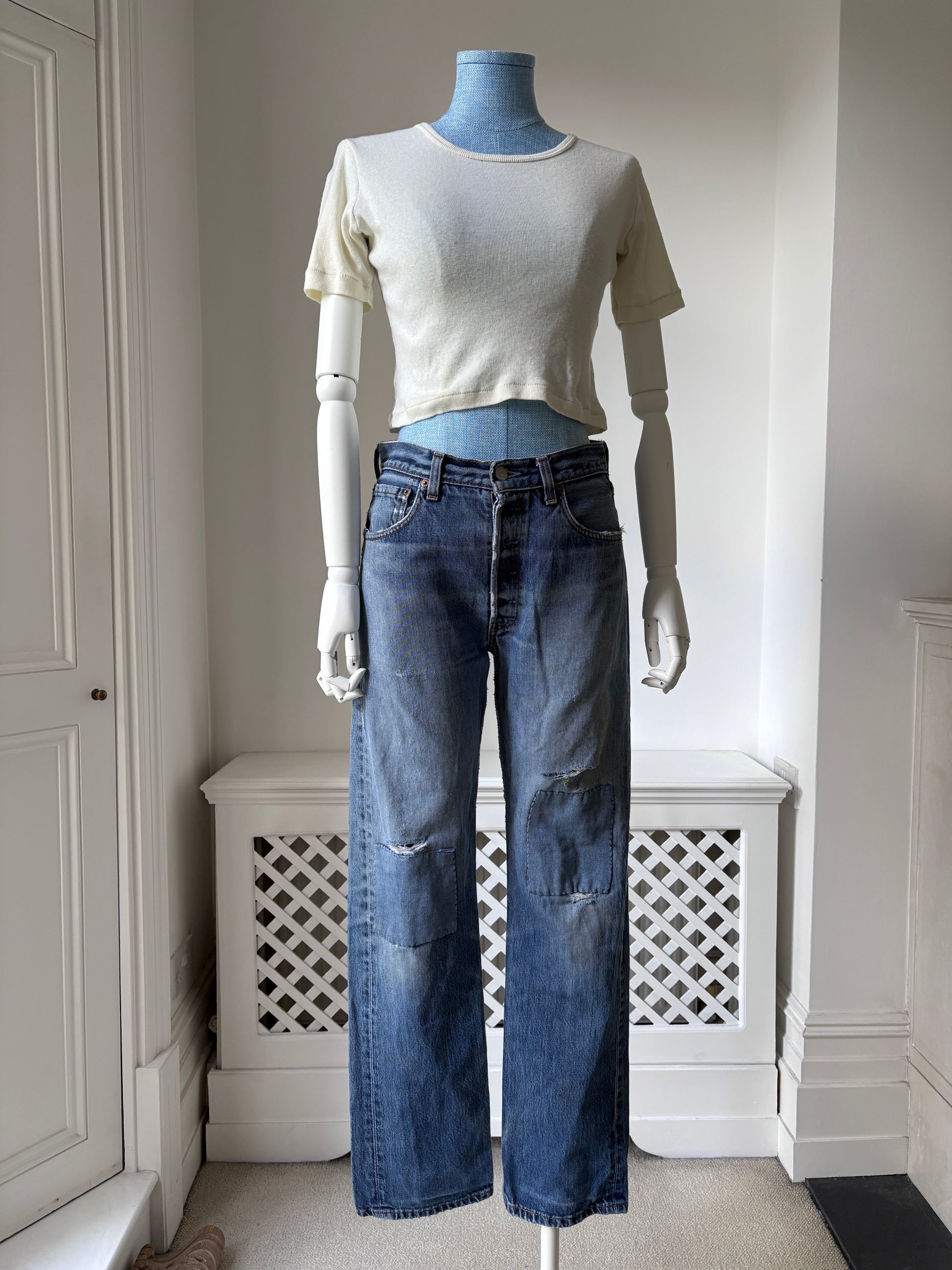 Condition: Very good/good. These jeans show natural fading, holes, fraying and two large patches, all of which contribute to their worn-in charm and character. There is a larger faint stain just under the right knee, but aside from that, there are no other stains of note. Please note: they have been steam-cleaned but not washed.