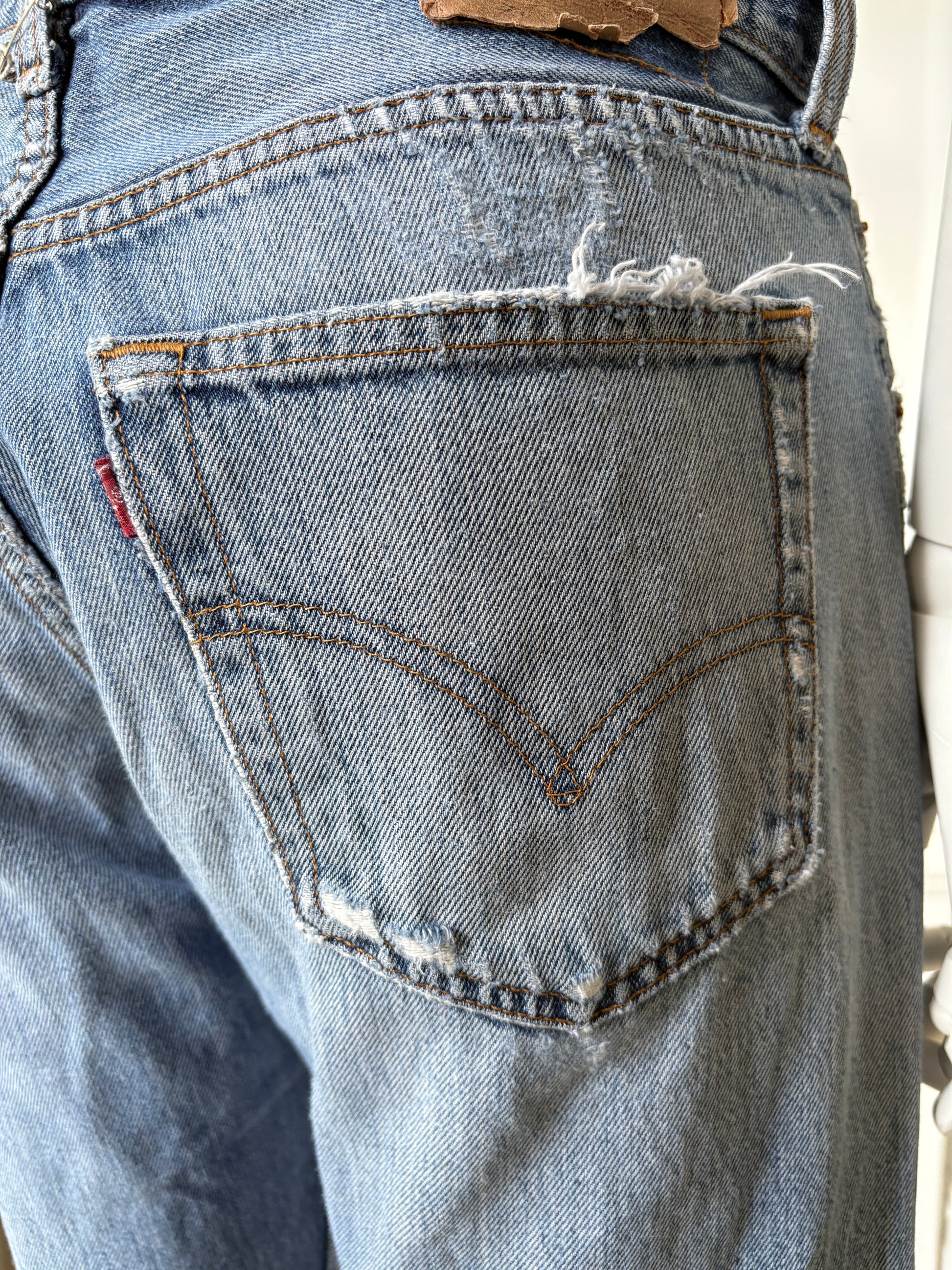 Be still my beating heart... These Levi’s 501s are so good that if they fit me, I’d probably never take them off! Dating to around 2003, they may not be the oldest pair, but they have all the character you’d want. Made in Canada from 100% cotton, they feature that perfectly worn-in look with beautiful fading, patching, holes, and fraying along the legs. These are the beat-up, lived-in 501s that define why this style is so iconic—the ultimate throw-on-and-go jeans.