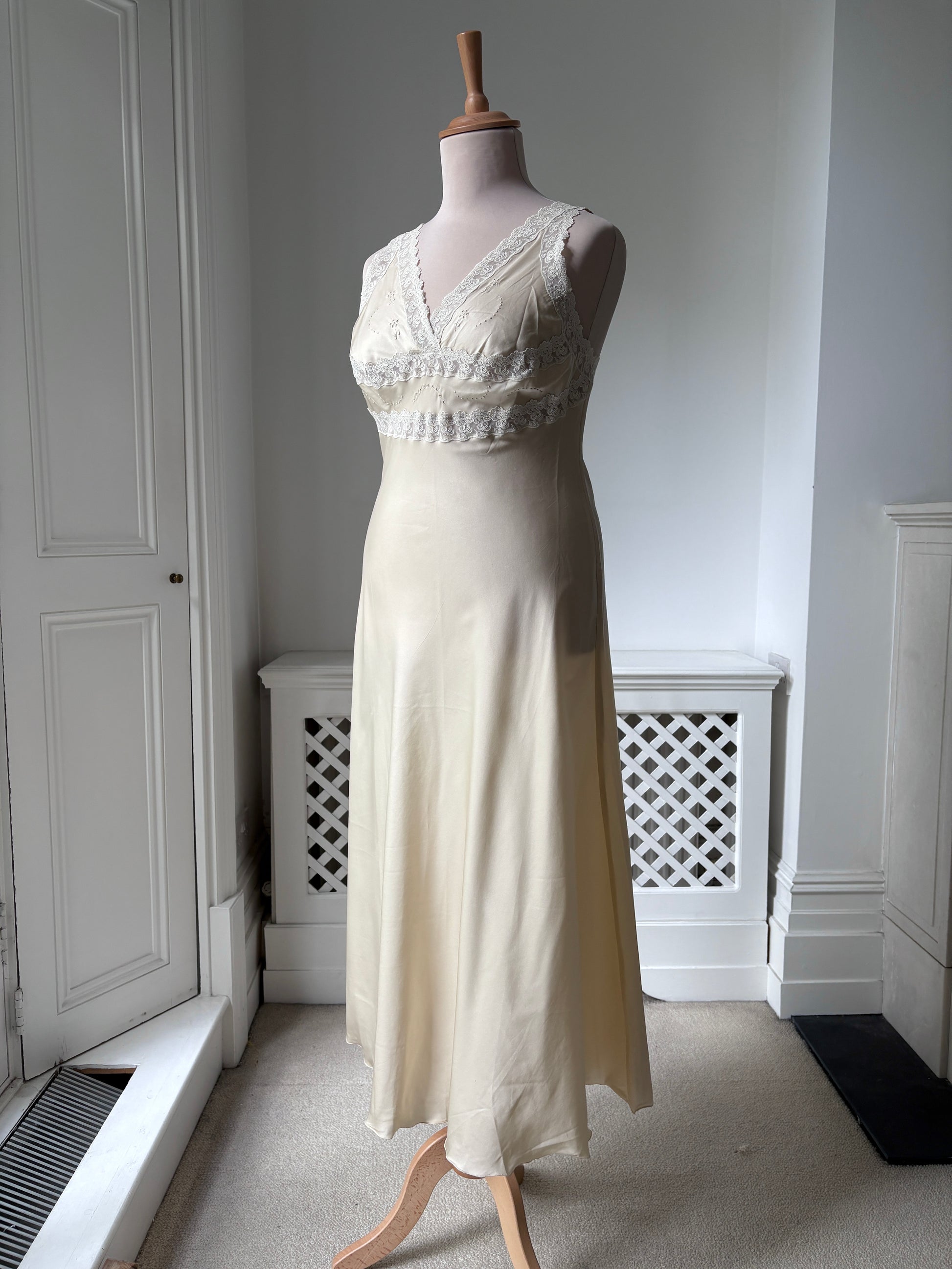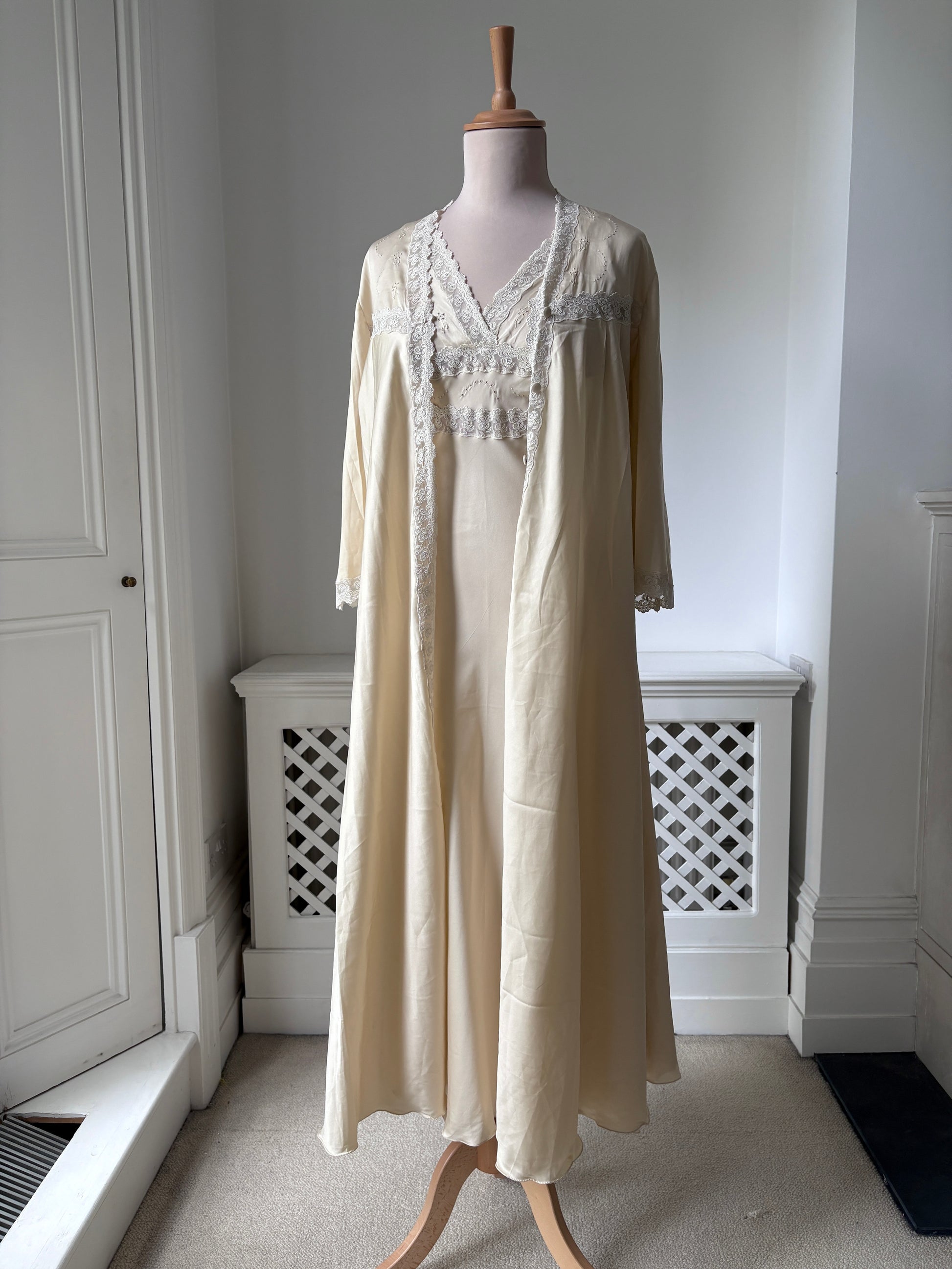 A great set for a bride! Dating from the 1980s, this beautiful cream set has a warm, yellow undertone and is made up of a slip and a matching full-length peignoir, both featuring detailed lace trim and embroidery.
