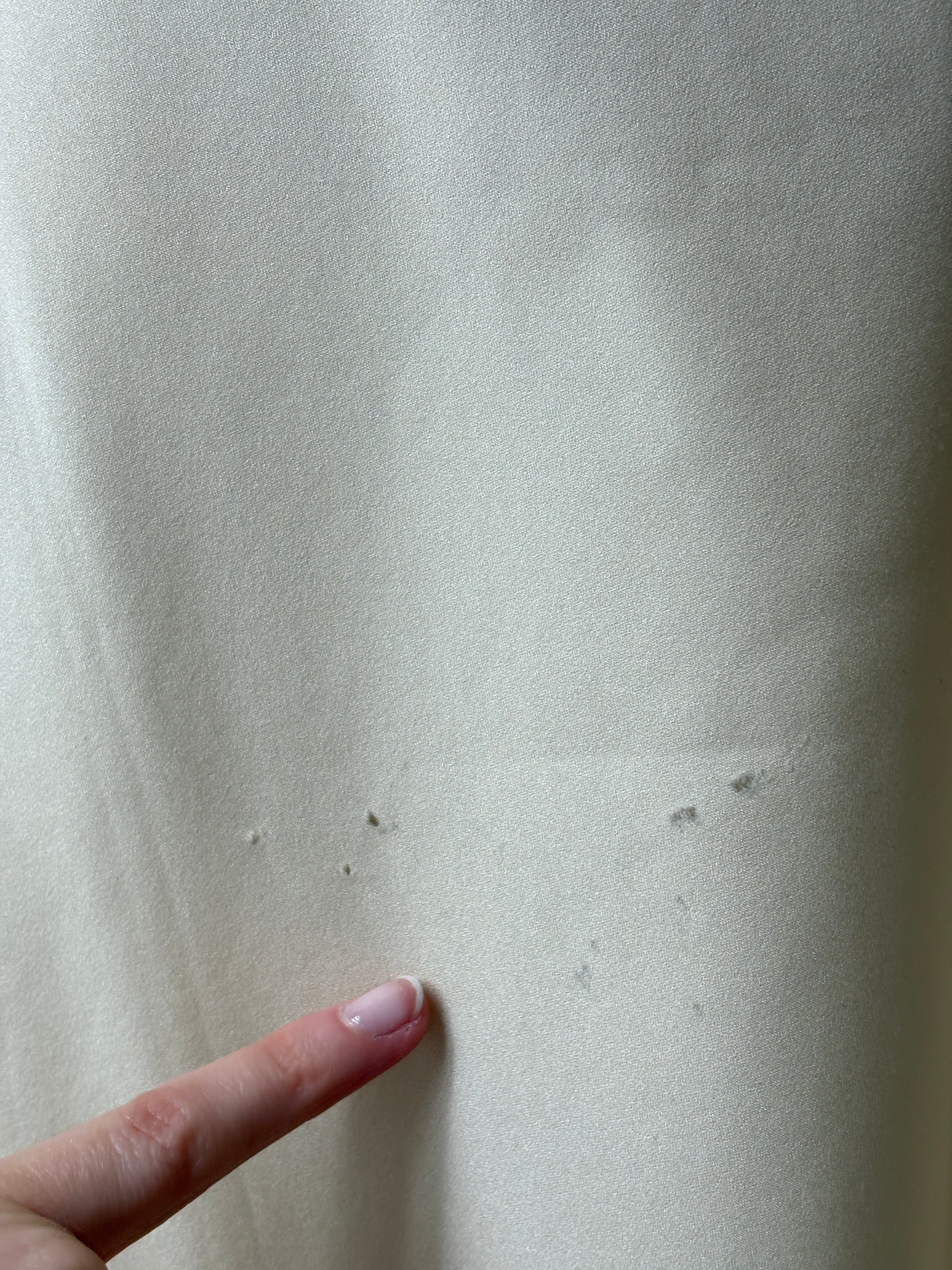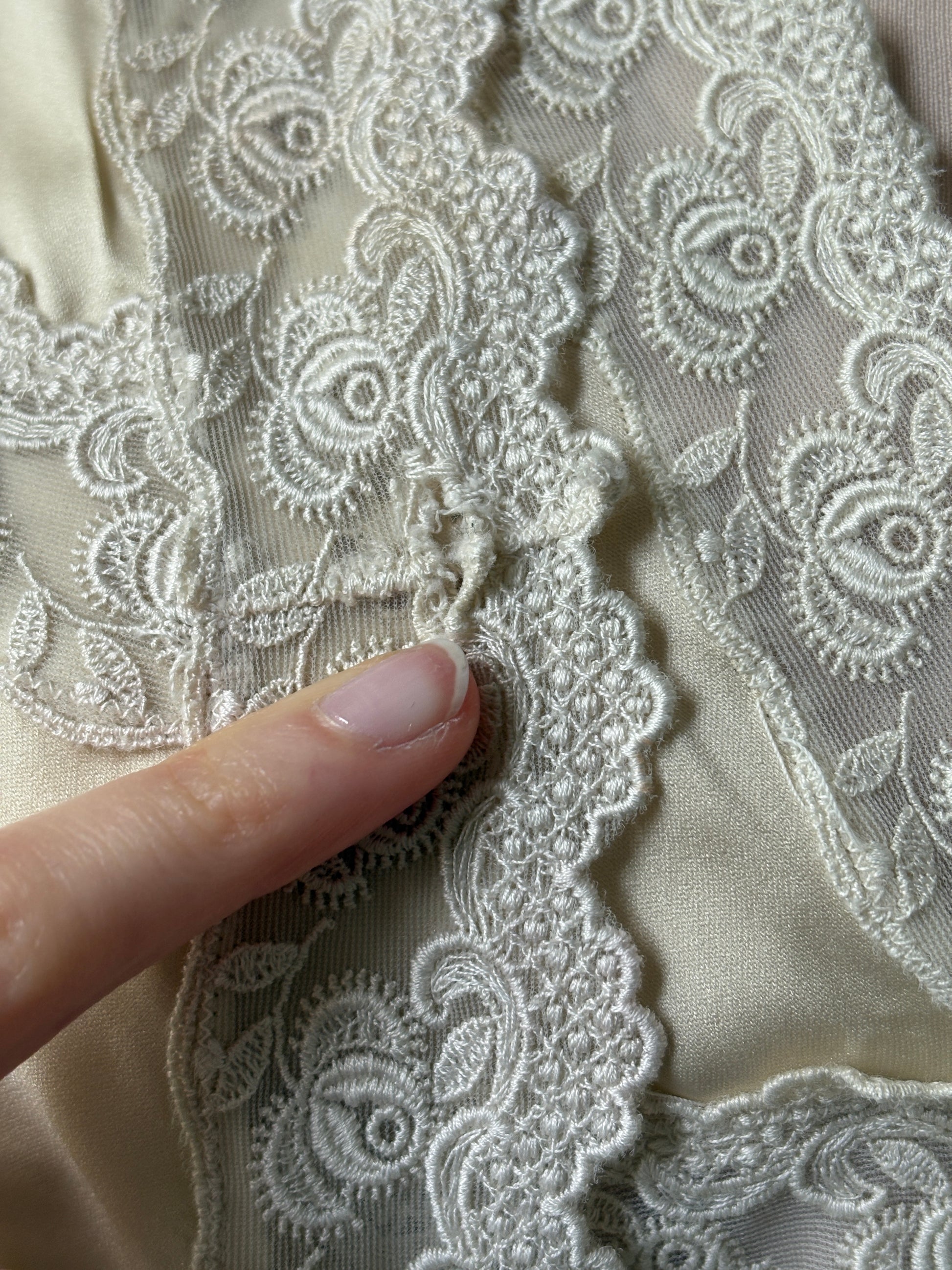 The slip has an area of hole-ing and some fabric fragility at the back (photos 10-12), as well as two faint stains near the right-hand side of the front skirt that have not budged with treatment. These are very light and only visible when the fabric is held up to the light. (photo 13)