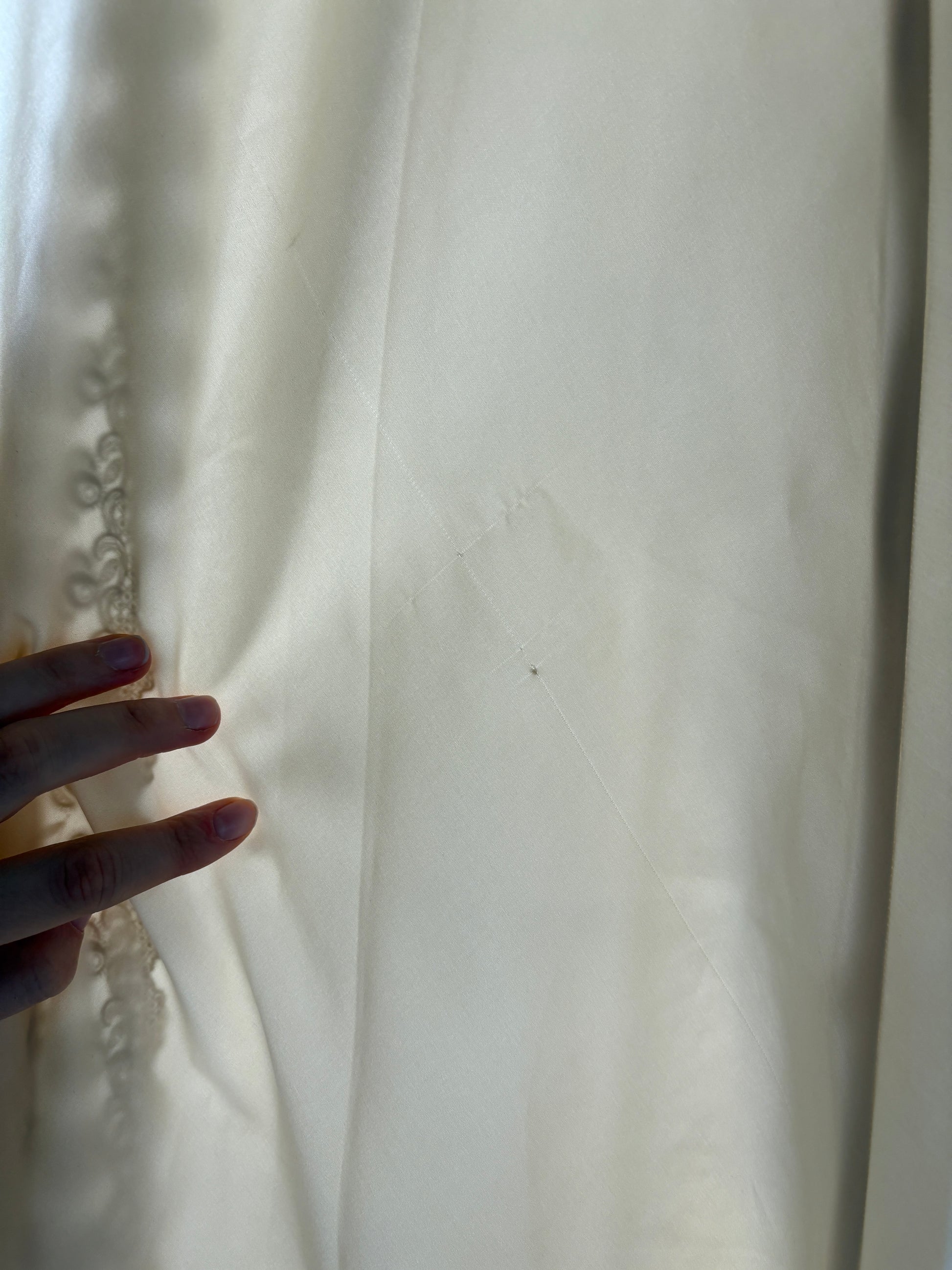 Similarly, the peignoir has a larger faintly marked area that appears almost like water staining, again only visible when held up to the light (photos 14 & 15). Both areas are subtle but have been factored into the price.