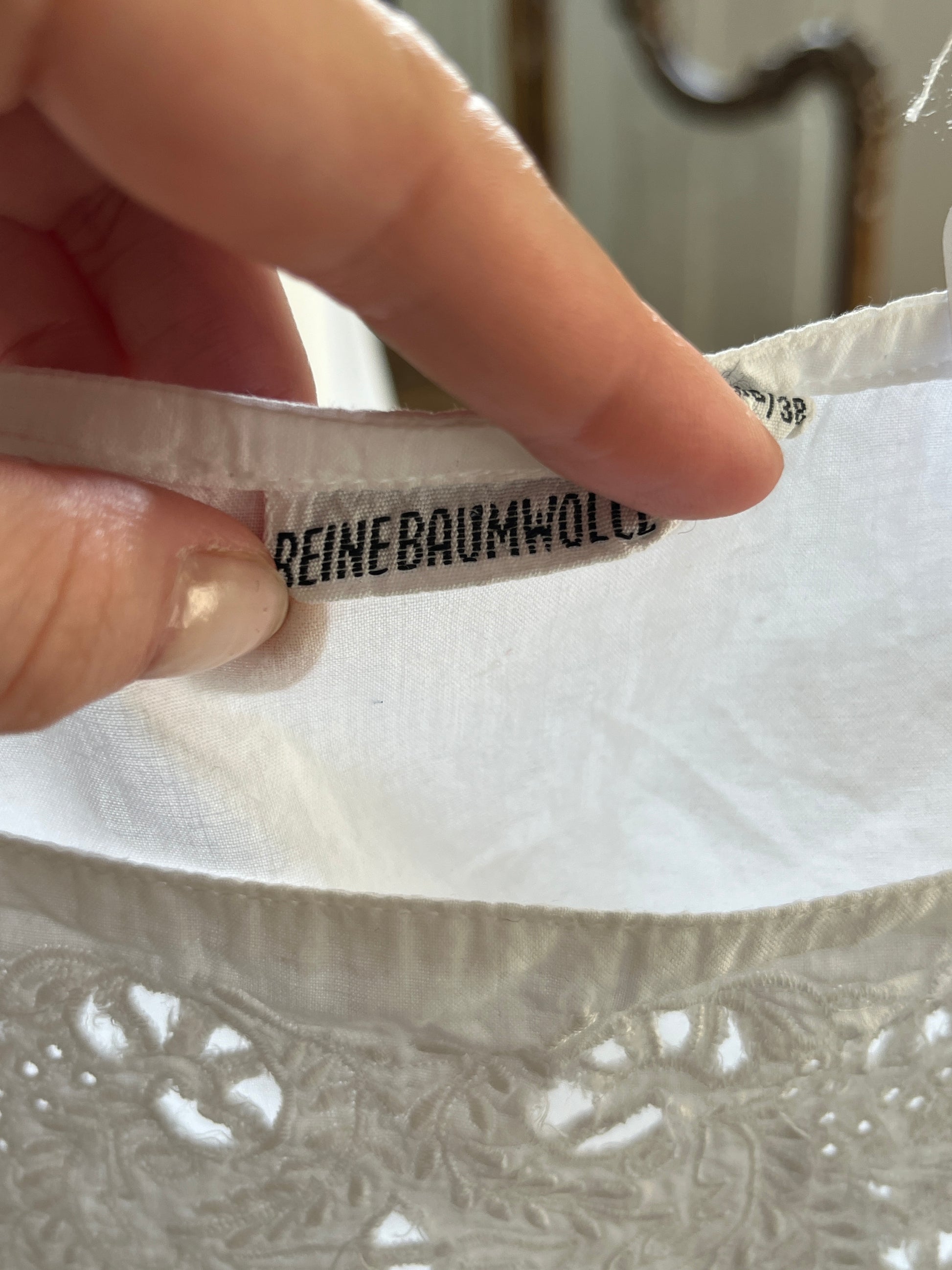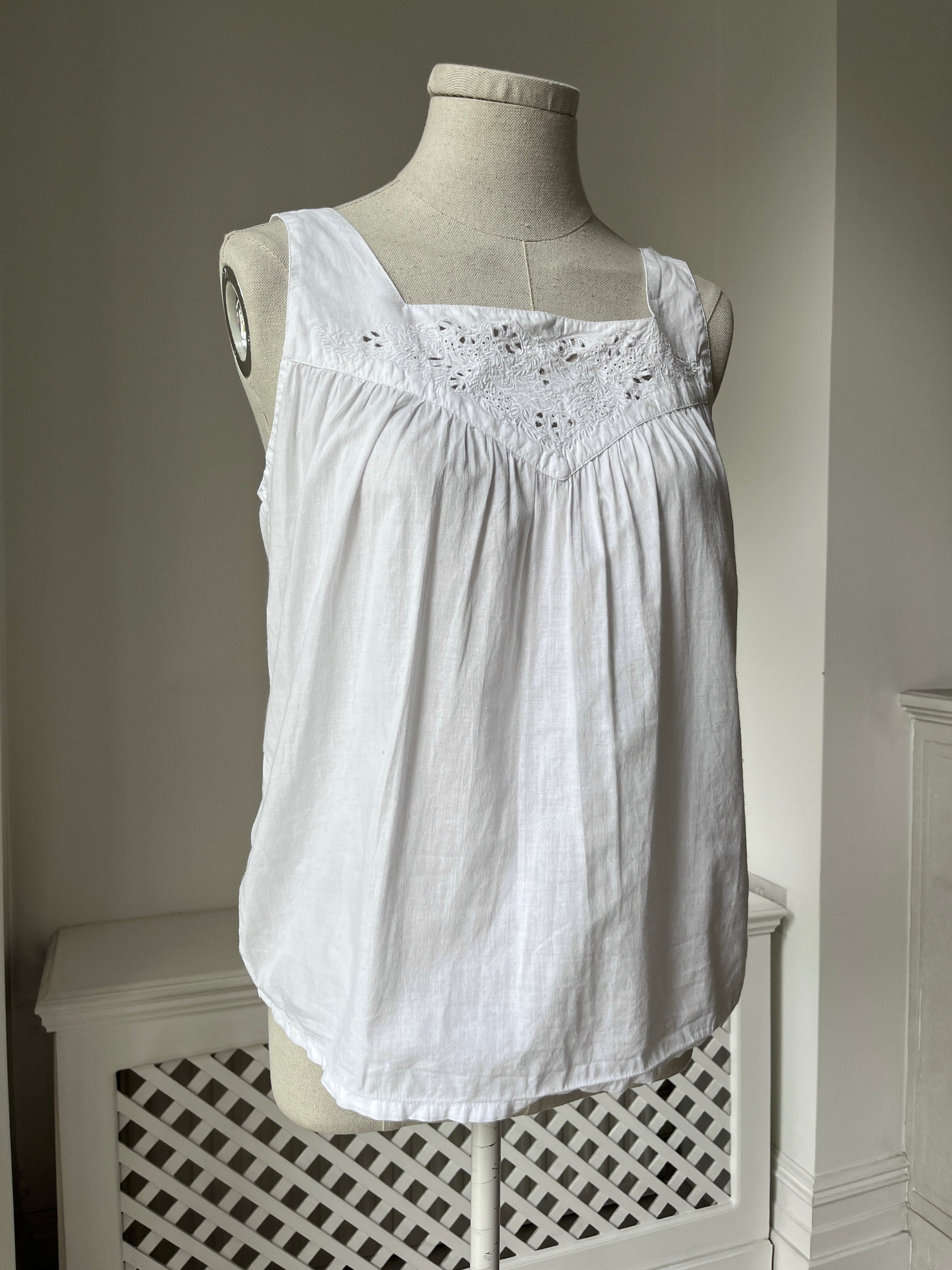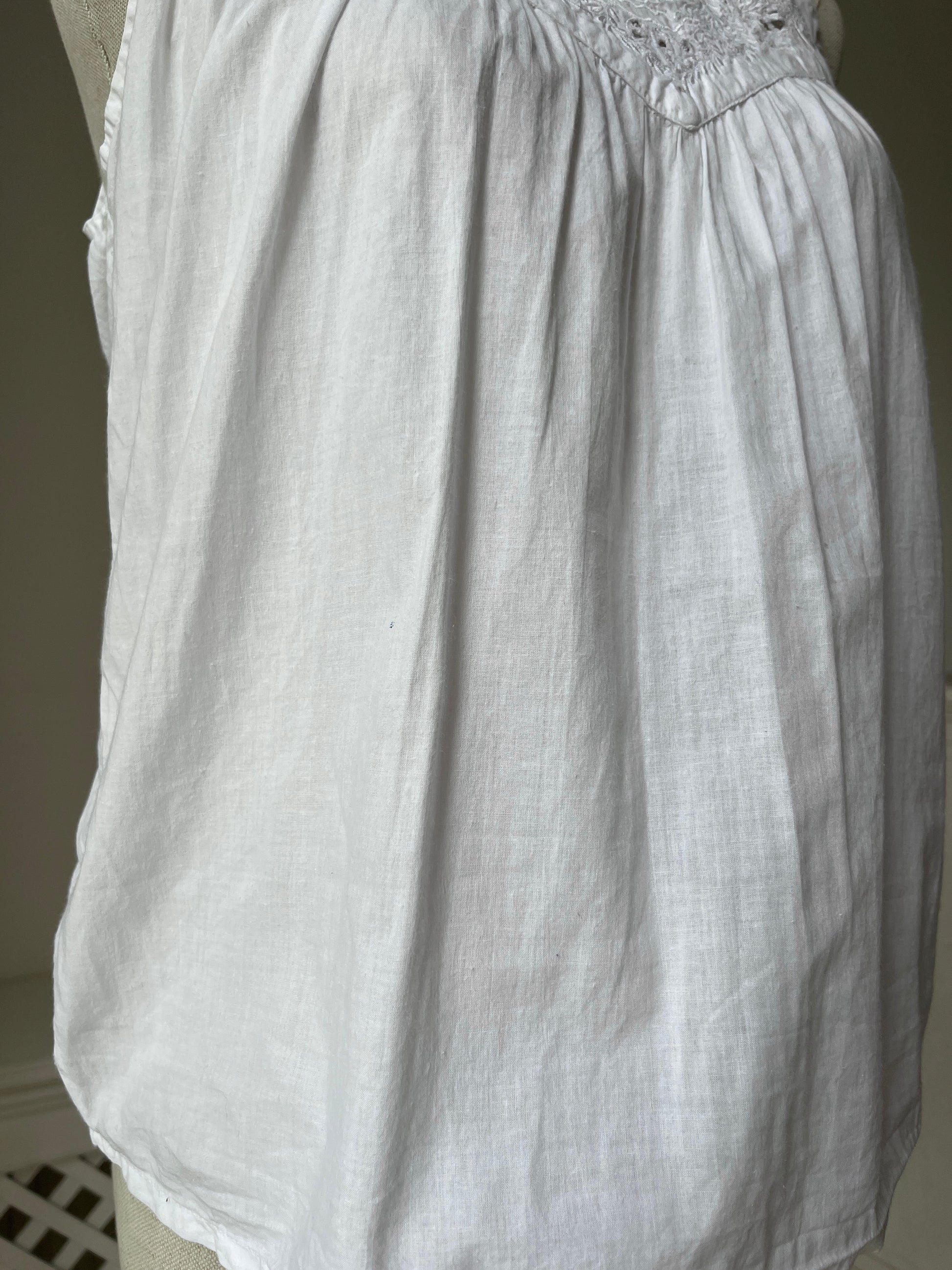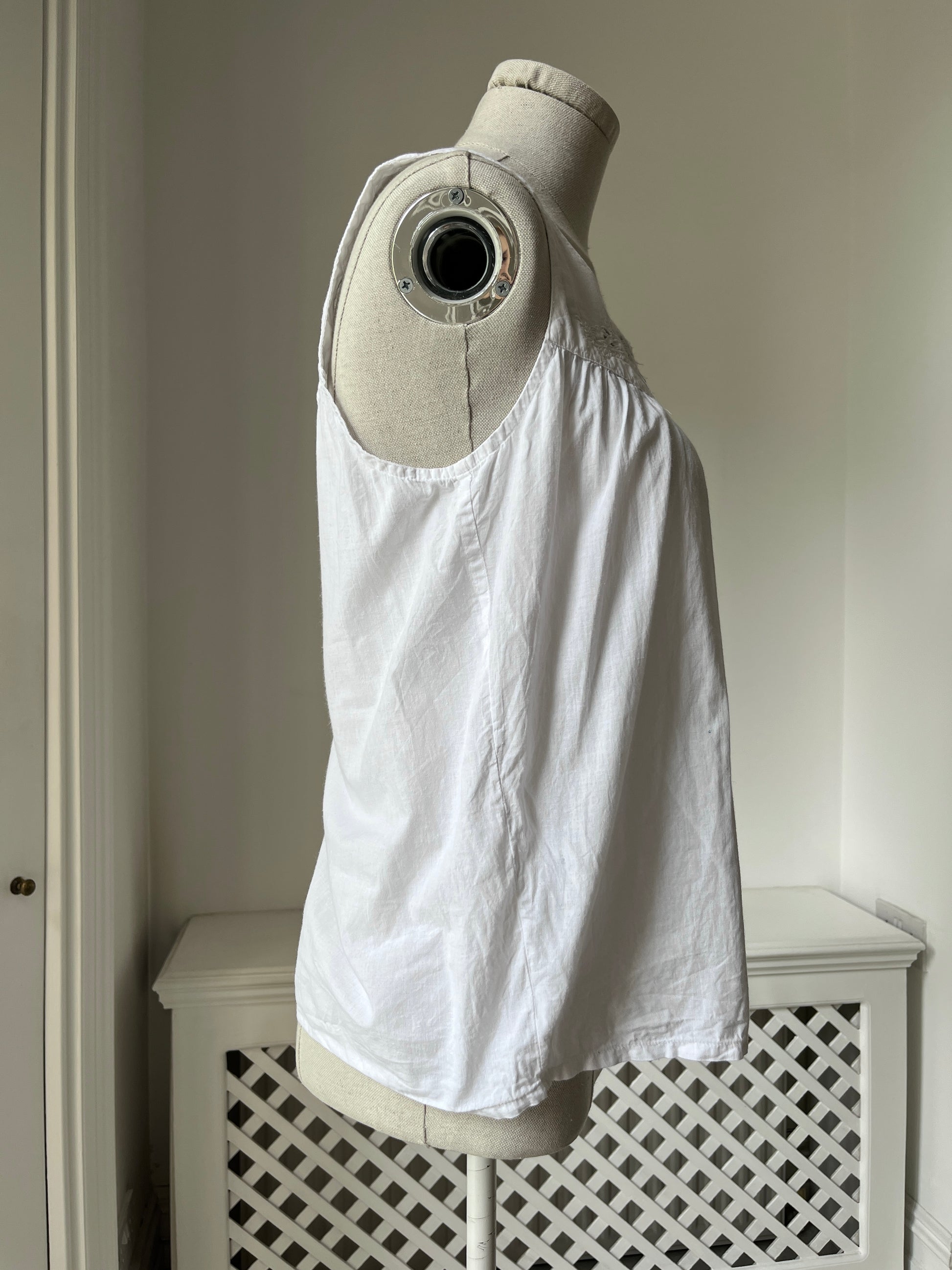 A sweet little cotton camisole, finished with delicate embroidery. It has a loose, slightly boxy silhouette with a square neckline and slim strappy sleeves. There are no closures, designed simply to slip on over the head. Wonderfully lightweight and breathable, it’s the perfect piece for layering—or for wearing on its own during hot summer days.