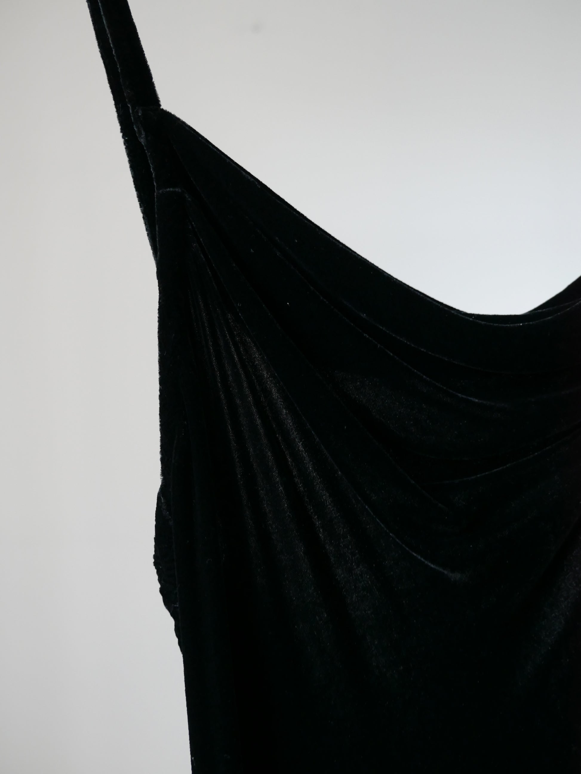 An unbelievable showstopper from early 2000s Ghost. Made from a black viscose and silk velvet blend, it’s cut in a clean, slinky silhouette with a soft cowl neckline and an ultra low-cut back. Fluid, elegant, and undeniably sexy, with beautiful movement when worn.