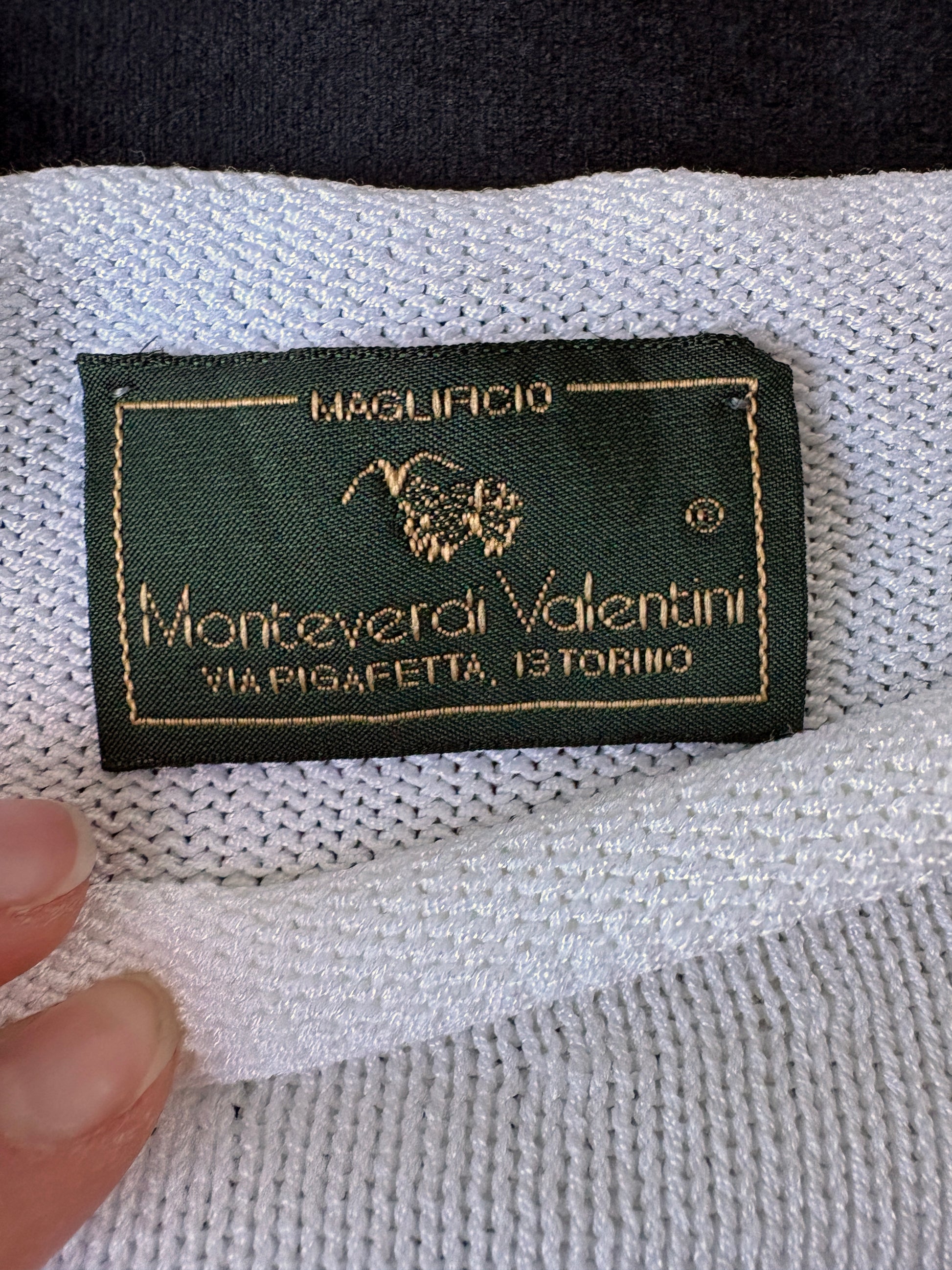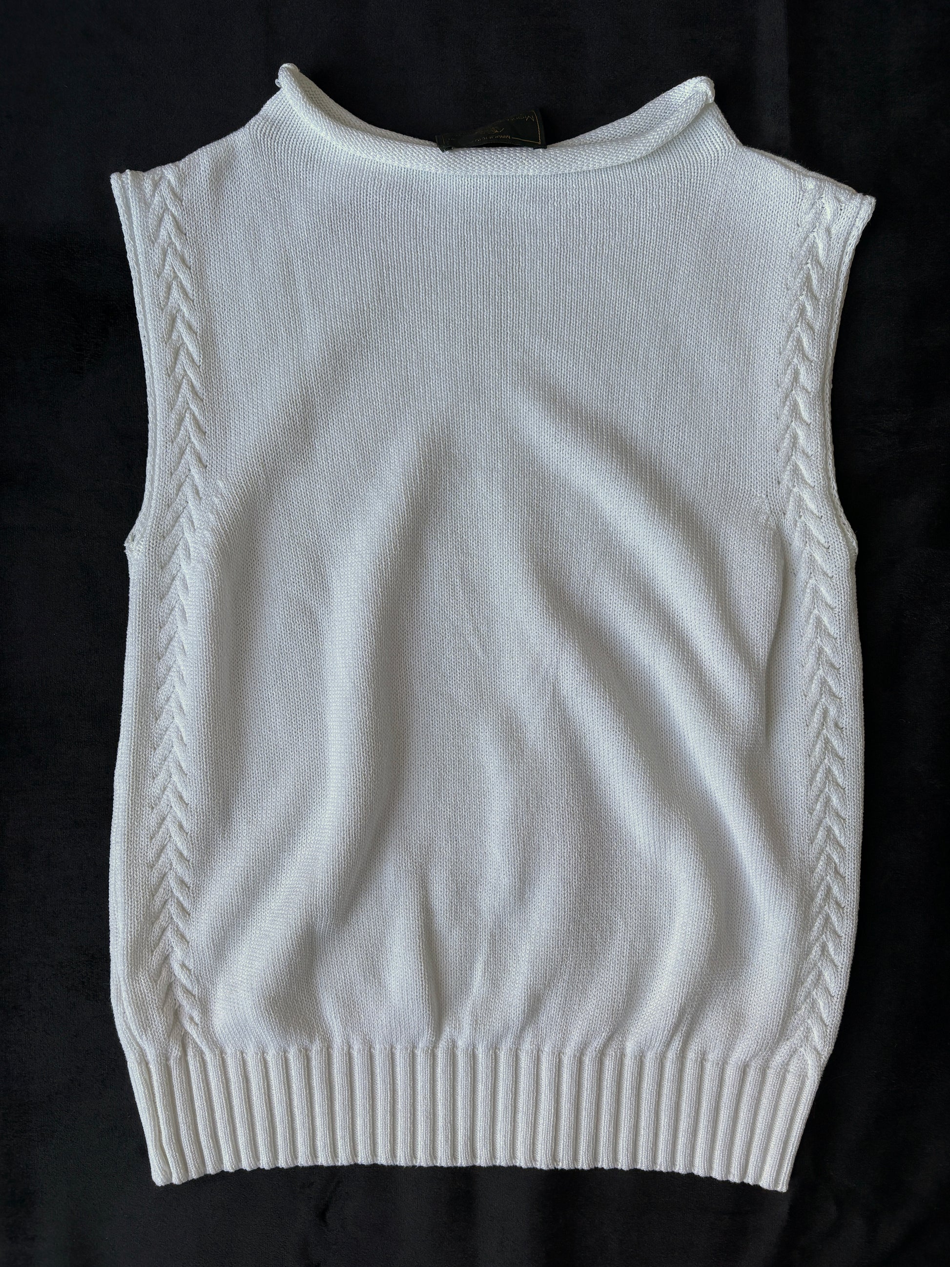 A great little 1990s knit with a faux neckline, from Monteverdi Valentini. Very Calvin Klien style! Made from a lightweight knit that feels like an acrylic blend, it comes in a true white shade. The sleeves are finished with subtle braid-style detailing. A material label is present, but the writing has washed off and is no longer legible.