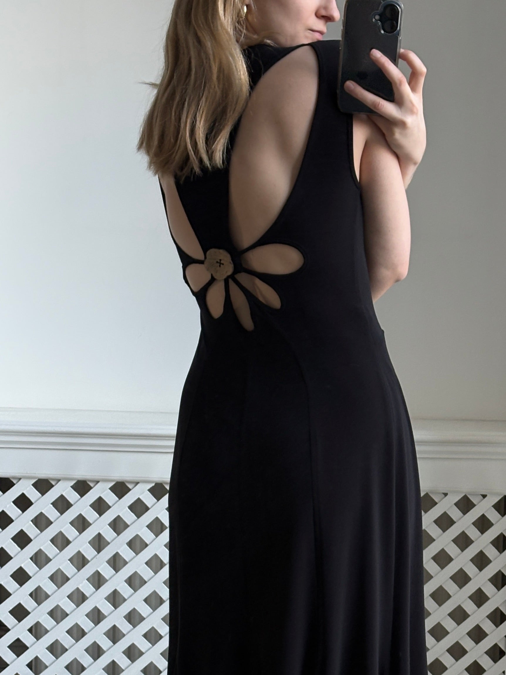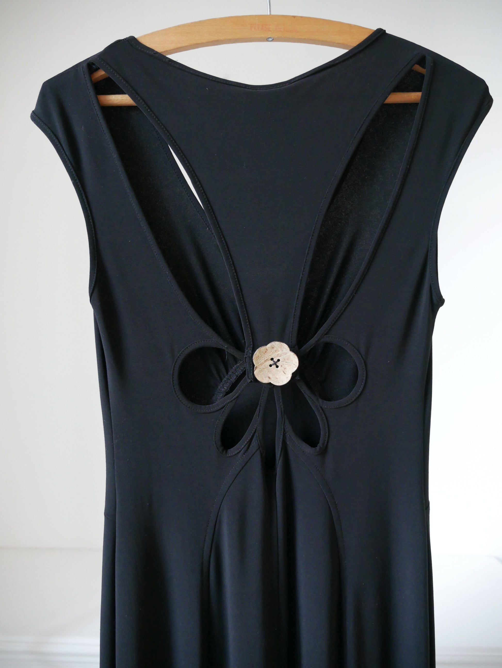 A very cute 1990s black dress by Joseph Ribkoff. Made from a heavyweight stretch polyester blend with a smooth, slinky feel and great movement. It has a nicely tailored silhouette with a V-neckline, a flippy trumpet-style skirt, and a standout floral cut-out detail at the back.