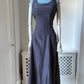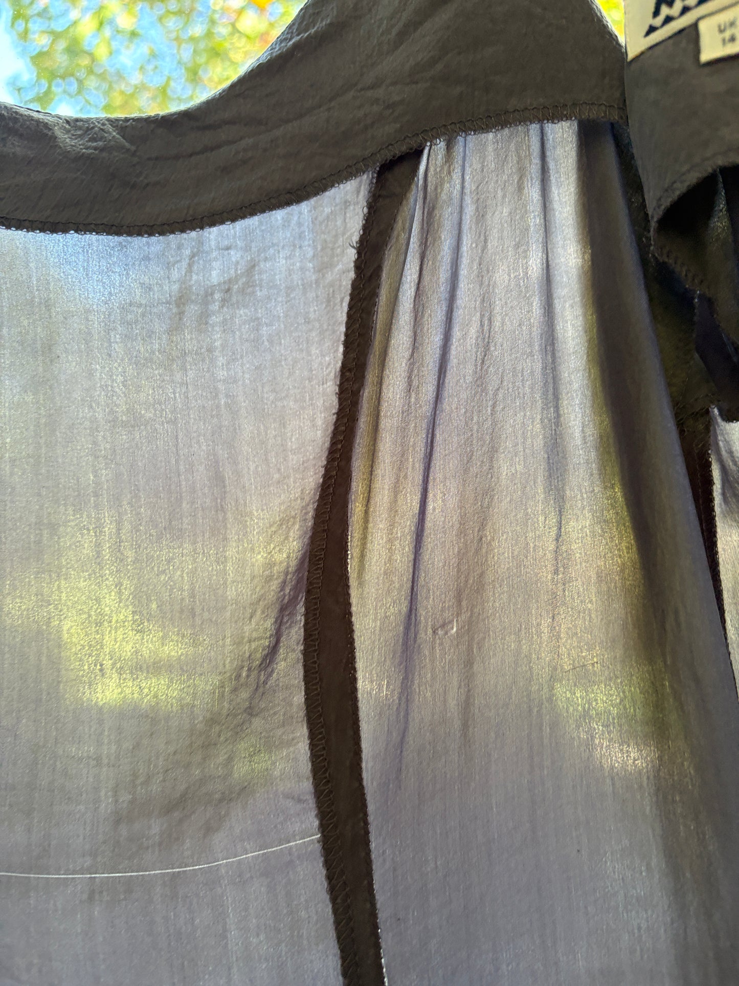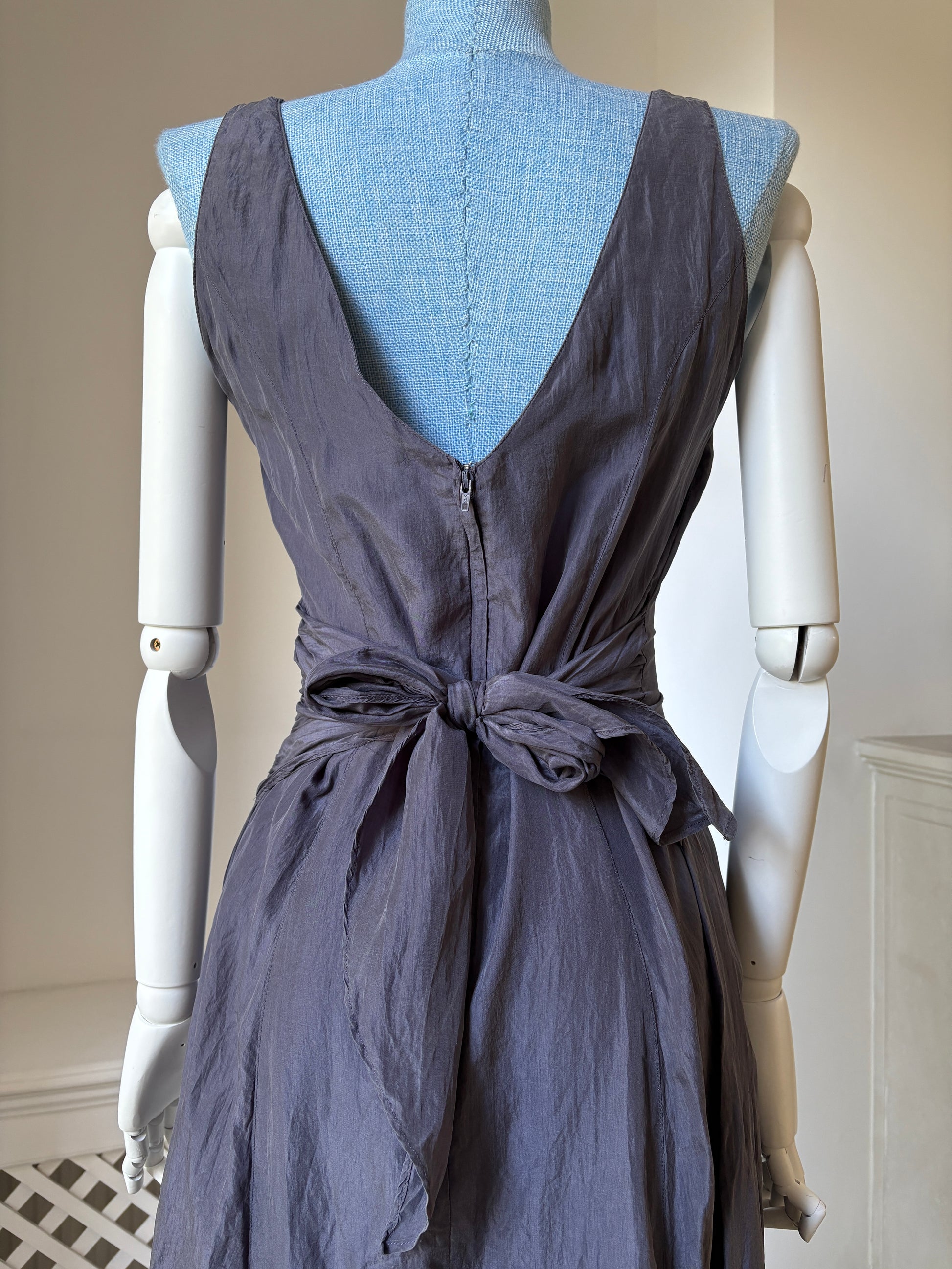 A super chic 1990s Monsoon piece, crafted from buttery-soft 100% silk. It features a scoop neck, wide straps, and panel seams down the front. The skirt is full and gathered, with a large sash belt to cinch at the back. It secures with a hidden zip at the back. Light as air and beautifully floaty.