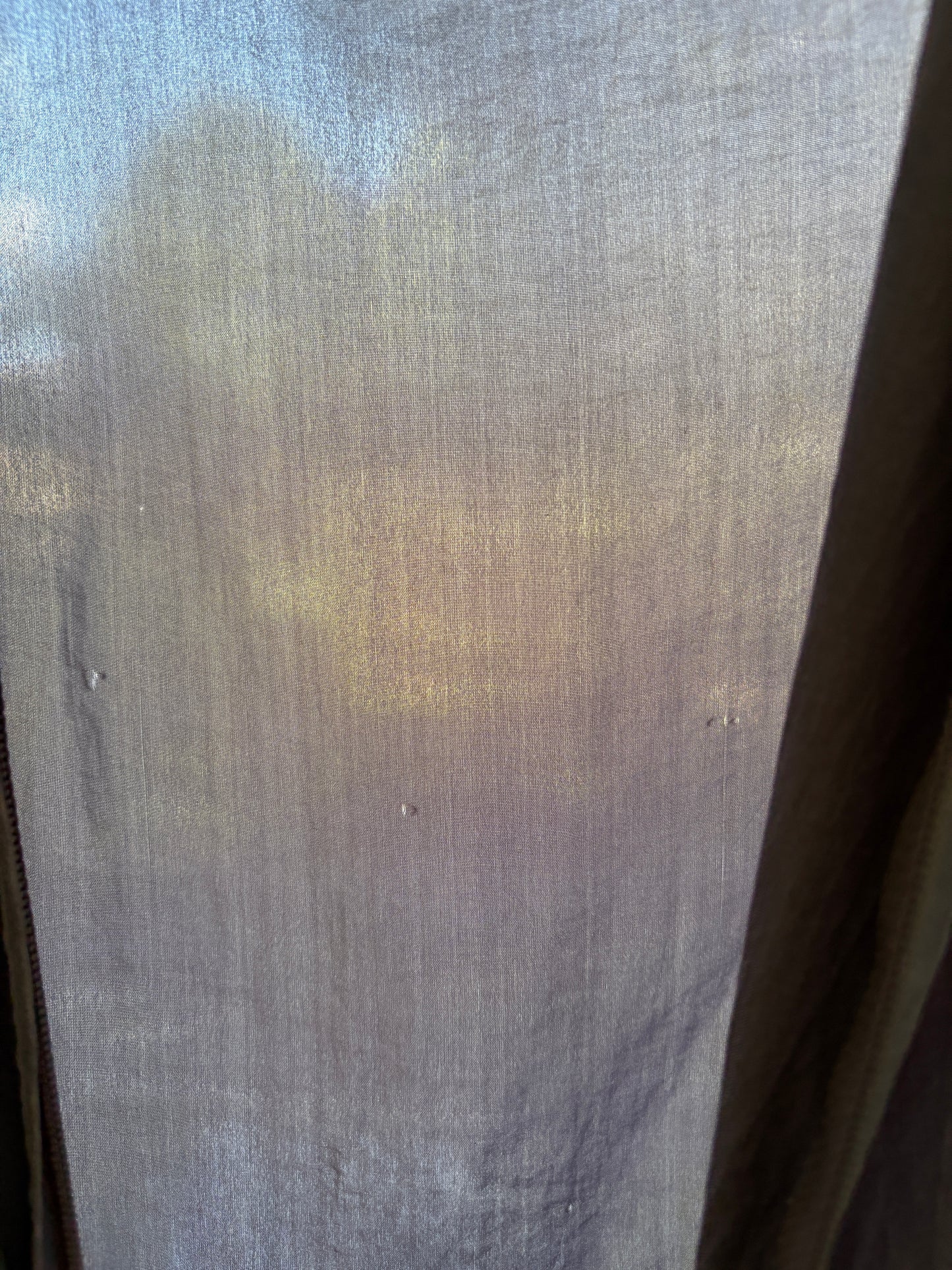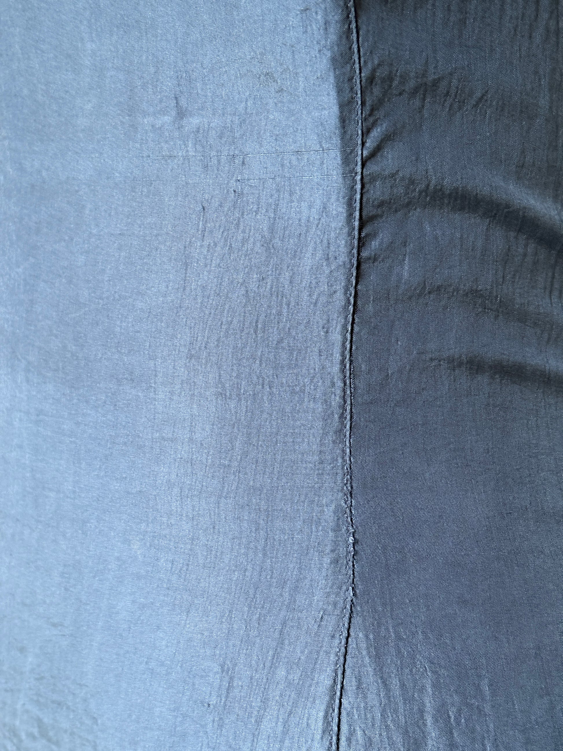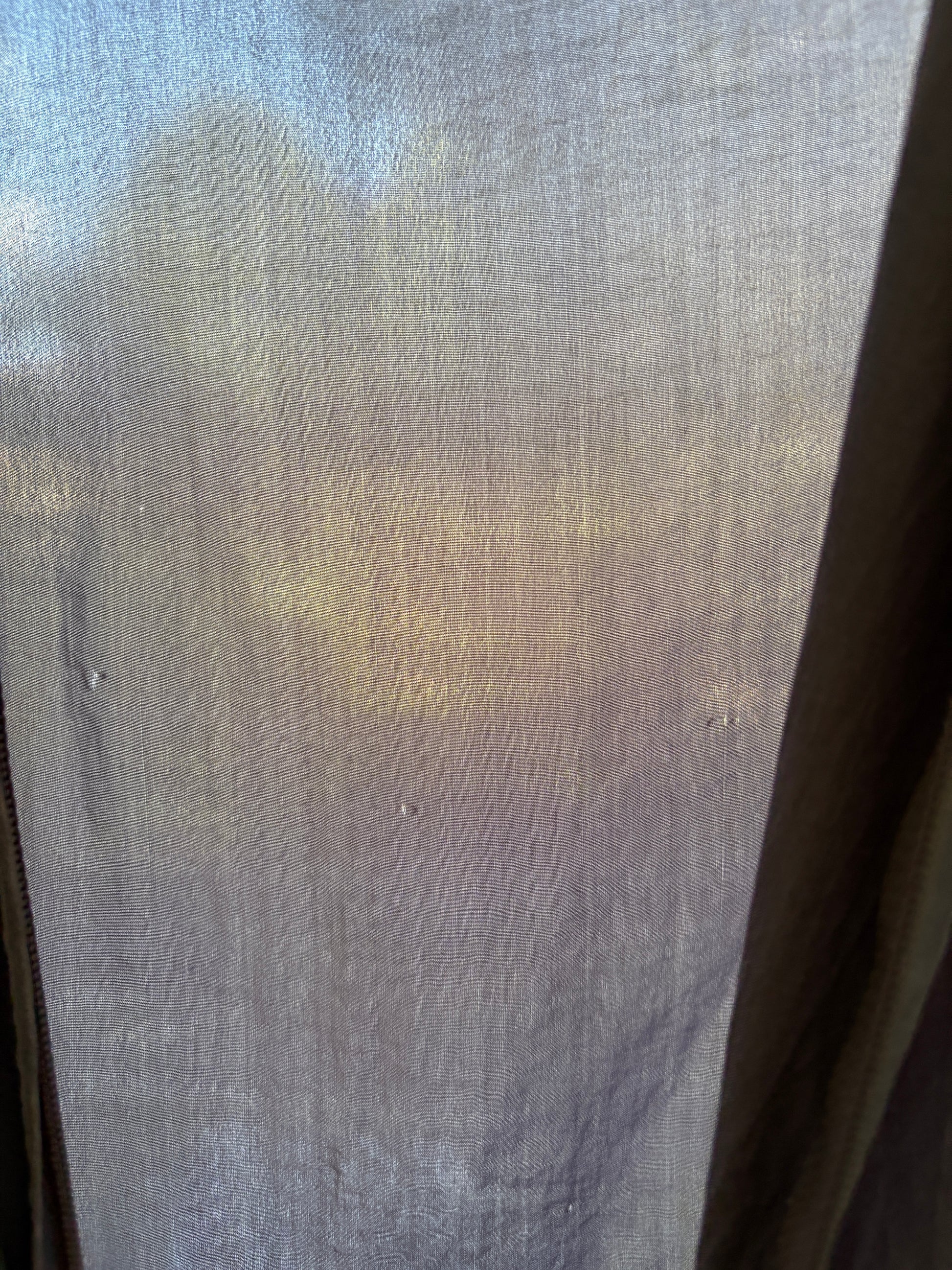 Condition: Very good. The silk shows signs of wear and washing over the years, with some dimpling and areas of fragility visible when held up to the window (as seen in photos 9-11). The hem has some scattered stains and a few small holes that have not shifted with treatment, all shown in the photos 12-16.