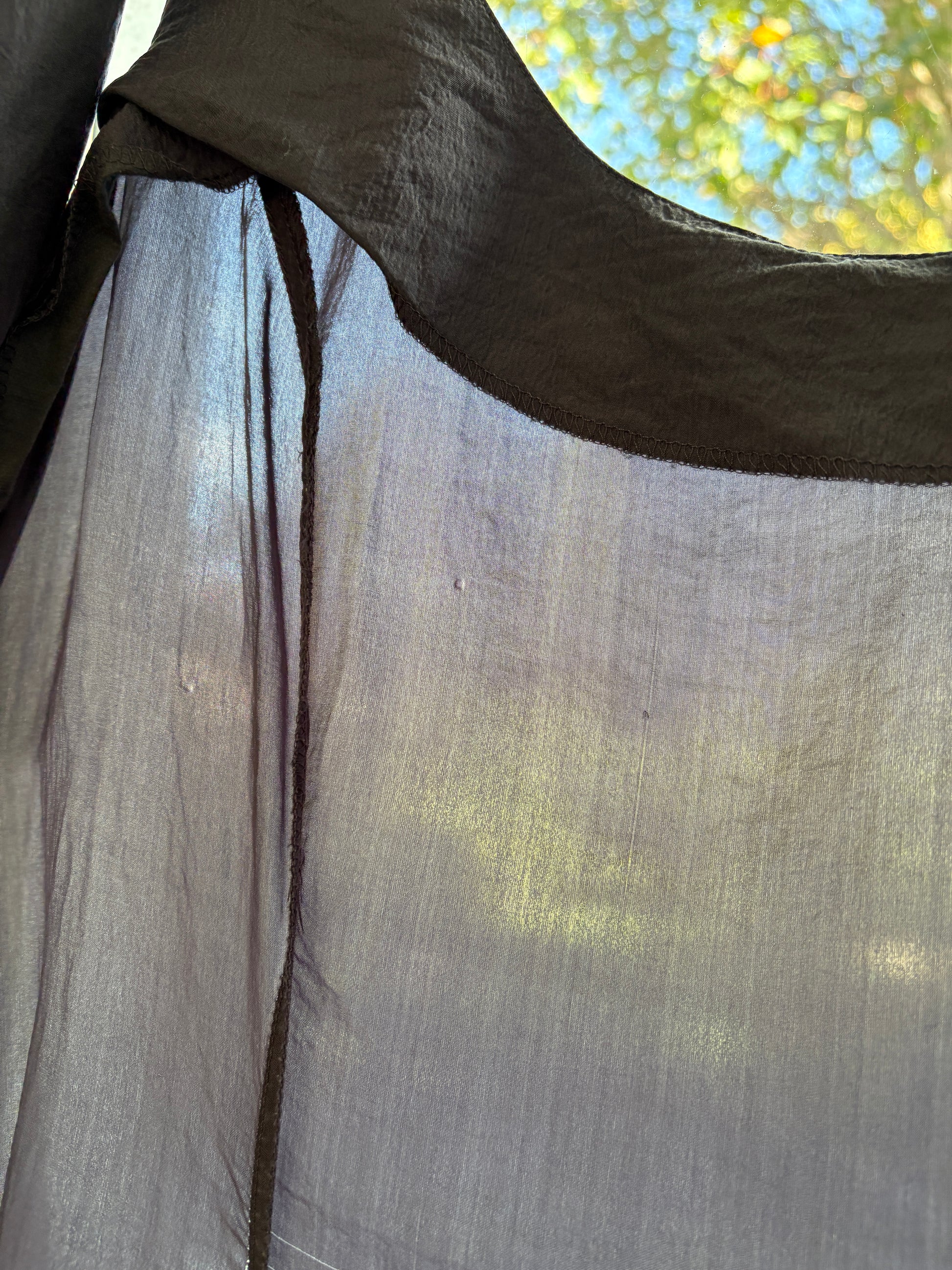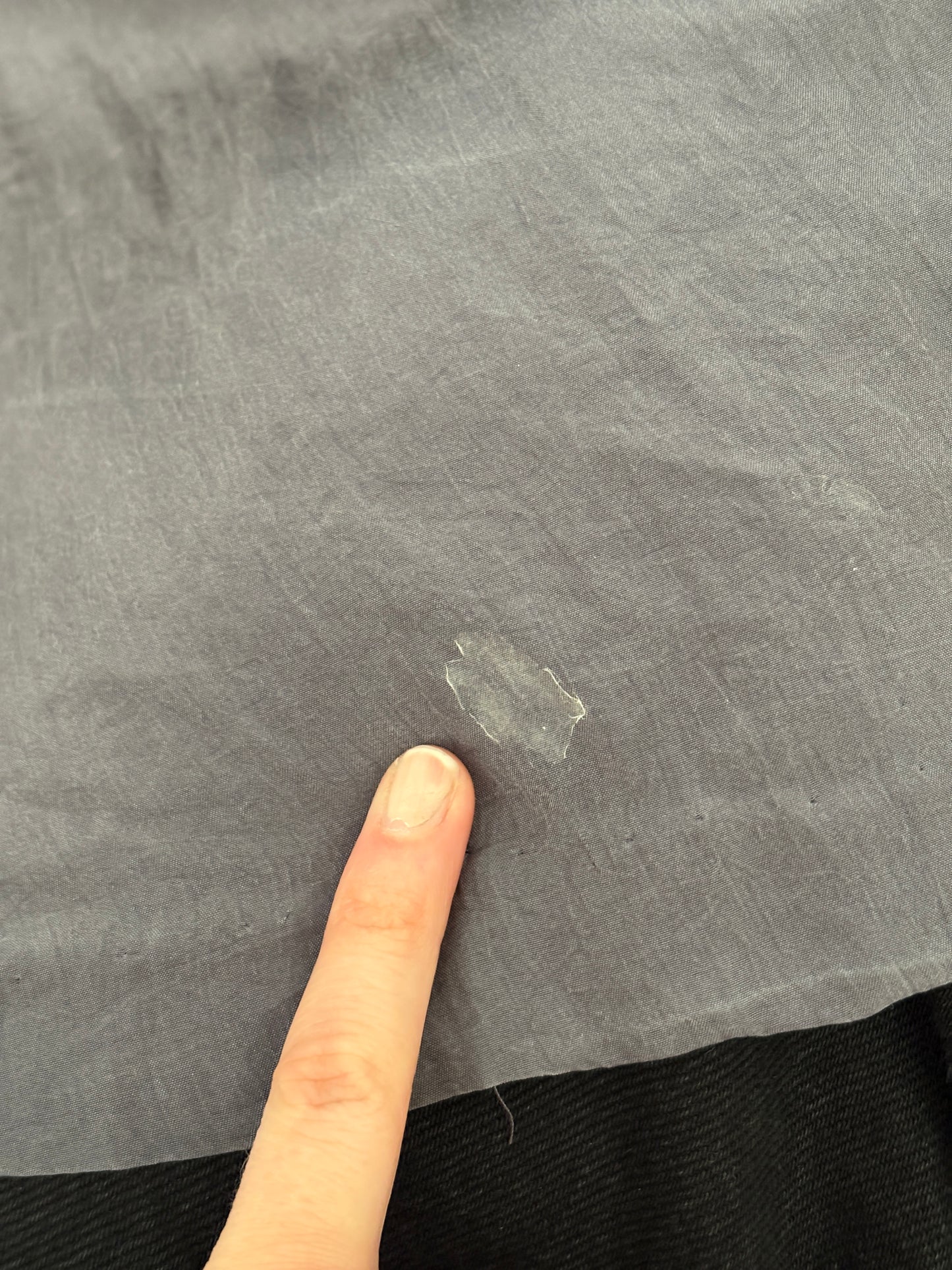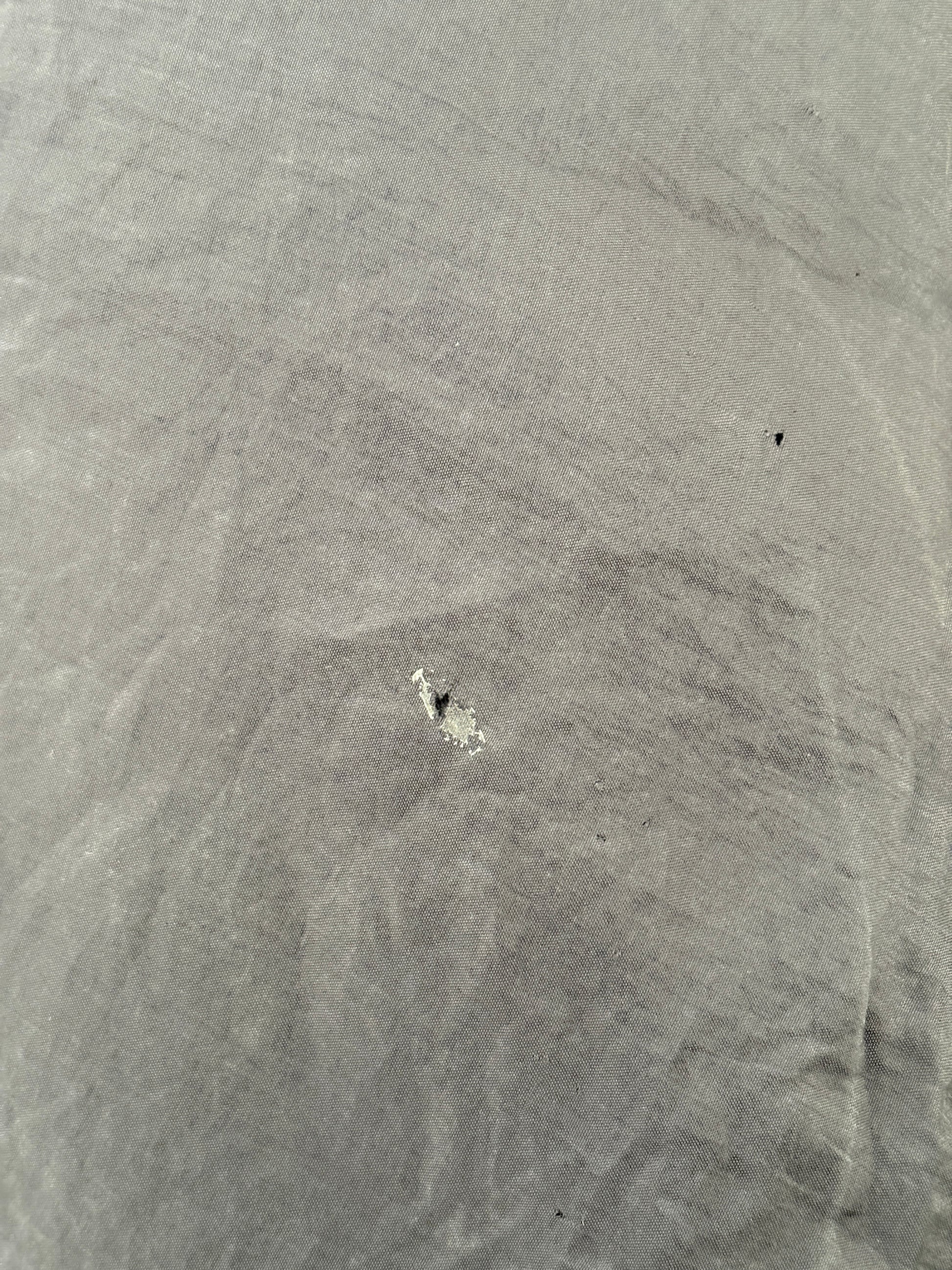 Condition: Very good. The silk shows signs of wear and washing over the years, with some dimpling and areas of fragility visible when held up to the window (as seen in photos 9-11). The hem has some scattered stains and a few small holes that have not shifted with treatment, all shown in the photos 12-16.