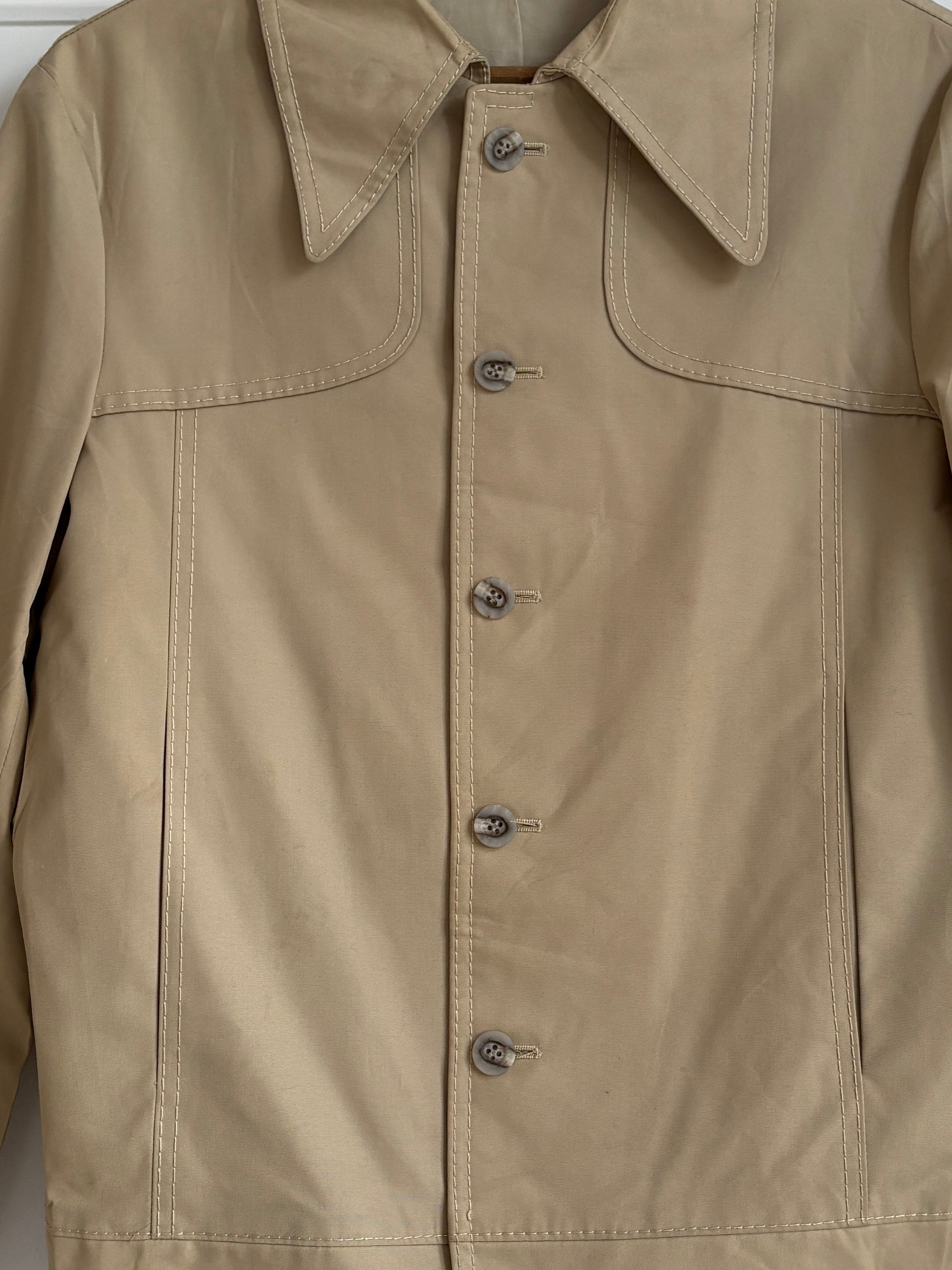 A lovely 1970s cropped jacket from Trevia, cut in a trench inspired style. It is a nice sandy beige shade with a sharp dagger collar, contrast white stitching, and a button-up front with horn-style buttons. The silhouette is slightly boxy with two waist pockets, and it’s fully lined. Made from a polyester–cotton blend.