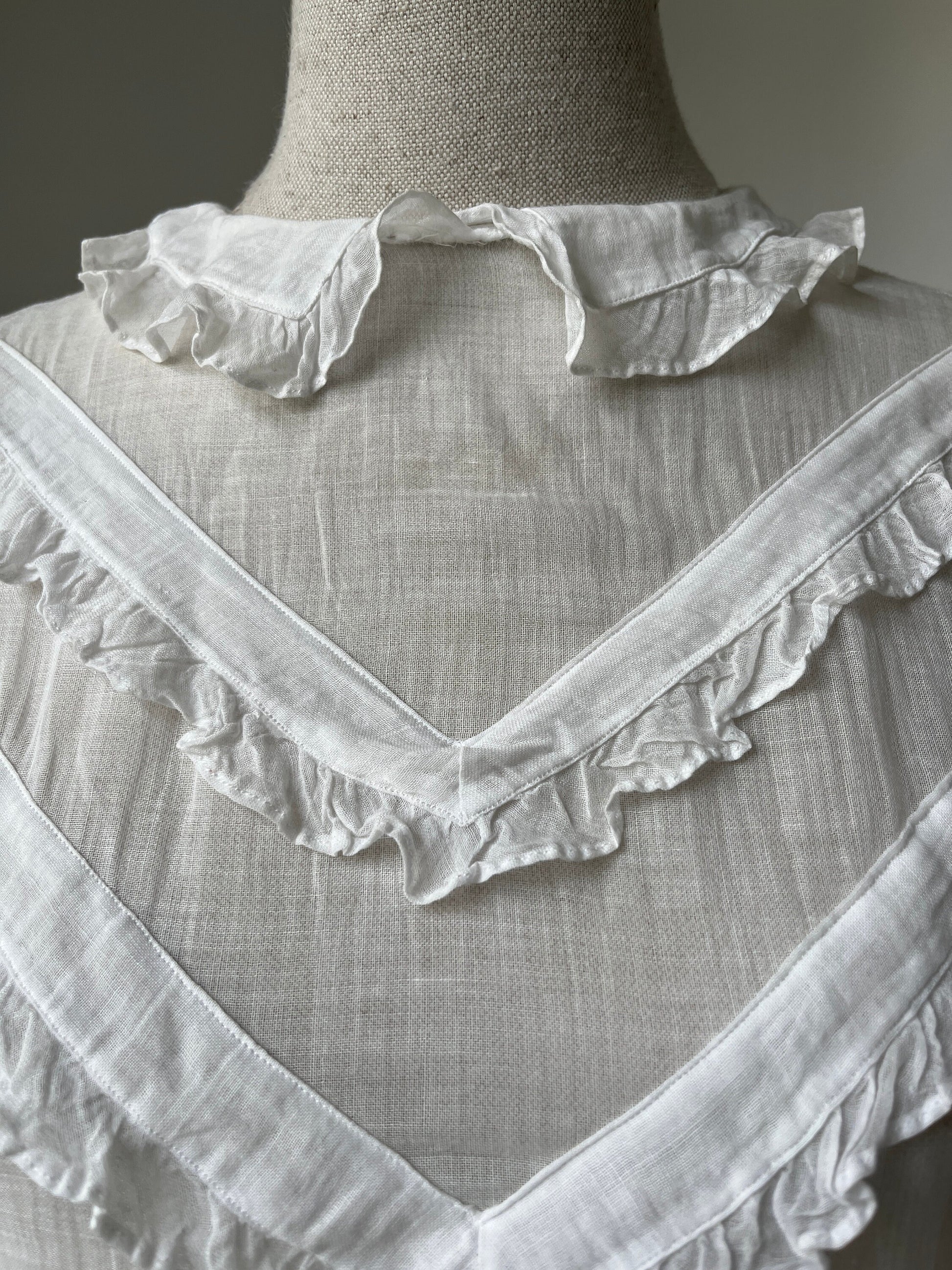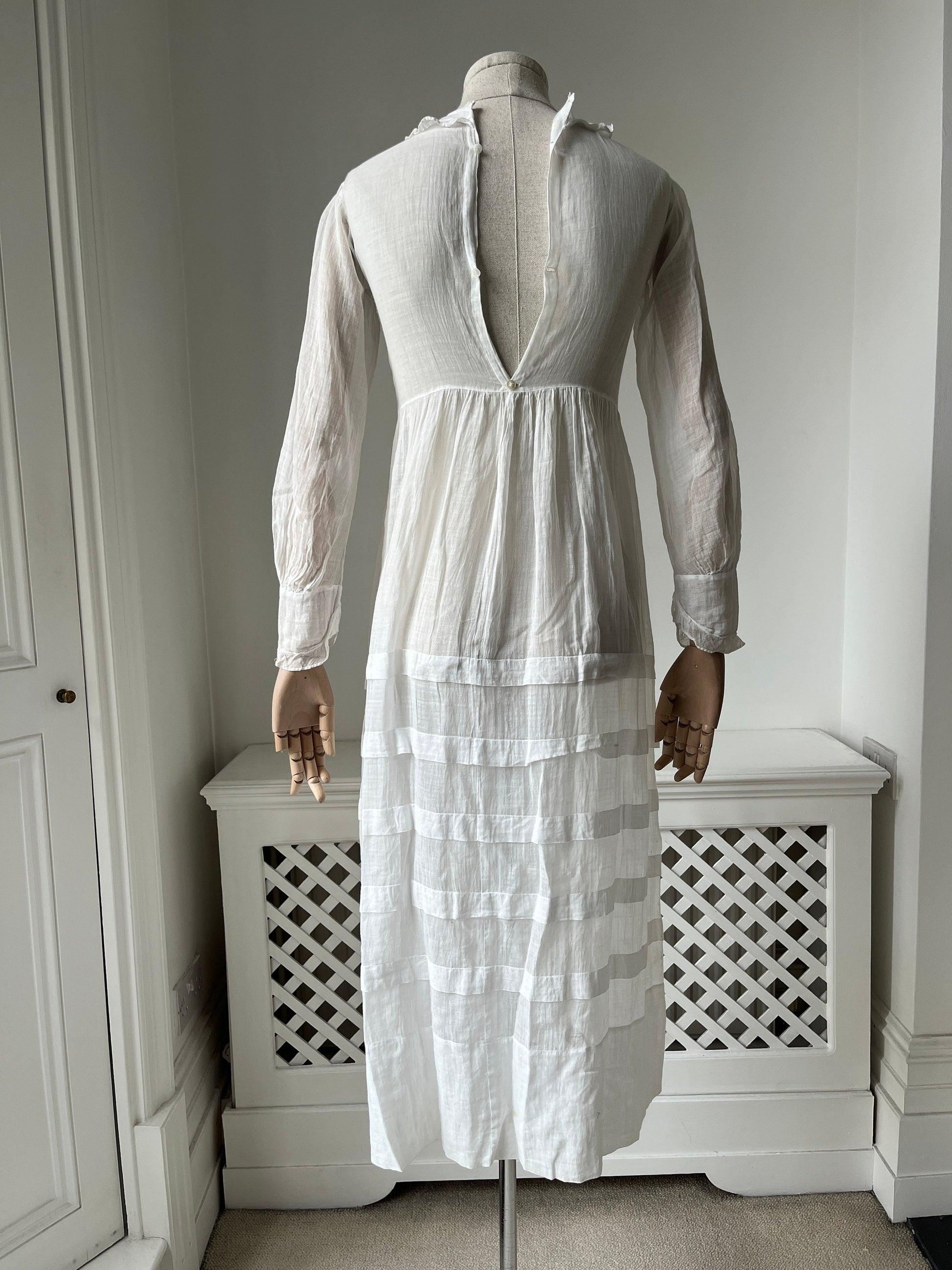 This delicate and charming Edwardian dress was made for a teen girl and is crafted from the softest, most sheer lawn cotton—pure heaven to the touch! The full-length dress features a high bust line, a finely pleated skirt, and lovely tiers to the skirt. The bust has almost chevron-style frills, and the neck is adorned with a frilled collar for a truly classic Edwardian touch. It secures at the back with three replaced buttons, and it’s a beautifully crafted piece of fashion history.