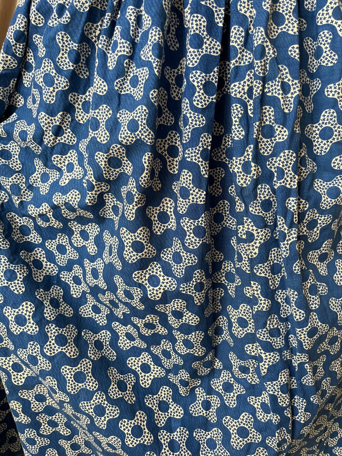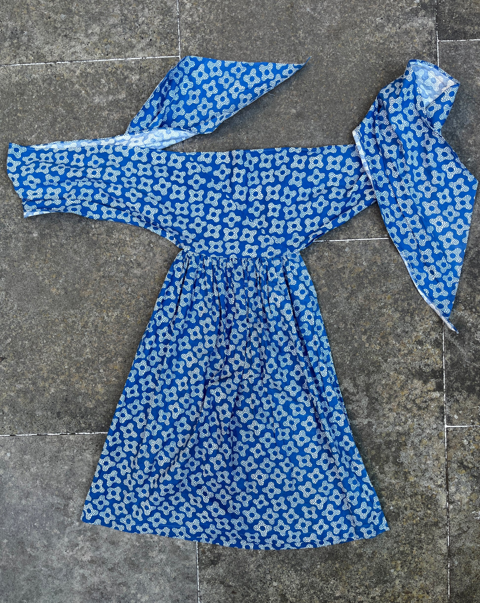 Quite possibly the most unusual piece I have ever found. Is it a skirt? A strapless dress? An apron? Who knows! This unique item is made from vibrant, true blue cotton with a 1940s-style print. It features a wide waistband/bodice with long, winged straps and a pleated A-line skirt. The CC41 label confirms its wartime era, and it fastens with a chunky metal side zip. The waist is clearly marked, but the top could be worn as an ultra-high waistband or a bodice, depending on how you style it.